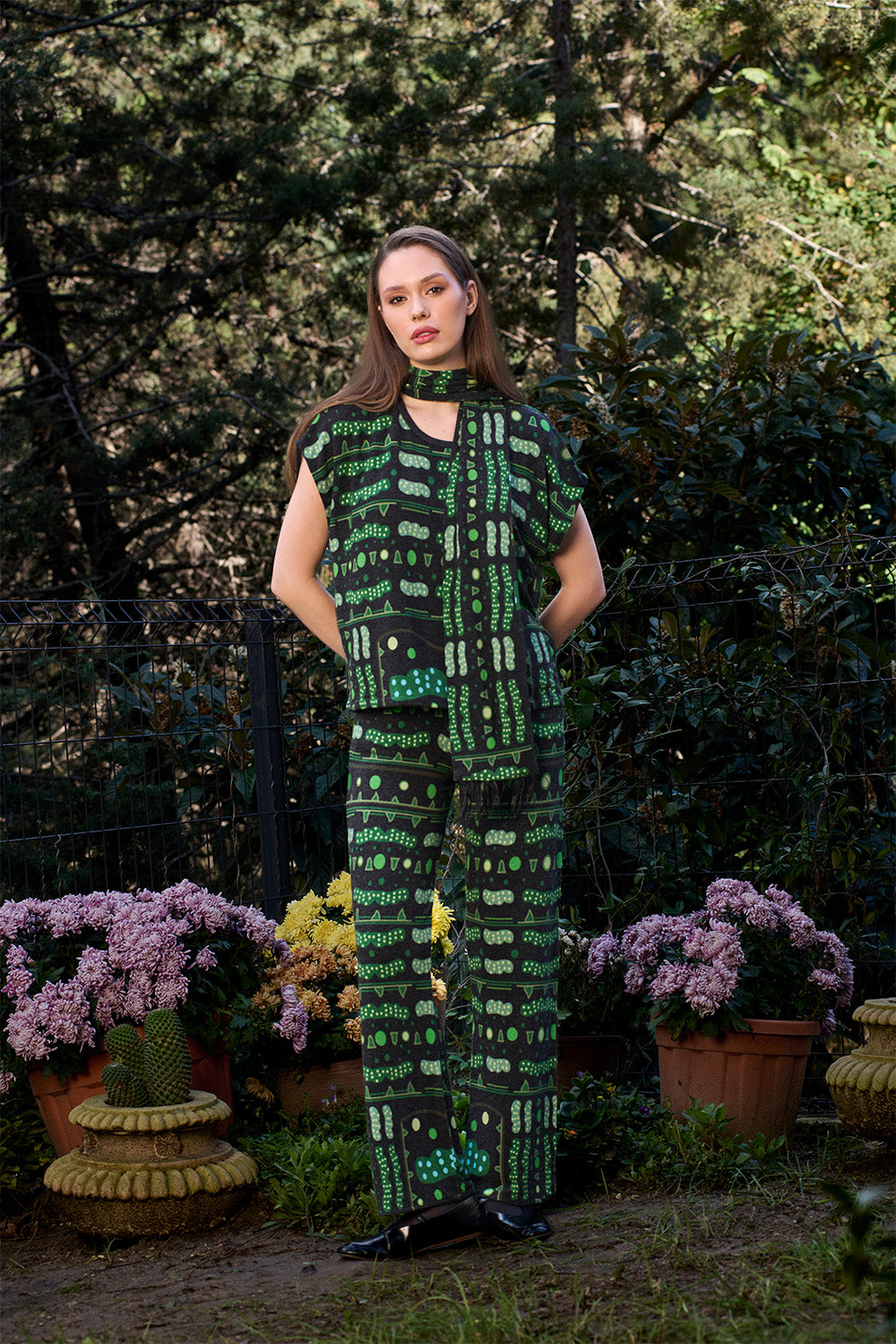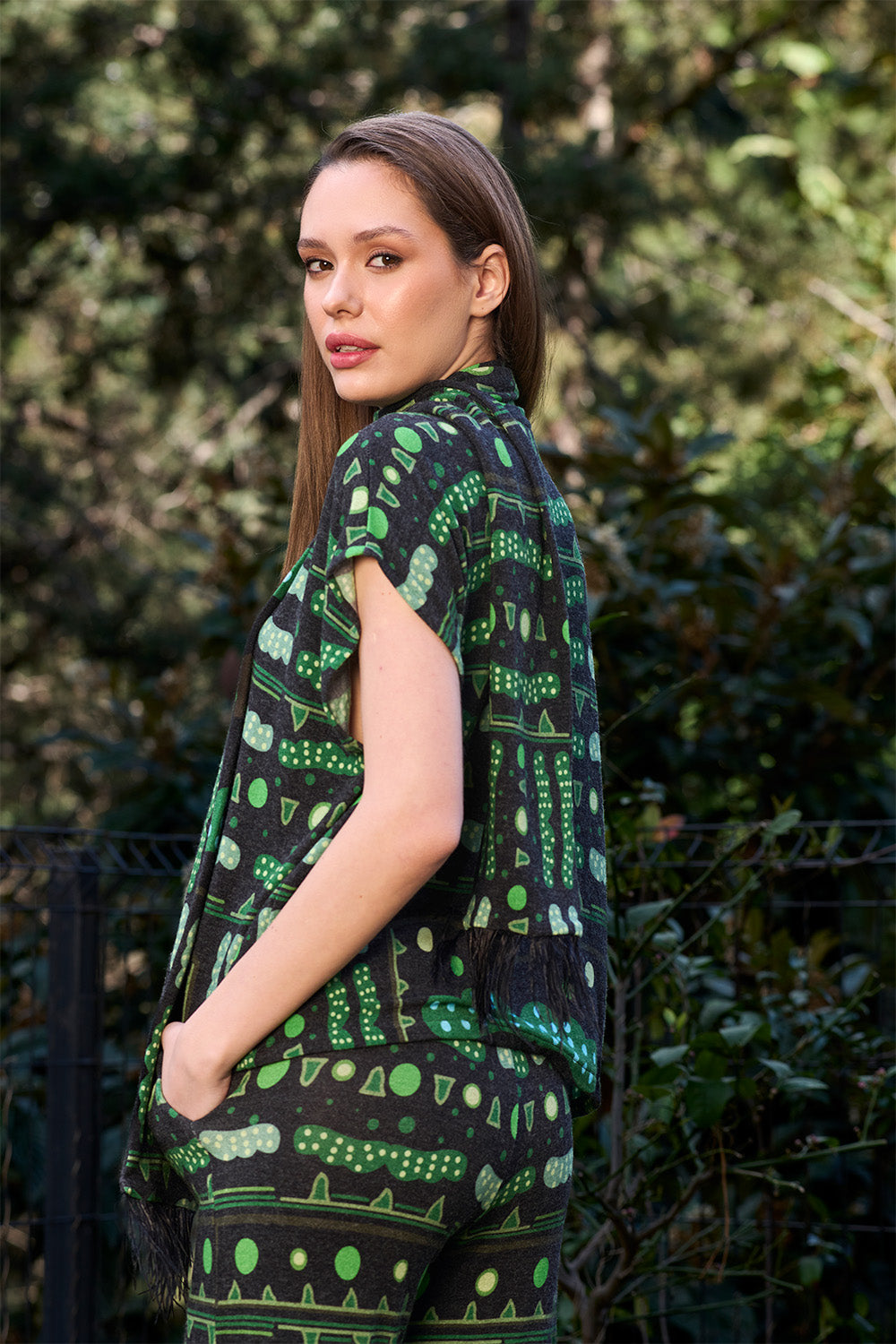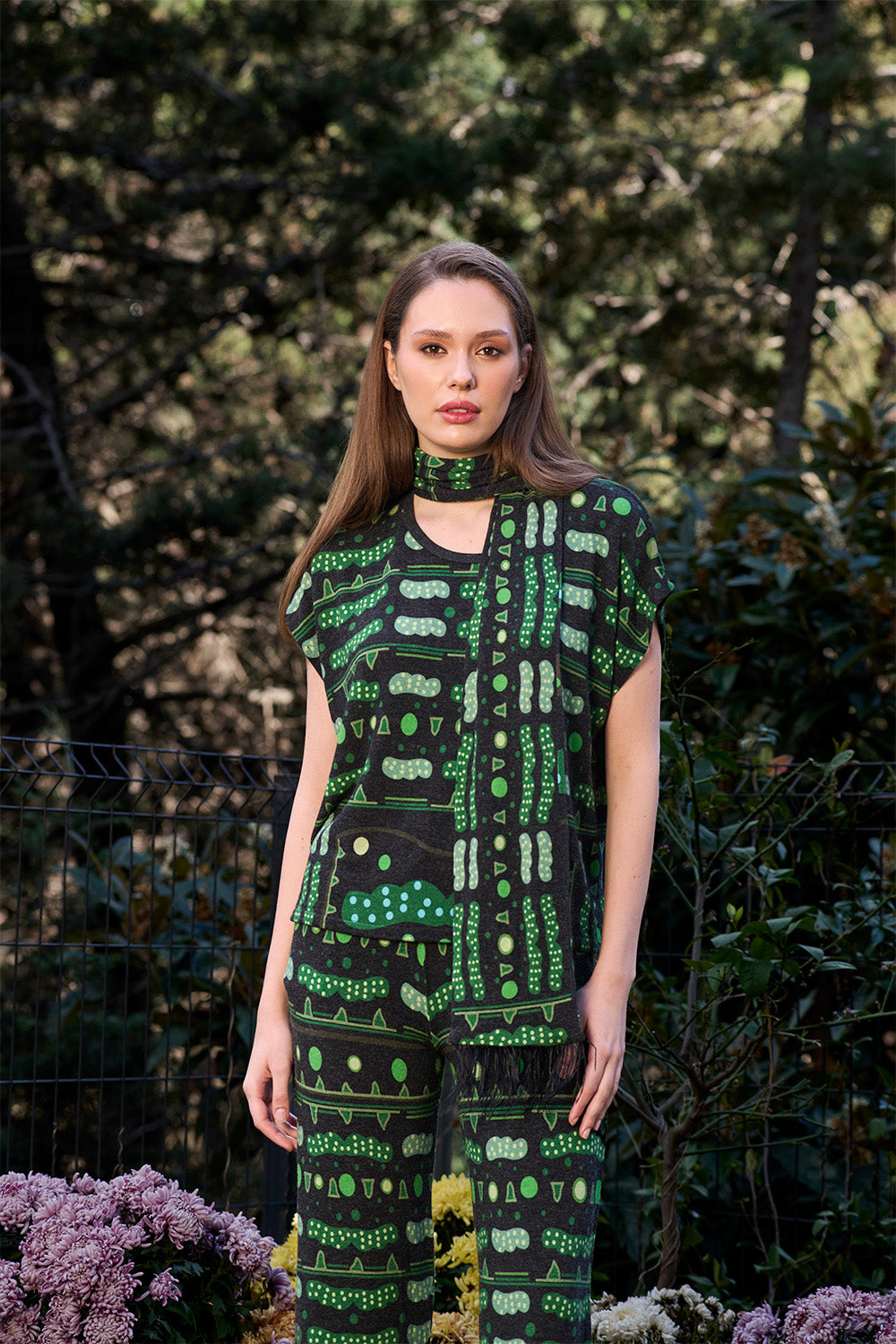 Yeşil Bulut Desenli Fular Detaylı Bluz