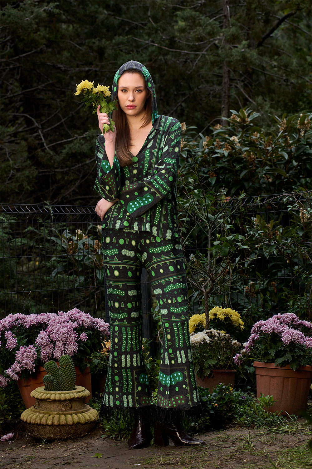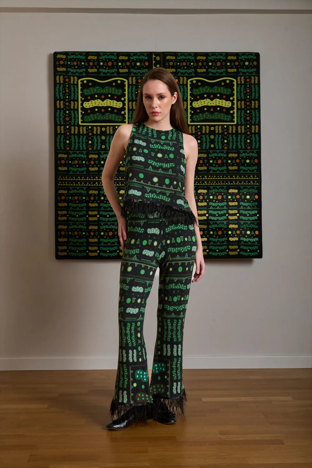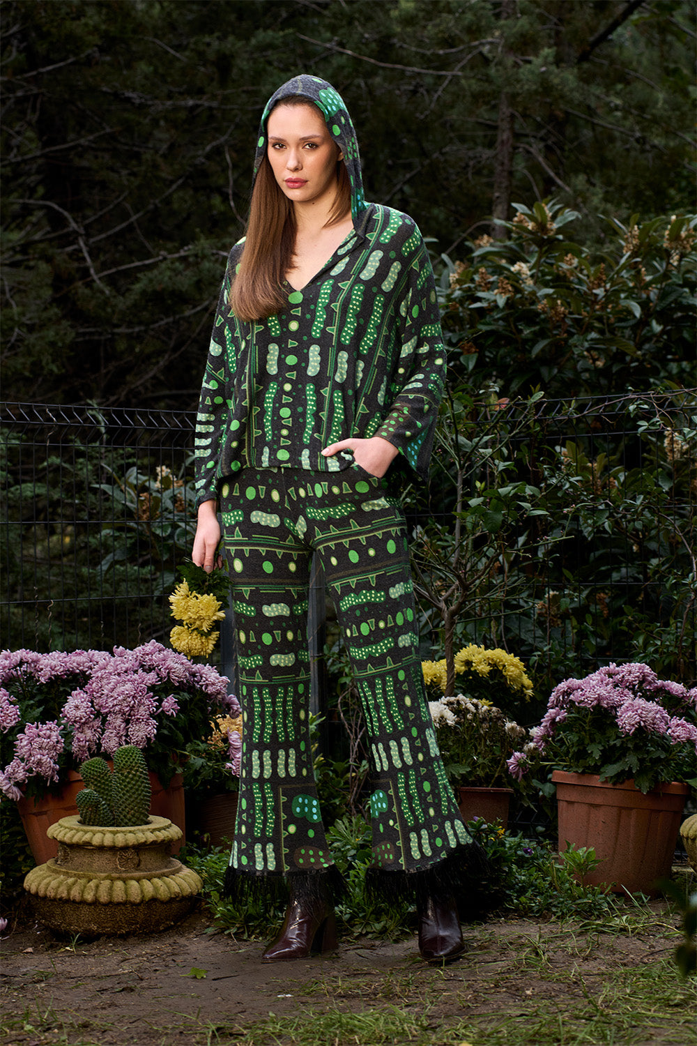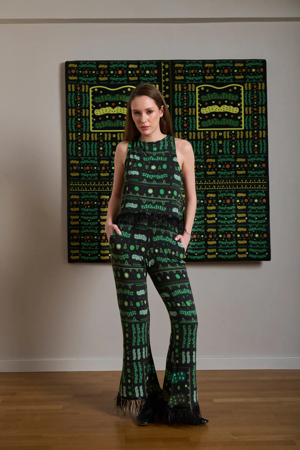 Desenler sanatçı Defne Camcıoğlu'nun resimlerden oluşmuştur,%82 Viskon, %13 Akrilik, %5 Elastan içeren örme bir kumaştır,Kumaş fırçalı/tüylü sıcak bir tuşeye sahiptir,Desenler dijital baskı yöntemi ile basılmıştır,Ürünler likralı, esnek kumaş yapısının uygunluğu gereği birleşik beden olarak üretilmiştir; S/M: 36-38 M/L: 38-40 bedenlerini karşılamaktadır,Yüksek bel ve lastikli olan pantolon ucunda bulunan tüy detayları ile şık bir görünüm sunmaktadır.