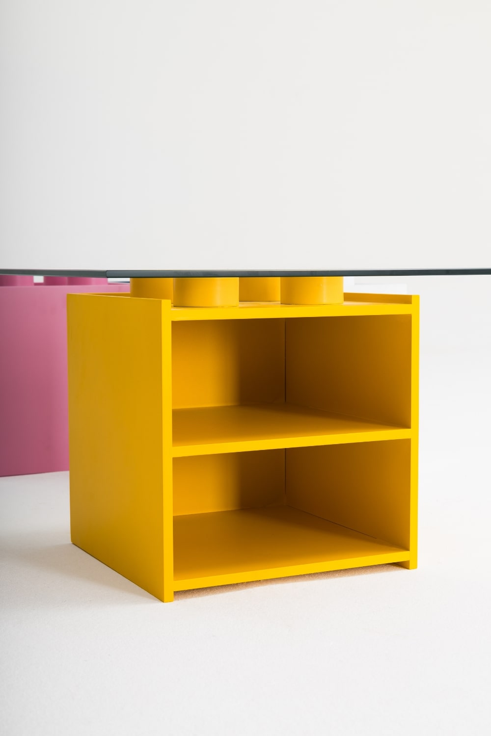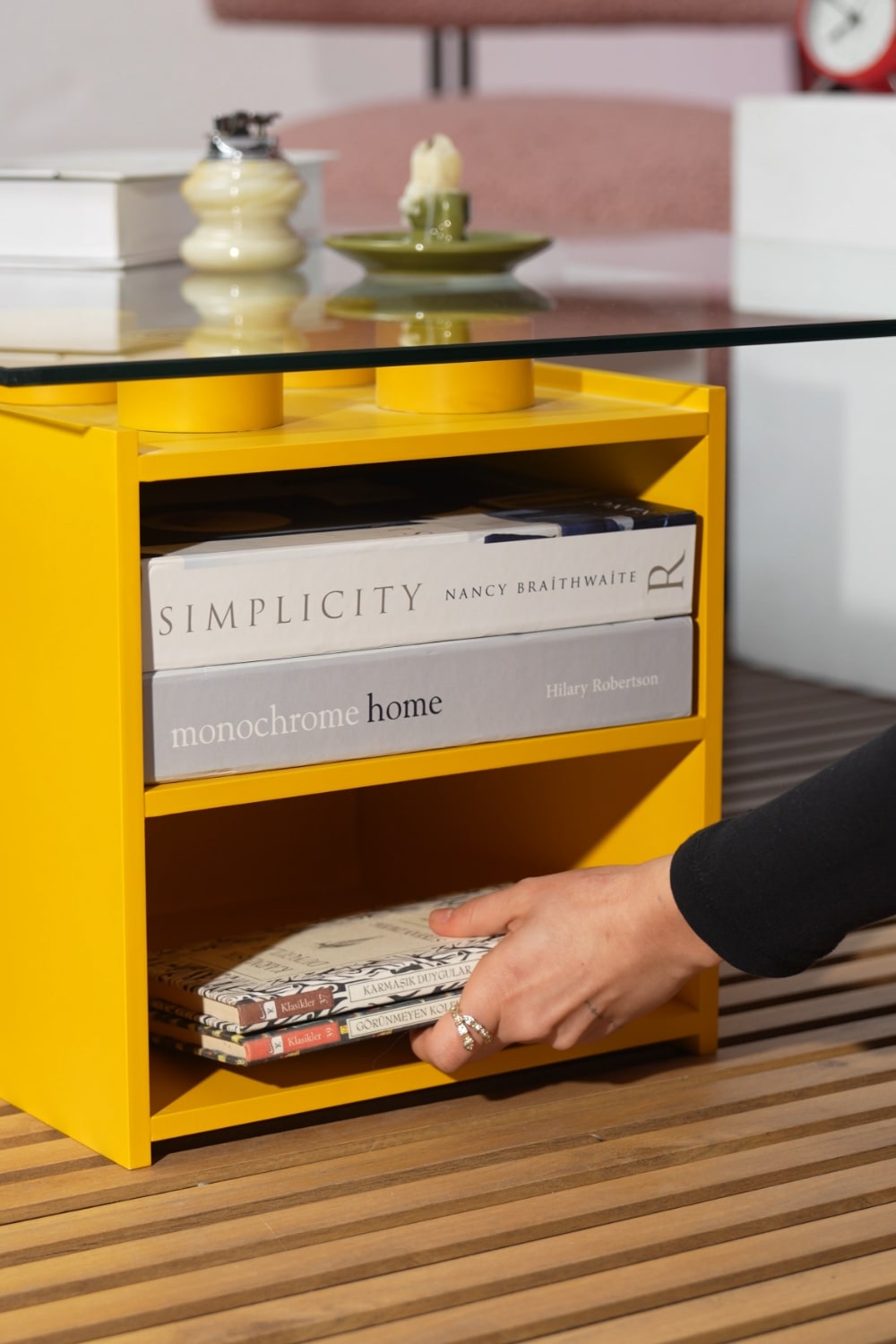Dört adet 30x30x30 cm ölçülerindeki modüler küp ve 110×70 cm ölçülerindeki temperli cam yüzeyle oluşturulan bu kompozisyon; fonksiyonel düşüncenin yalın estetikle buluştuğu bir denge noktasıdır. Ham MDF üzerine uygulanan lake boya, yüzeylerde hem derinlik hem de zarafet yaratır.