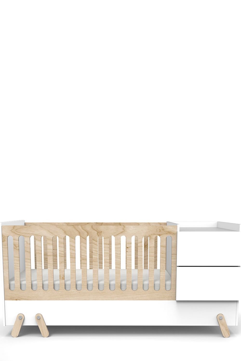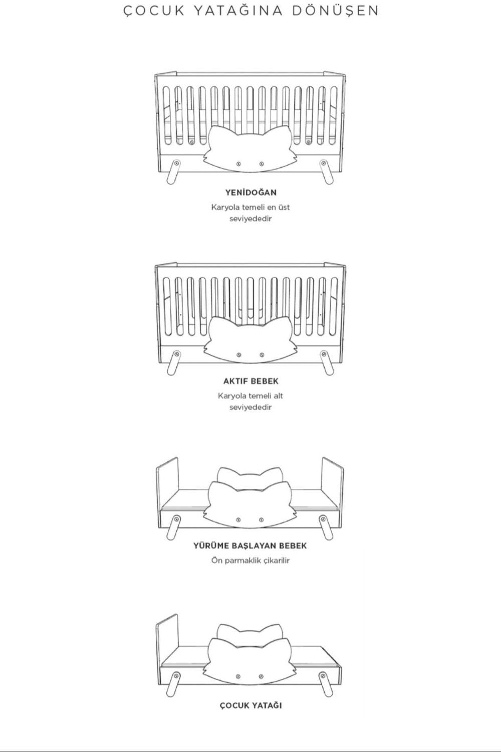 Fox koleksiyonundan, küçük alanlar için hazırlanmış kompak bir çözümdür. Çekmecesi ve alt değiştirmesiyle beraber sunulan beşik dönüşüm kiti ile 90×190 cm yatağa dönüştürülür.