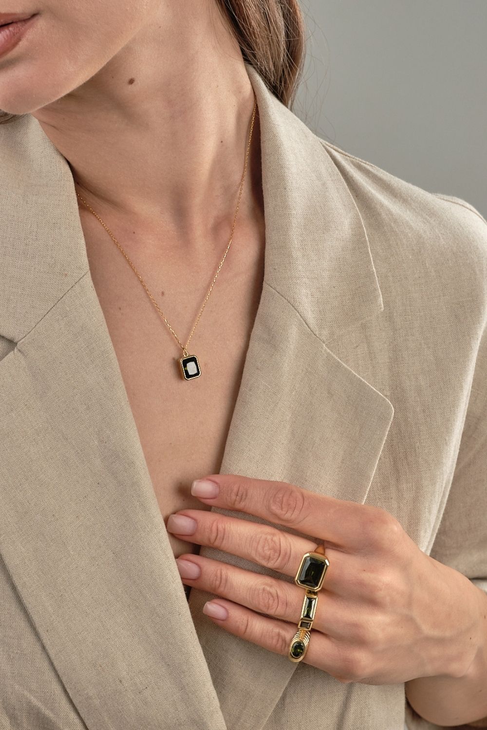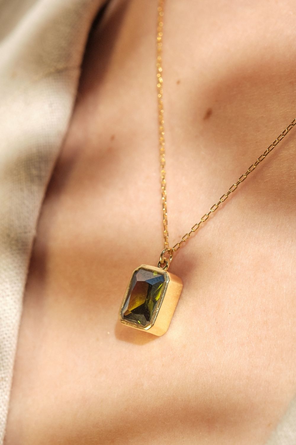 Dikdörtgen Haki Yeşili Kristal Taşlı Zincir Kolye