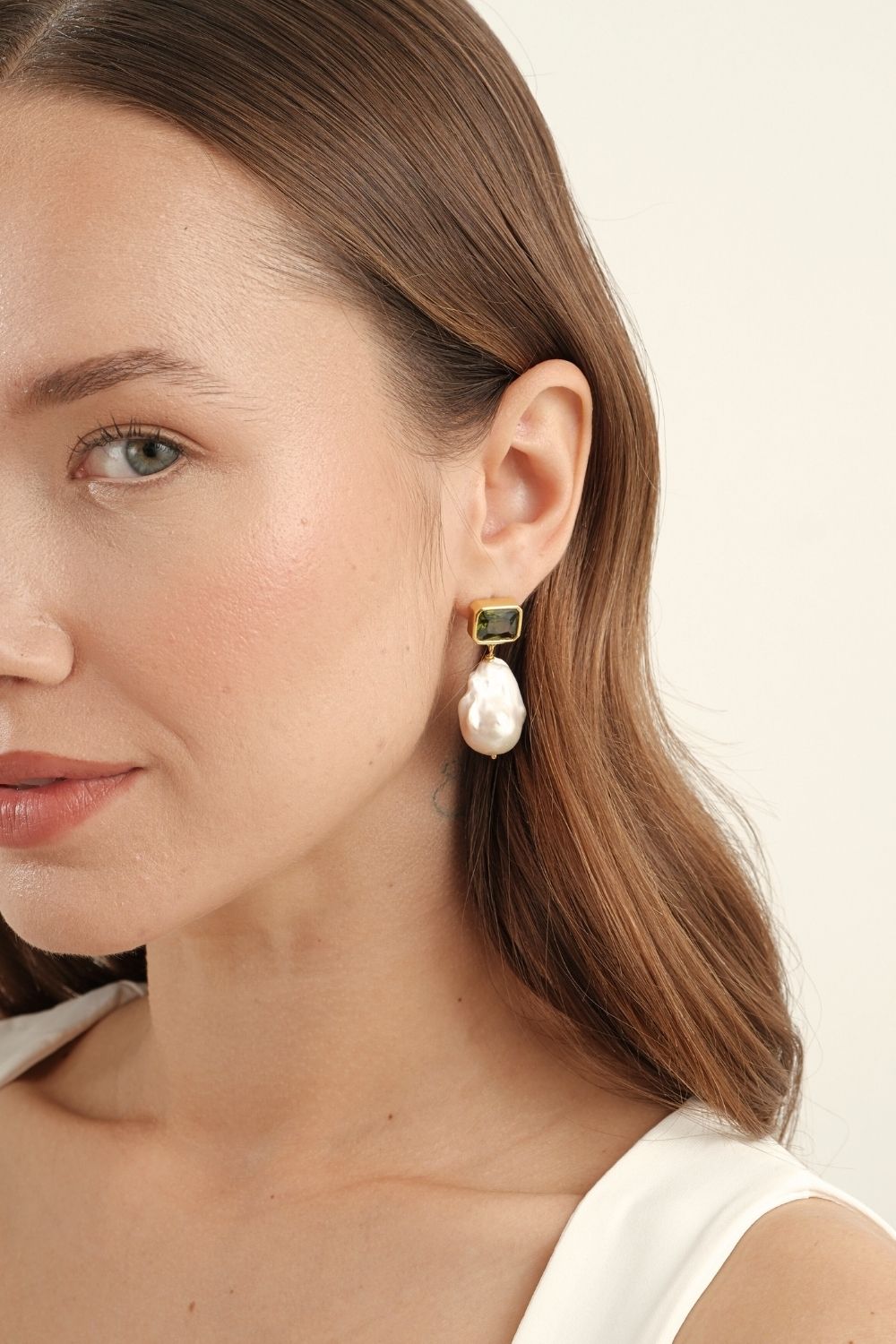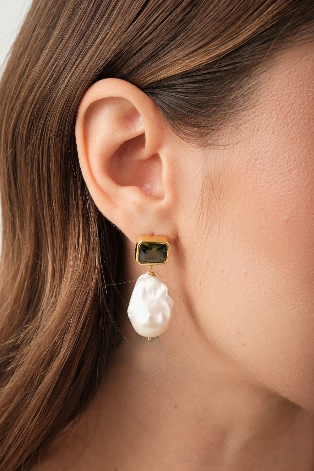 Haki Yeşili Kristal Taşlı Barok İnci Sallantılı Küpe
