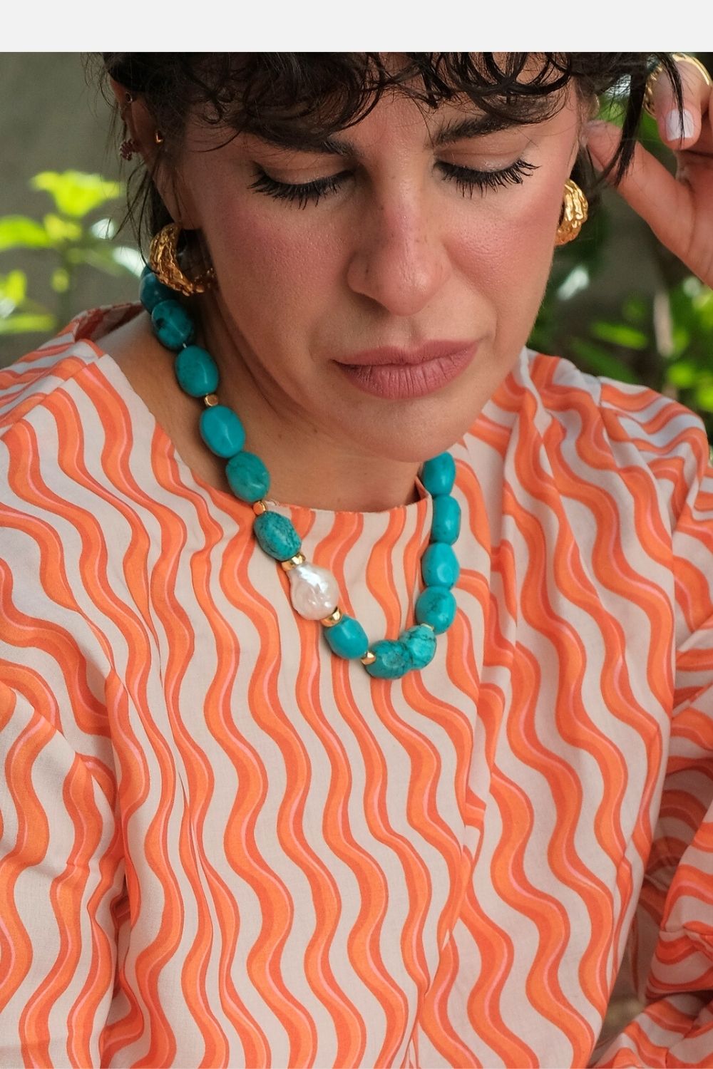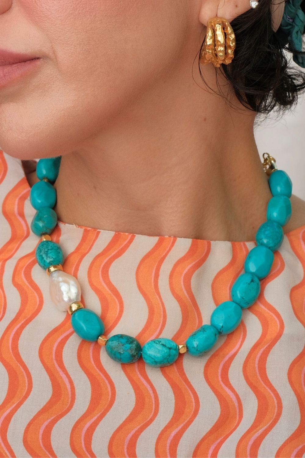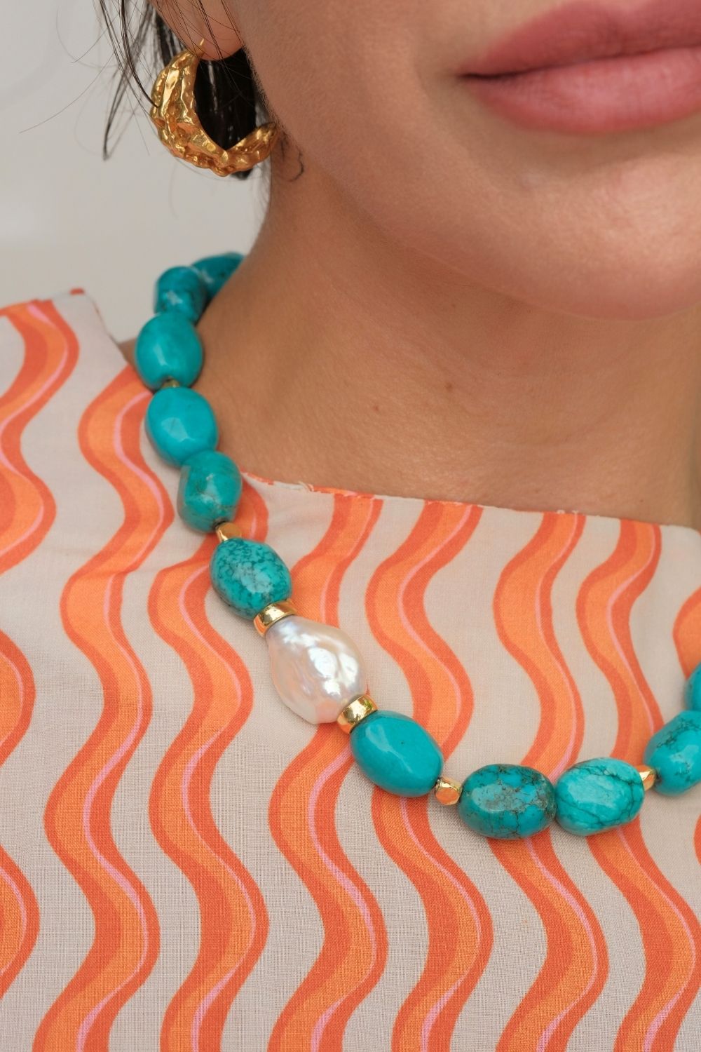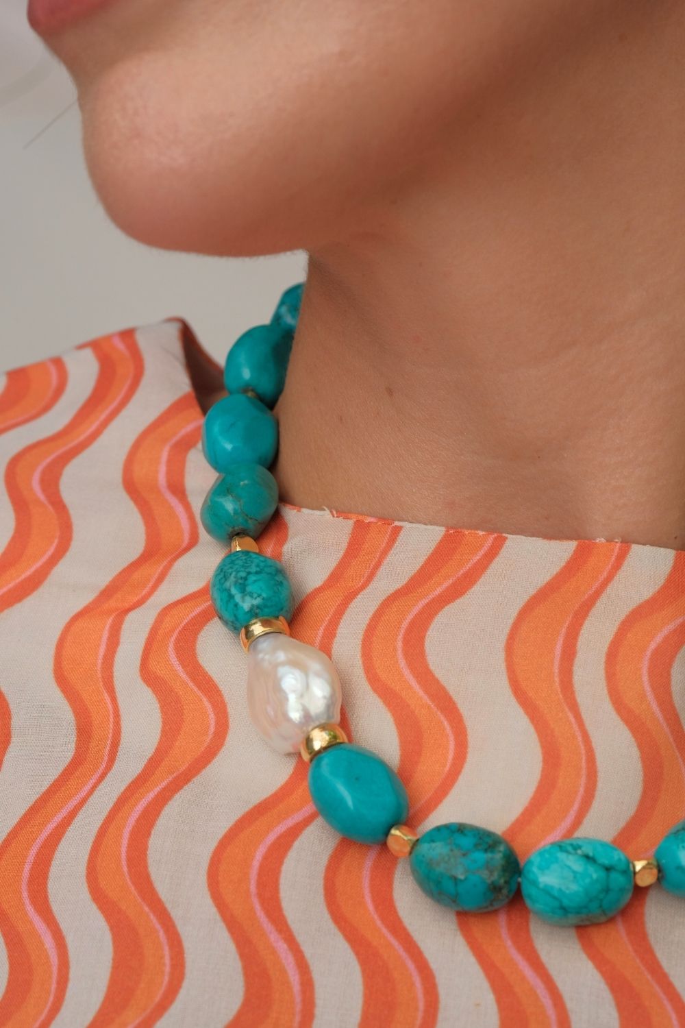 Barok İncili Turkuaz Taşlı Kolye, zarafetiyle göz kamaştıran bir tasarıma sahip. Kolye, ortasında doğal bir barok inci ve etrafında düzenli bir şekilde yerleştirilmiş oval turkuaz taşlarla şekillendirilmiştir. 925 ayar gümüşten yapılmış olan bu özel parça, sade ama şık bir tasarımla günlük şıklığınızı tamamlar. İnci ve turkuazın birleşimi, hem zarif hem de dikkat çekici bir görünüm sunar. El işçiliğiyle hazırlanan bu kolye, modern ve bohem tarzı sevenler için mükemmel bir aksesuardır. Hem günlük kullanıma hem de özel davetlere uygun olan bu kolye, Linya Jewellery’nin zarif tasarım anlayışını yansıtır.