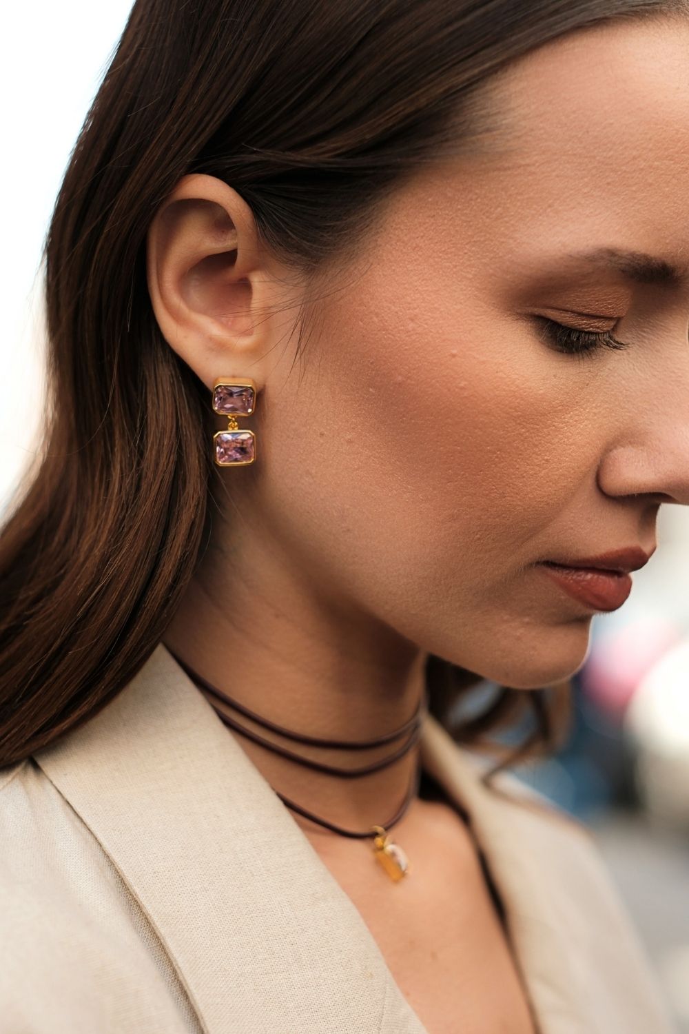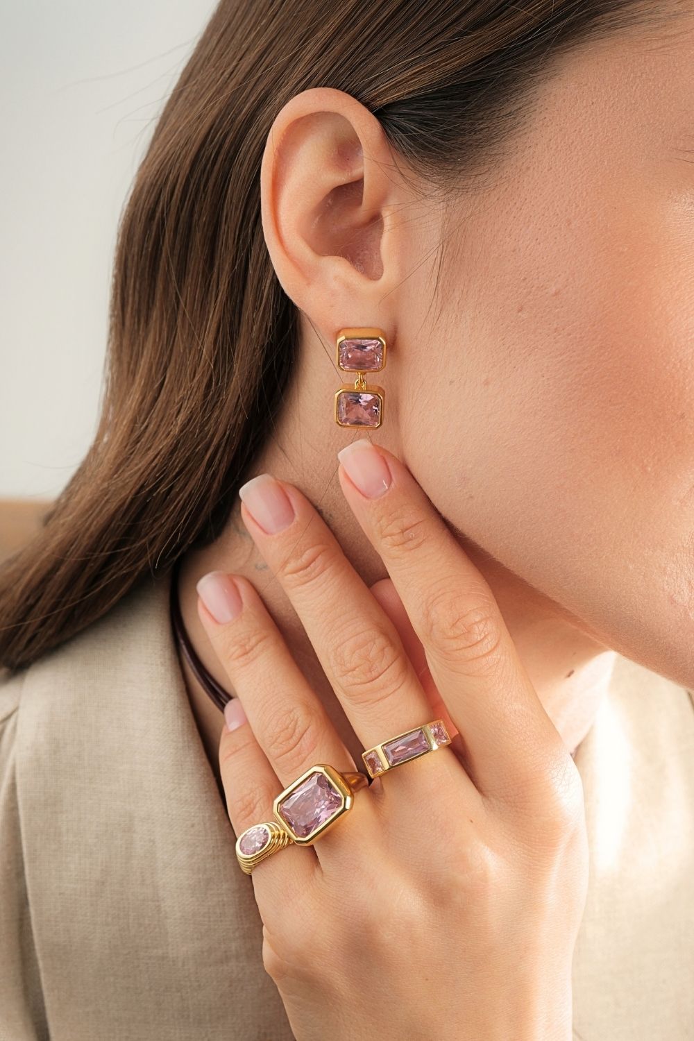 Pembe İkili Kristal Taşlı Sallantılı Küpe