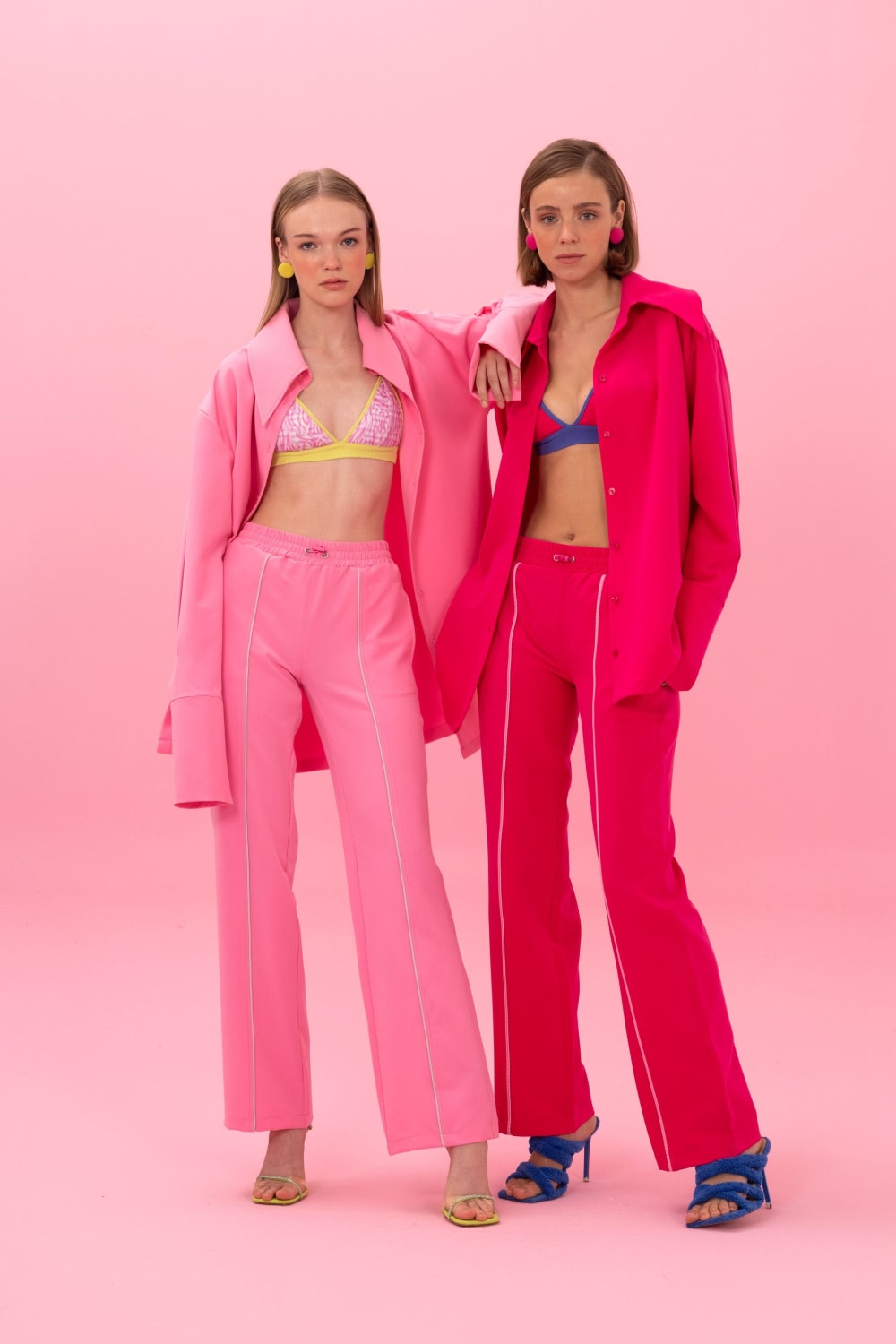 Get ready to make a statement in these shirt. Featuring a fuchsia woven material with a boxy style. You will feel comfy and luxury with the matching pant and bikini for a look that is sure to get you noticed.