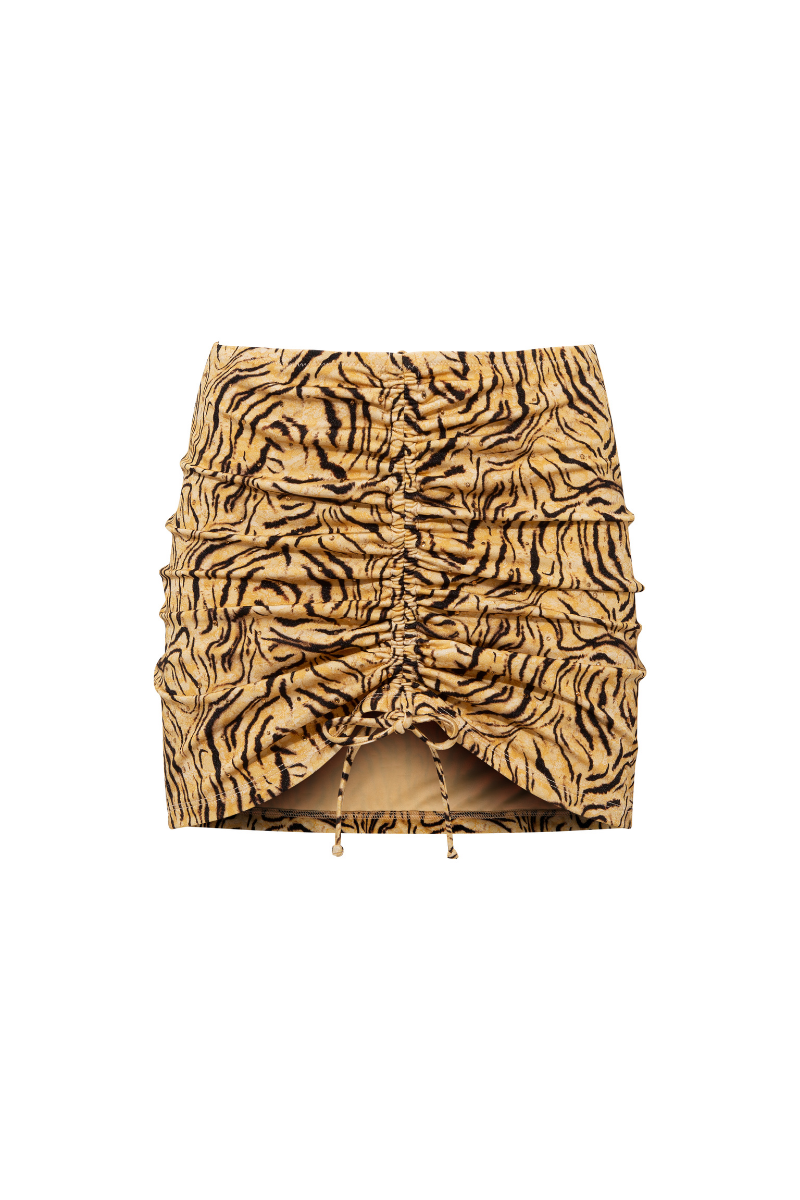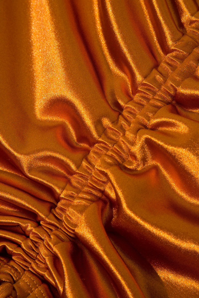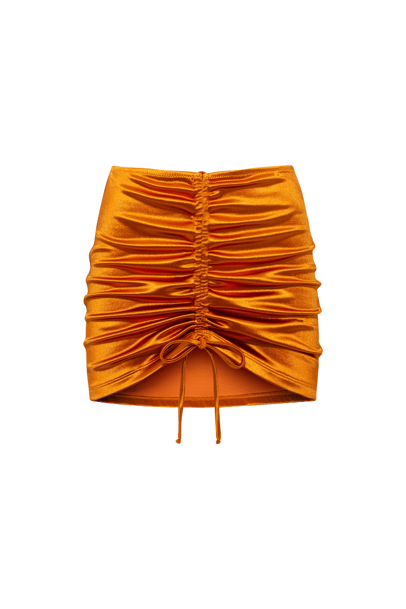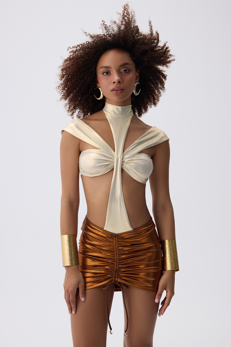Grace Etek, parlak saten dokusu ve büzgülü tasarımıyla feminen bir stil sunuyor. Mini boy kesimi, dinamik bir duruş yaratırken bronz tonunun sıcaklığı tasarıma sofistike bir hava katıyor. Hem günlük hem de özel anlar için ideal bir parça.
