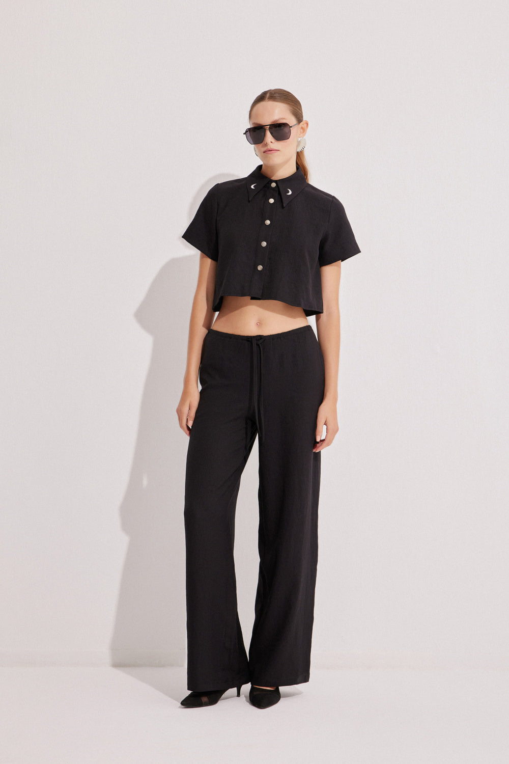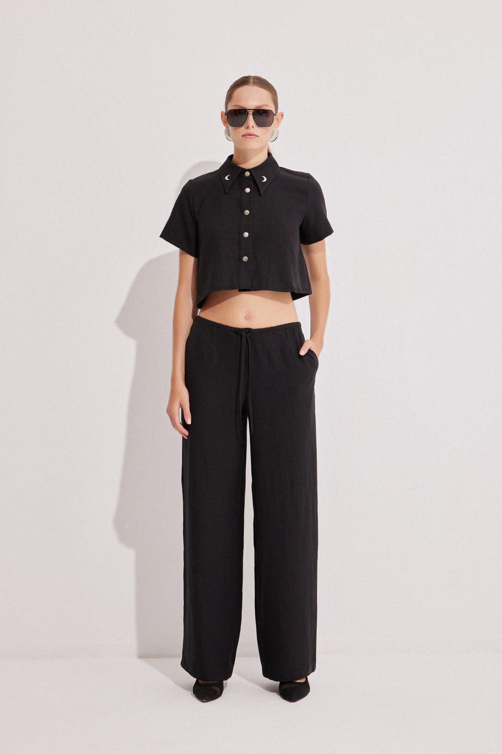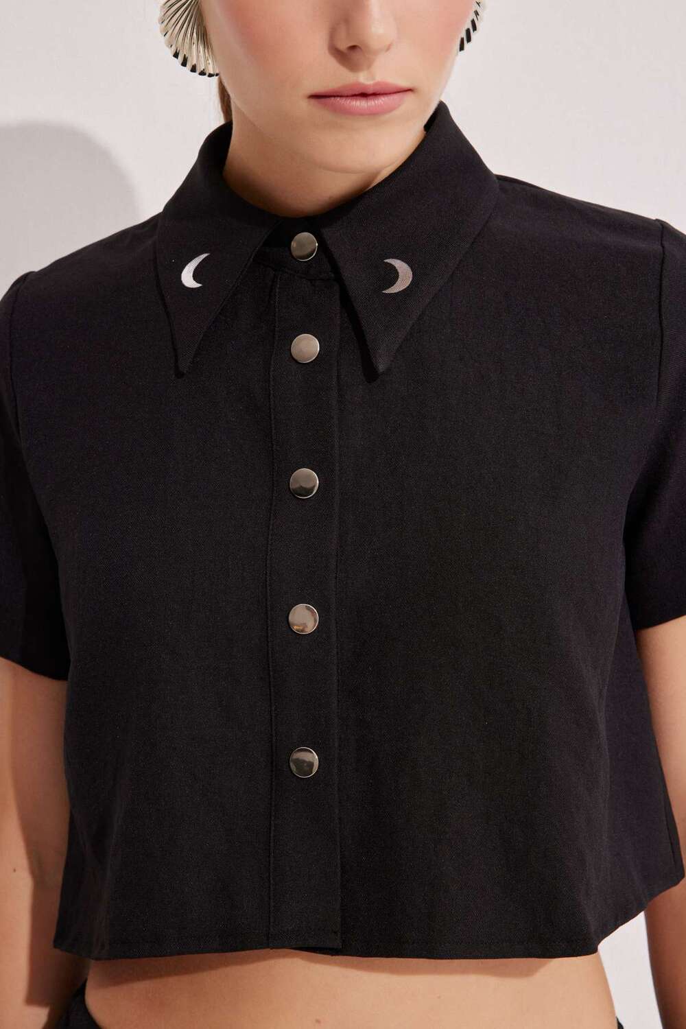 Gömlek Detayları: Düğmeler nikel metalik, crop, kısa kol gömlek yaka