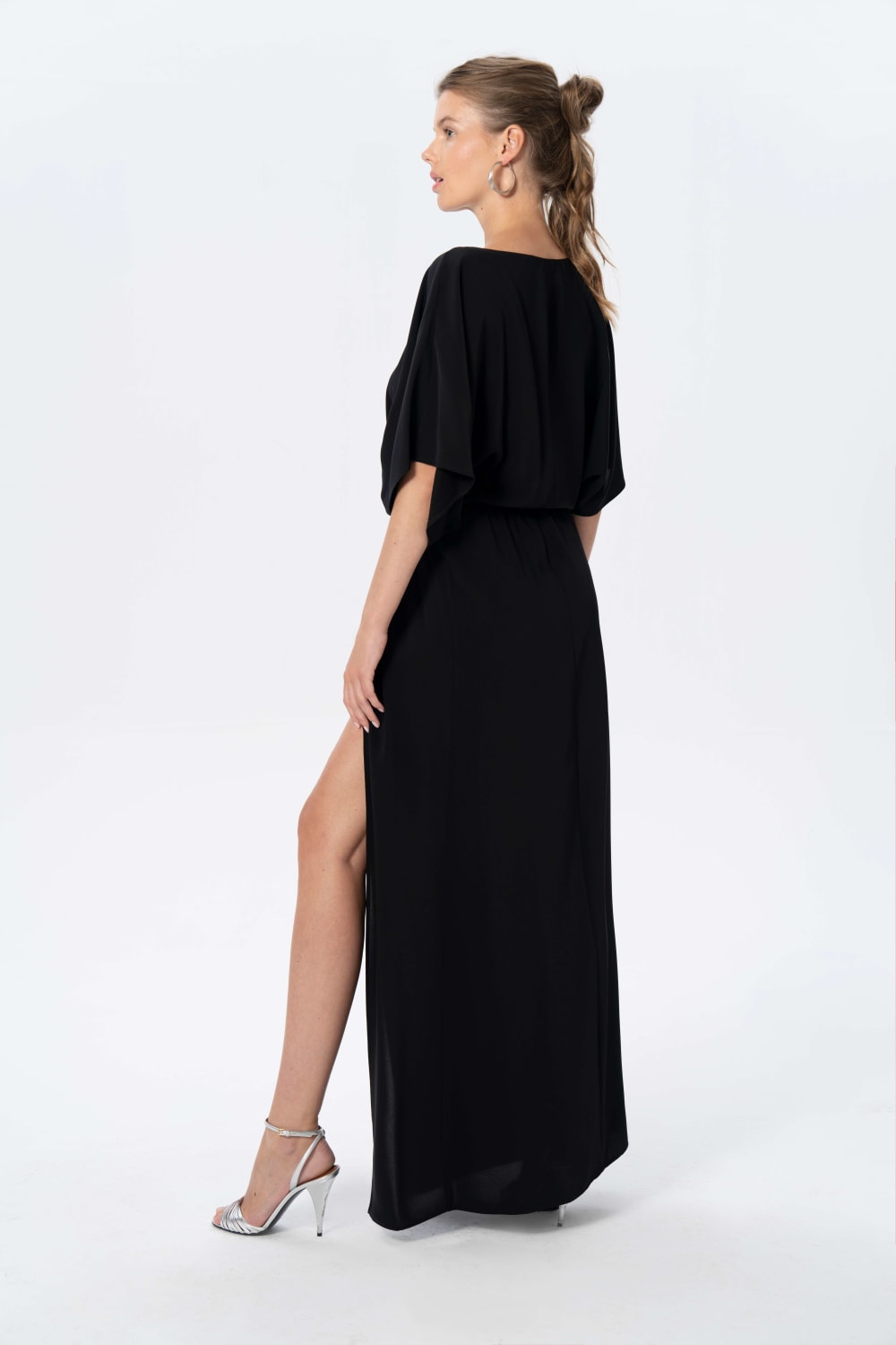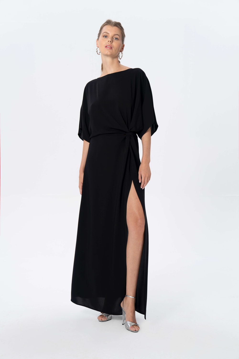 Krep kumaştan kayık yaka bacak yırtmacı detayı olan düğümlü uzun elbise.