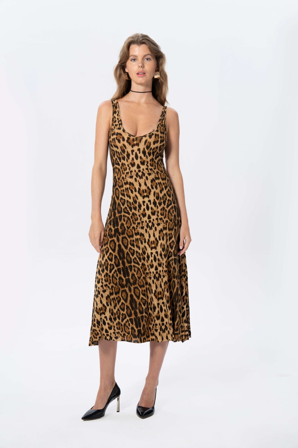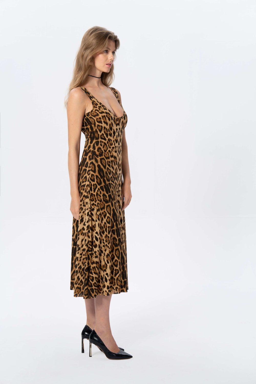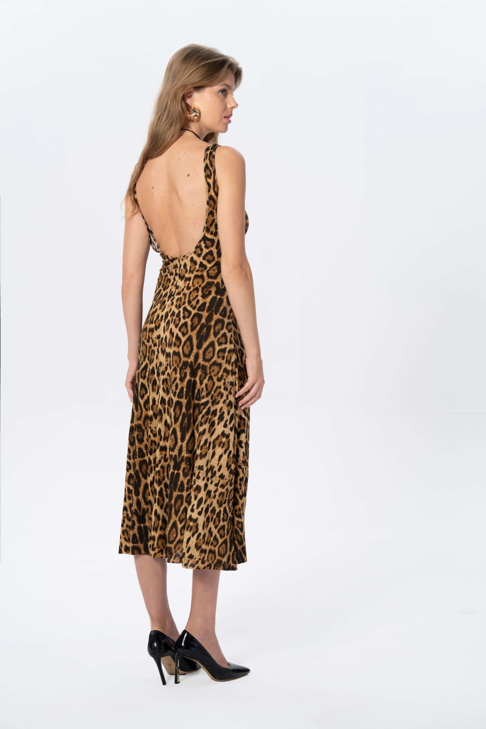 Yakası ve sırtı U kesim, leopar desen, midi boy jarse elbise.