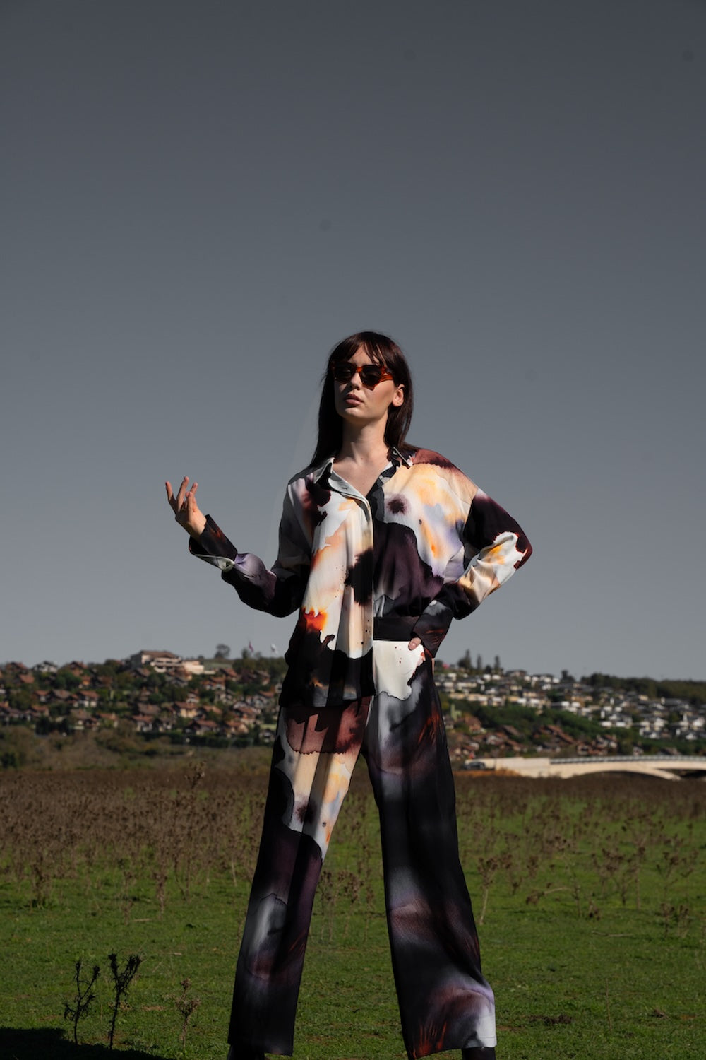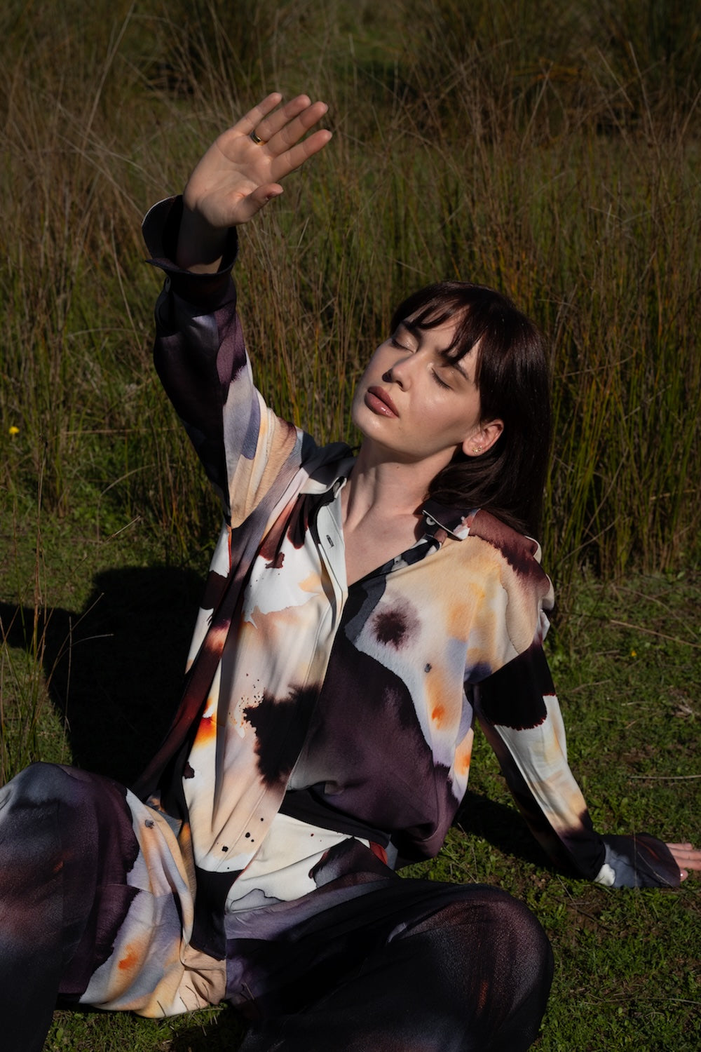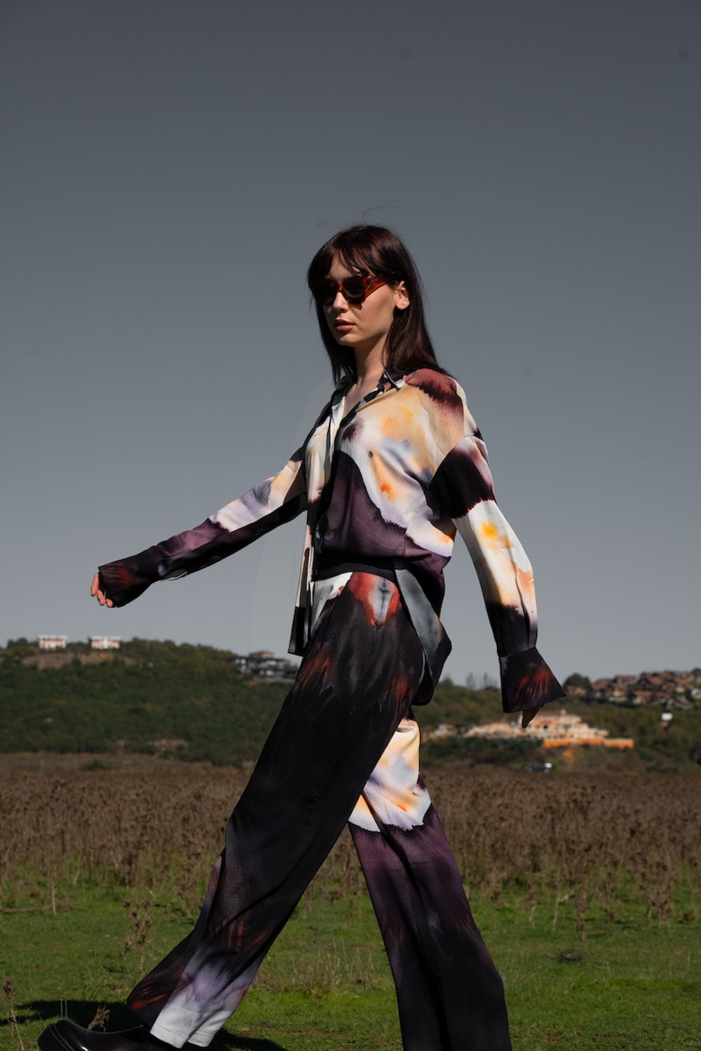 El boyası suluboya çizimlerinden ilham alan desenleriyle güçlü ve özgün bir görünüm sunar. Sanatsal dokusu, dijital baskı tekniğiyle pamuk kumaşa aktarılmıştır. Doğadan beslenen renkleri ve modern silueti sayesinde hem günlük kullanımda hem de şık kombinlerde rahatlıkla tercih edilebilir. Hafif ve nefes alabilen yapısı gün boyu konfor sağlar.