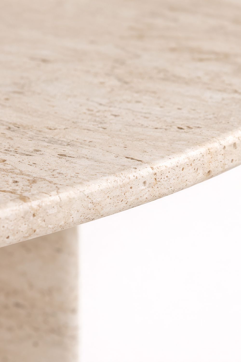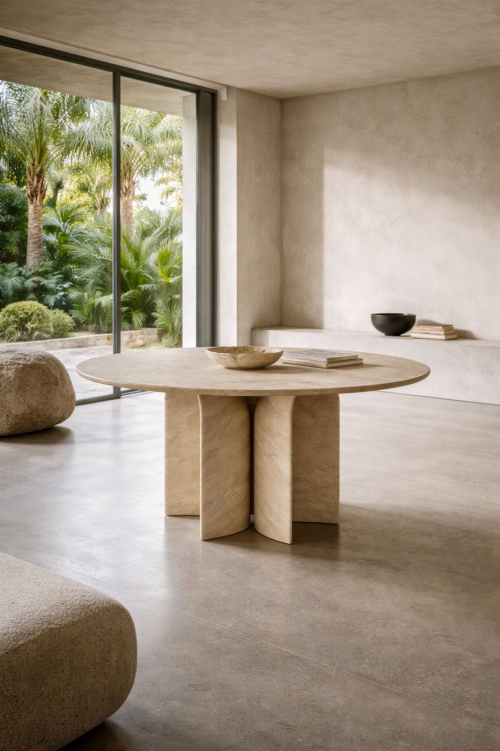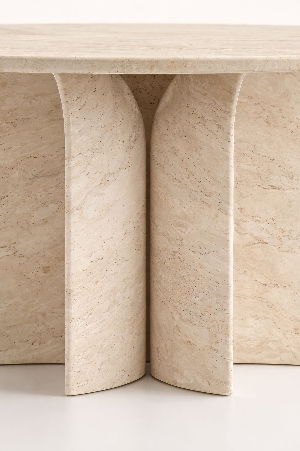 PLEON Çağdaş Traverten Yemek Masası, geniş hacimli yemek alanları için dengeli ve konforlu ölçülerde tasarlanmıştır. Yuvarlak tablası ve çok ayaklı taşıyıcı yapısı sayesinde hem güçlü bir duruş hem de rahat bir kullanım sunar.