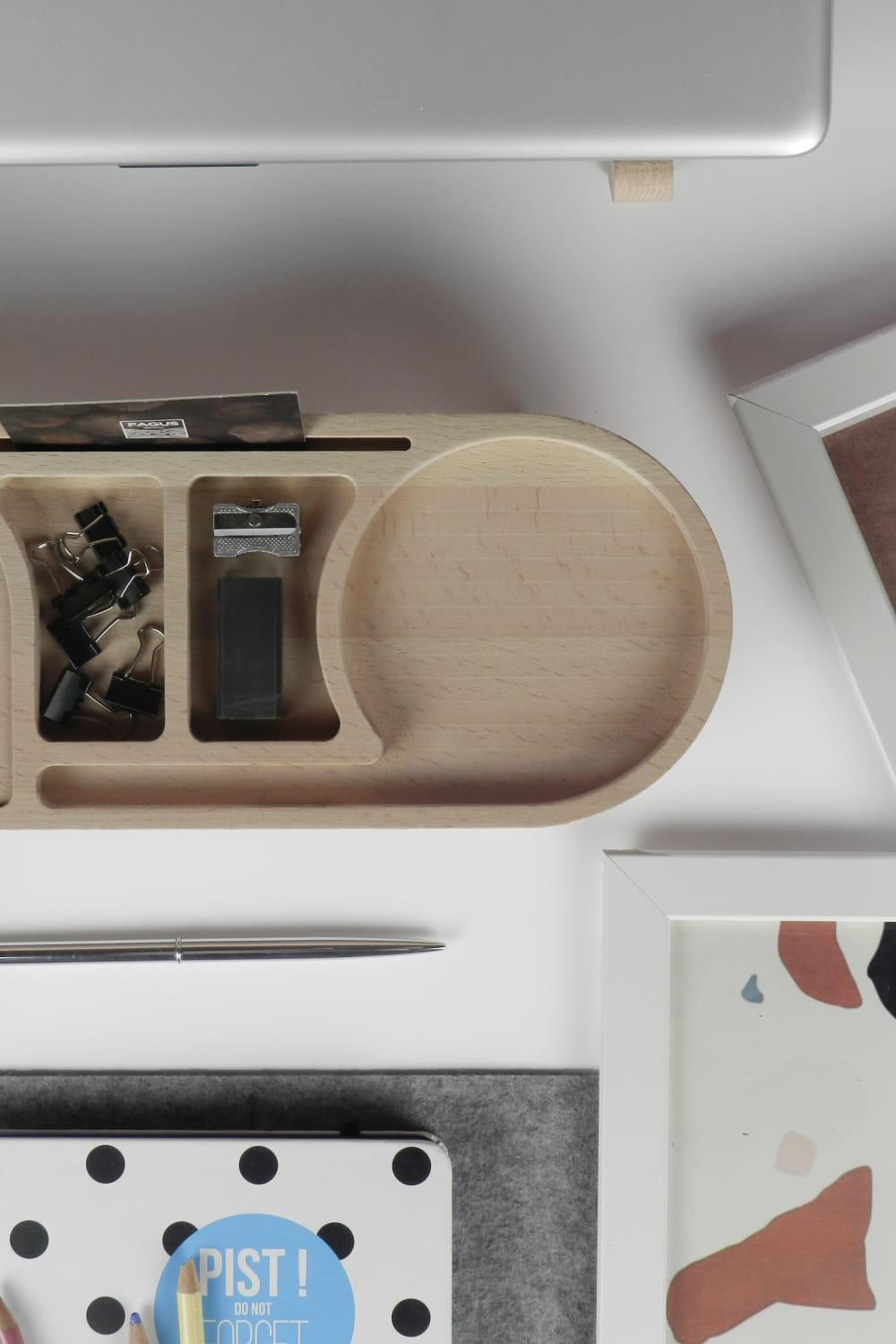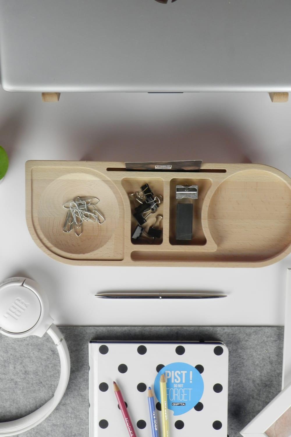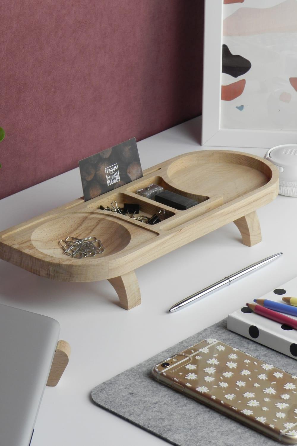 Fagus Wood Mini Drop masa düzenleyici; tasarımı tamamen firmamıza ait olan bu organizer ile çalışma masanızı düzenlerken ahşabın sıcak rengine ve dokusuna yaşam alanlarınızda yer açabilirsiniz. 6 bölmesi olan Drop minimal bir görüntü sağlayarak eşyalarınızı depolamanıza yardımcı olur. Tamamen doğal ağaçtan üretildiği için ürünler arasında renk ve desen farklılığı olabilir. Fiyata yalnızca ahşap stant dahildir. Toplu siparişlerde ürünlere lazer kazıma ile logo, amblem, isim, vs. eklenebilir.