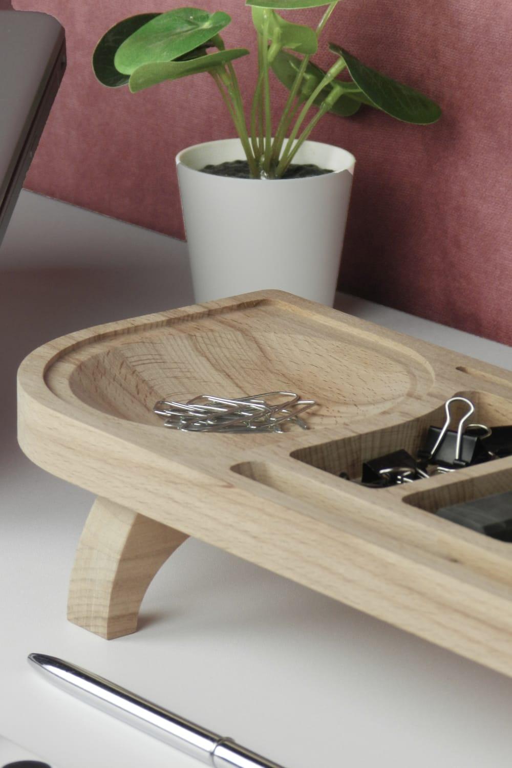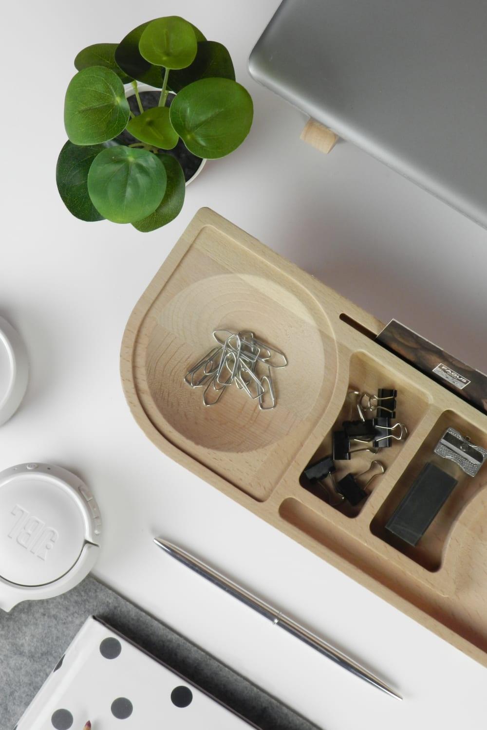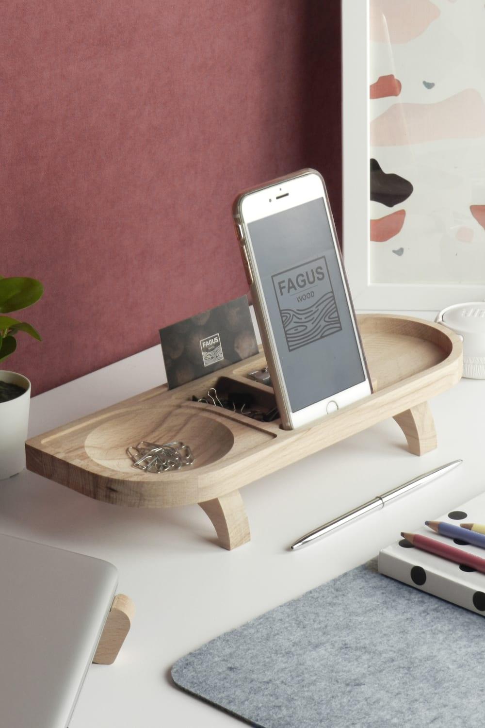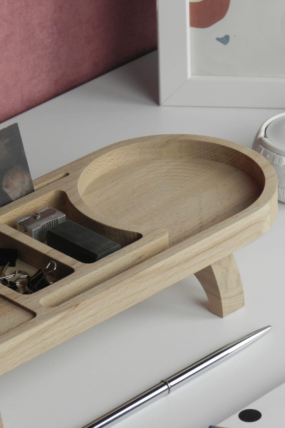 Fagus Wood Mini Drop masa düzenleyici; tasarımı tamamen firmamıza ait olan bu organizer ile çalışma masanızı düzenlerken ahşabın sıcak rengine ve dokusuna yaşam alanlarınızda yer açabilirsiniz. 6 bölmesi olan Drop minimal bir görüntü sağlayarak eşyalarınızı depolamanıza yardımcı olur. Tamamen doğal ağaçtan üretildiği için ürünler arasında renk ve desen farklılığı olabilir. Fiyata yalnızca ahşap stant dahildir. Toplu siparişlerde ürünlere lazer kazıma ile logo, amblem, isim, vs. eklenebilir.
