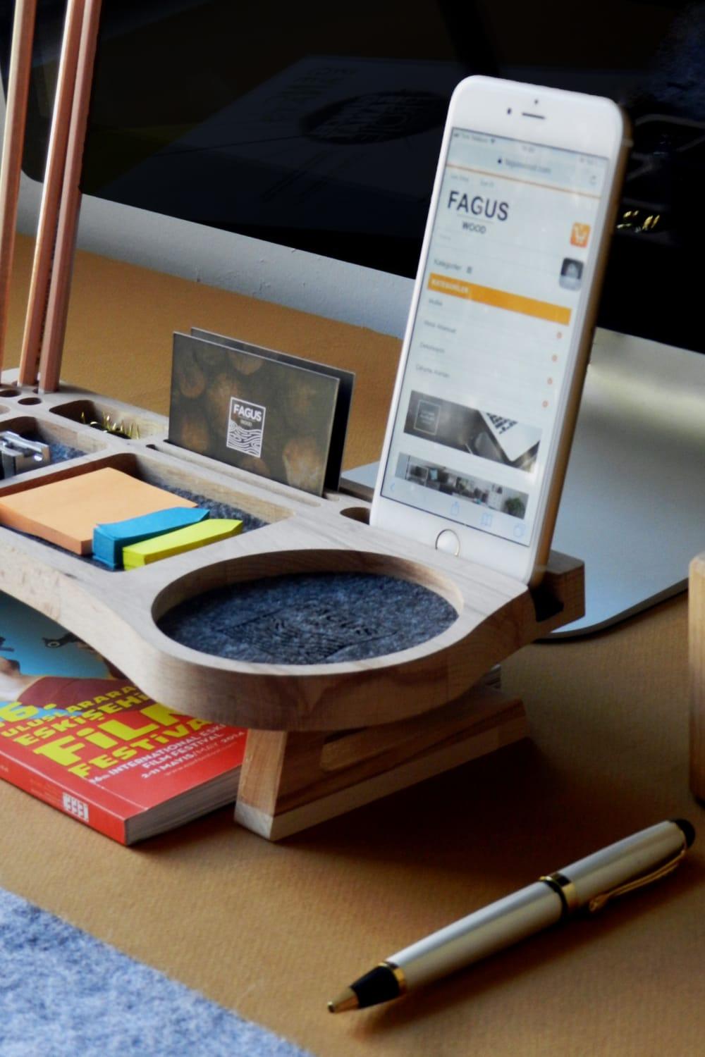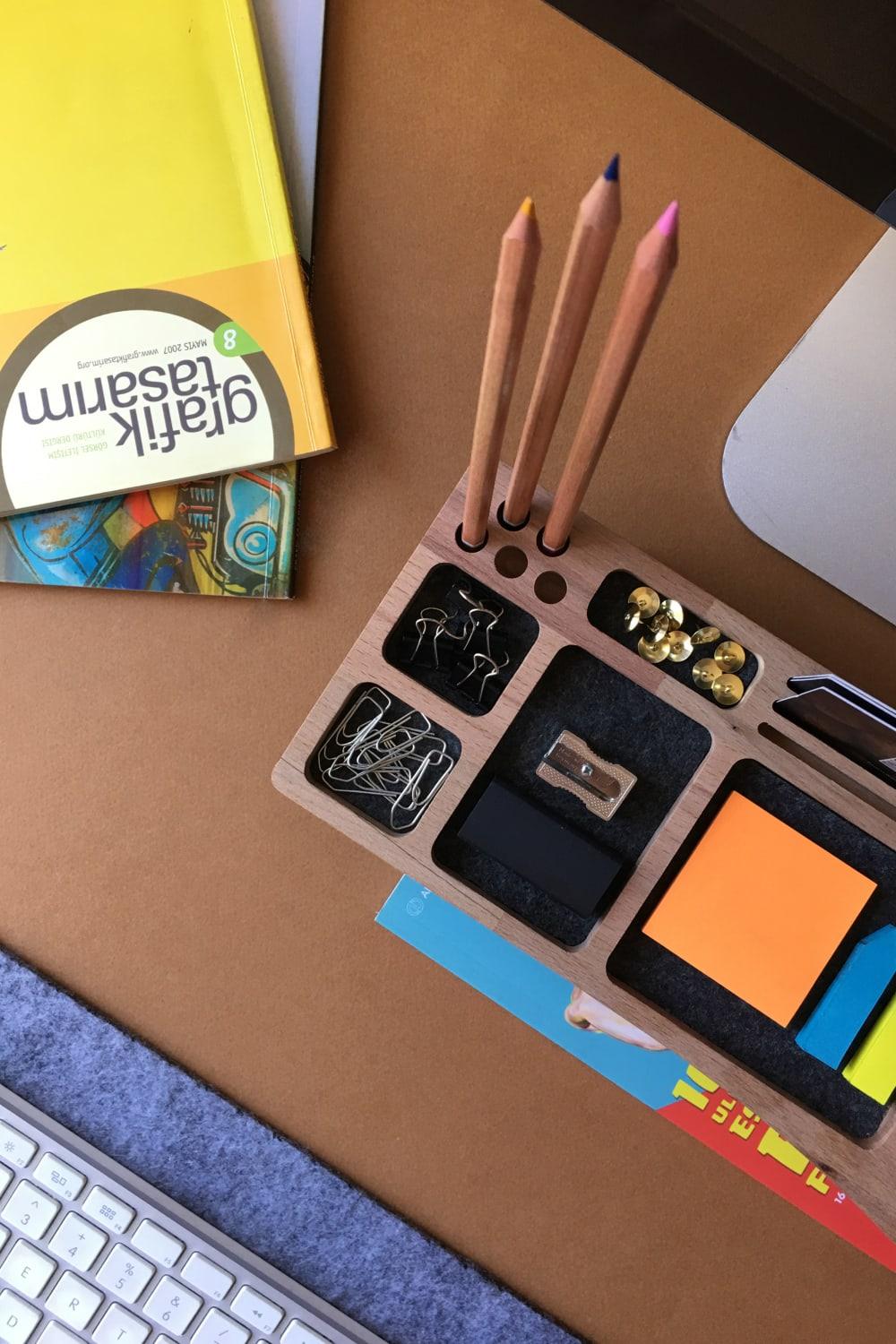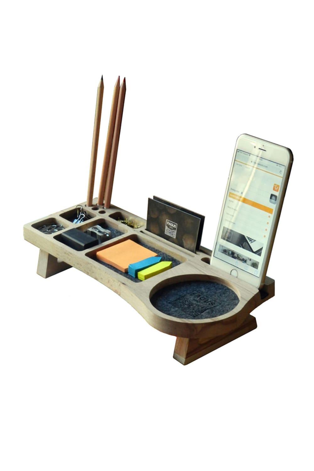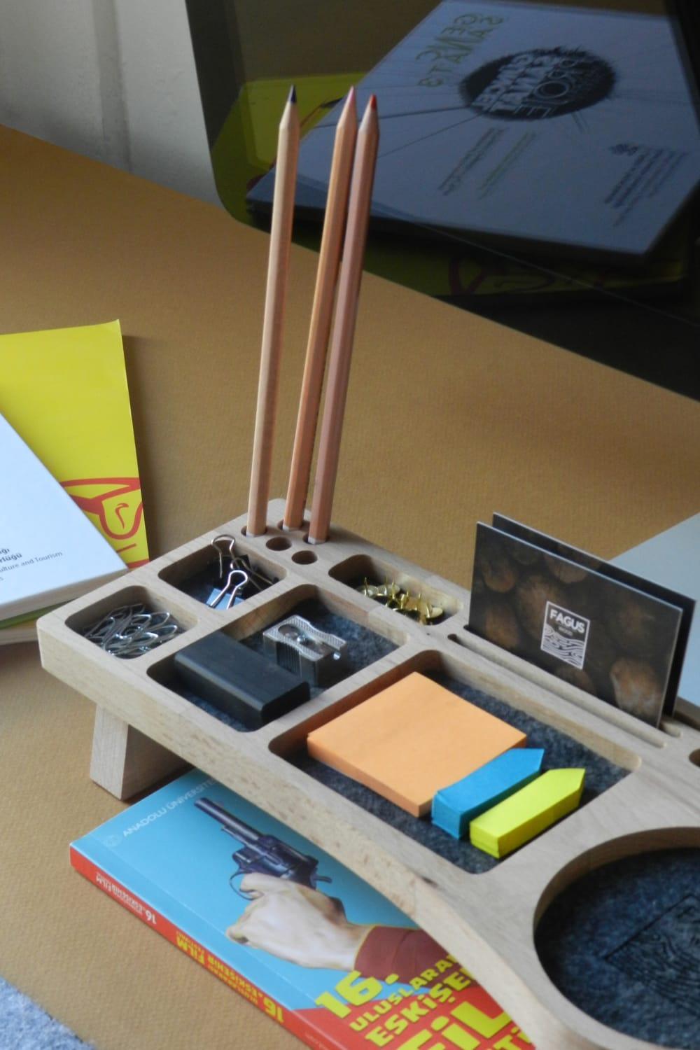 Fagus Wood Mini Stanley masa düzenleyici; çalışırken genelde elimizin altında bulunması gereken ofis gereçleri bulunmaktadır. Mini Stanley 15 bölmesi sayesinde tüm ihtiyacınızı karşılayacaktır. Sürekli ihtiyaç duyduğunuz kalemleri, silgi, kalemtıraş, uç kutuları, kartvizit gibi bir çok eşyanızı koyabilir aynı zamanda telefon standı olarakta kullanabilirsiniz. Masif ahşaptan üretilen Mini Stanley, bölmelerine konulan mat sayesinde tasarımda kişiselleştirebilme yapabilmeniz için 2 renk seçeneği ile üretilmiştir. Tamamen doğal ağaçtan üretildiği için ürünler arasında renk ve desen farklılığı olabilir. Fiyata yalnızca ahşap stant dahildir. Toplu siparişlerde ürünlere lazer kazıma ile logo, amblem, isim, vs. eklenebilir.