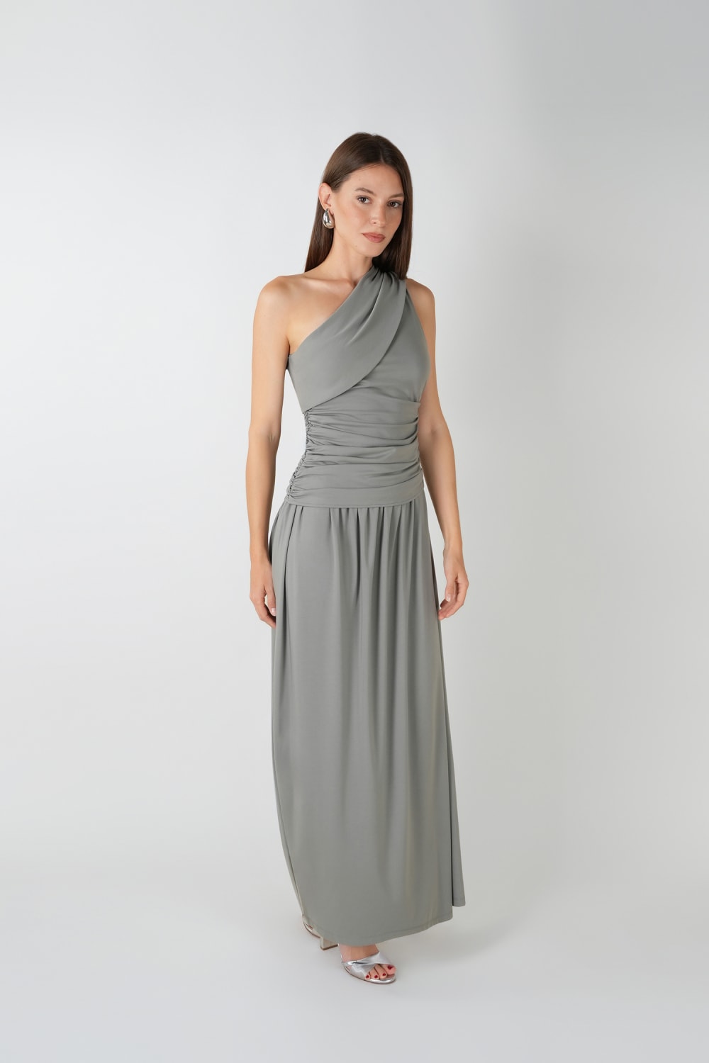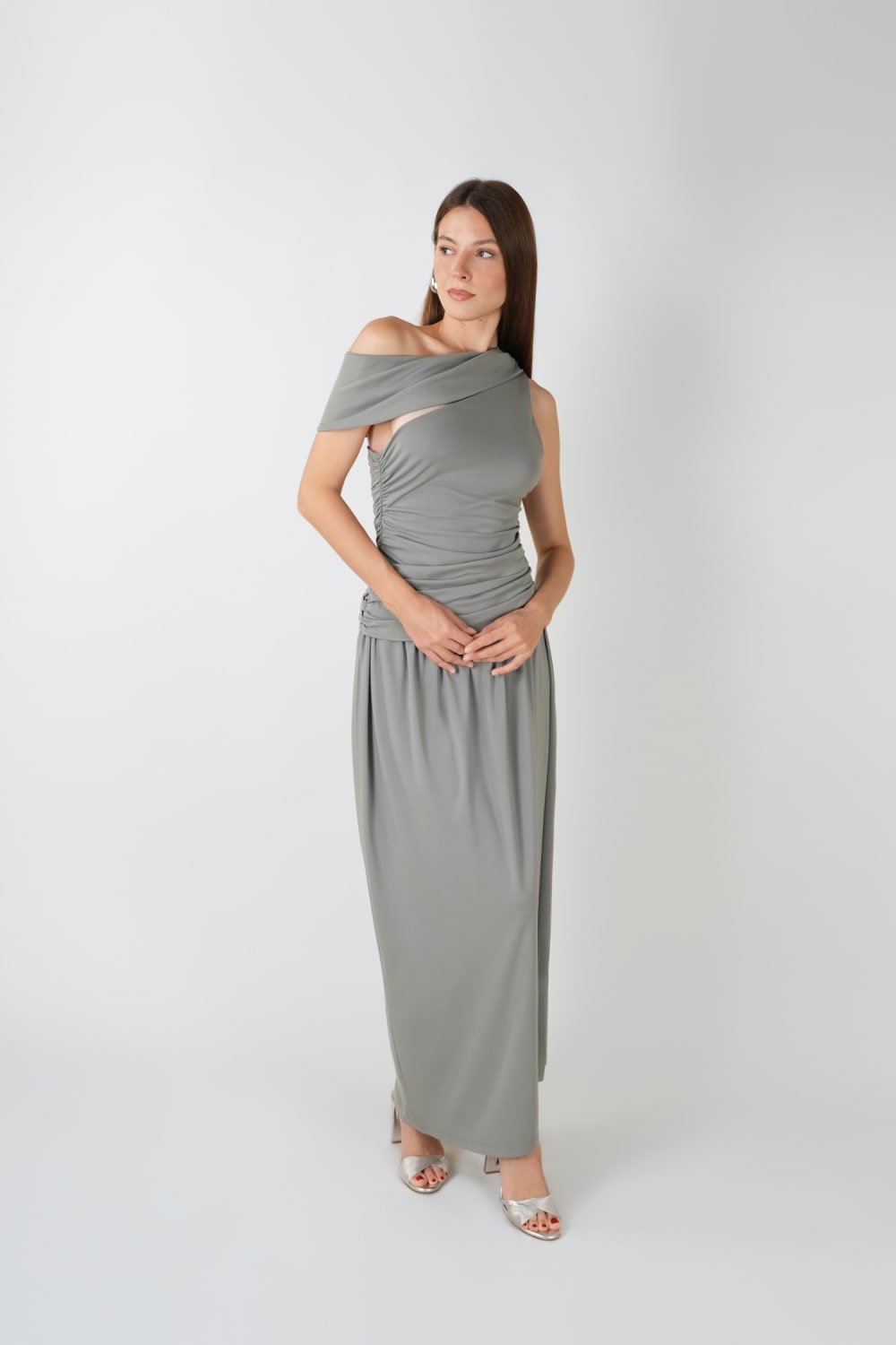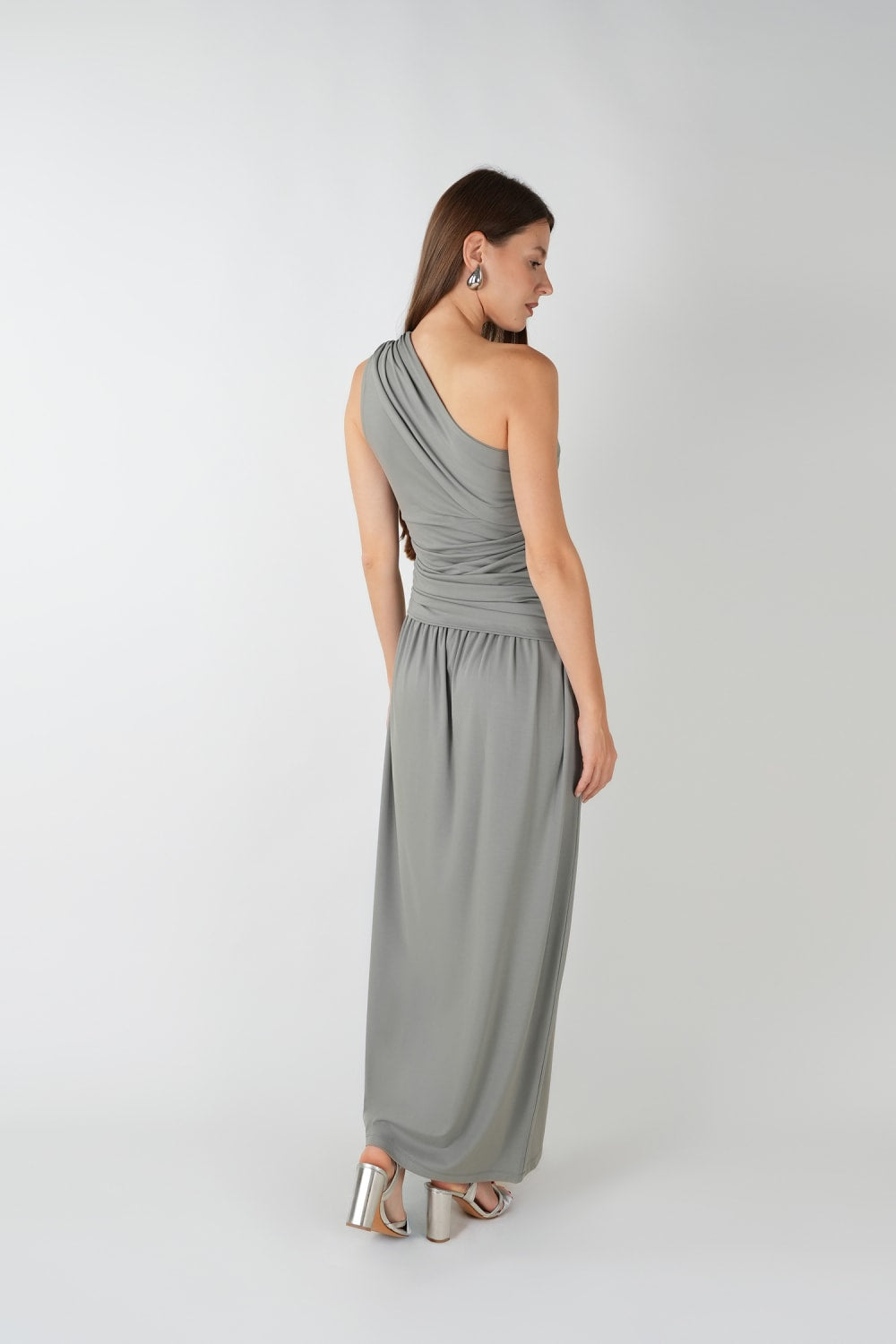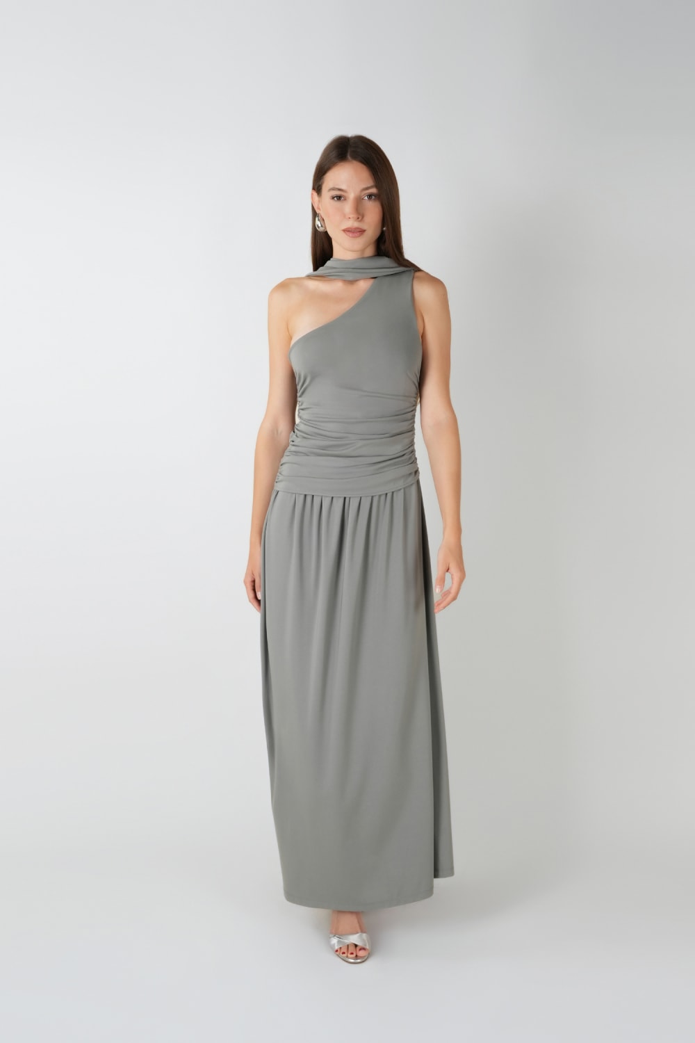 Asimetrik tek omuz tasarımıyla modern ve güçlü bir duruş sunan bu elbise, vücudu bele kadar saran yapısıyla feminen hatları zarifçe vurgular. Belden itibaren dökümlü ve bol kesimiyle hem hareket özgürlüğü hem de akıcı bir siluet sağlar. Ultra hafif kumaşıyla gün boyu konfor sunan bu tasarım, boyun çevresinden geçen bağlama detayının göğüs çevresine alınmasıyla iki farklı stilde kullanılabilir. Tek parçada iki görünüm sunarak gardırobun en çok yönlü parçalarından biri olmaya aday.