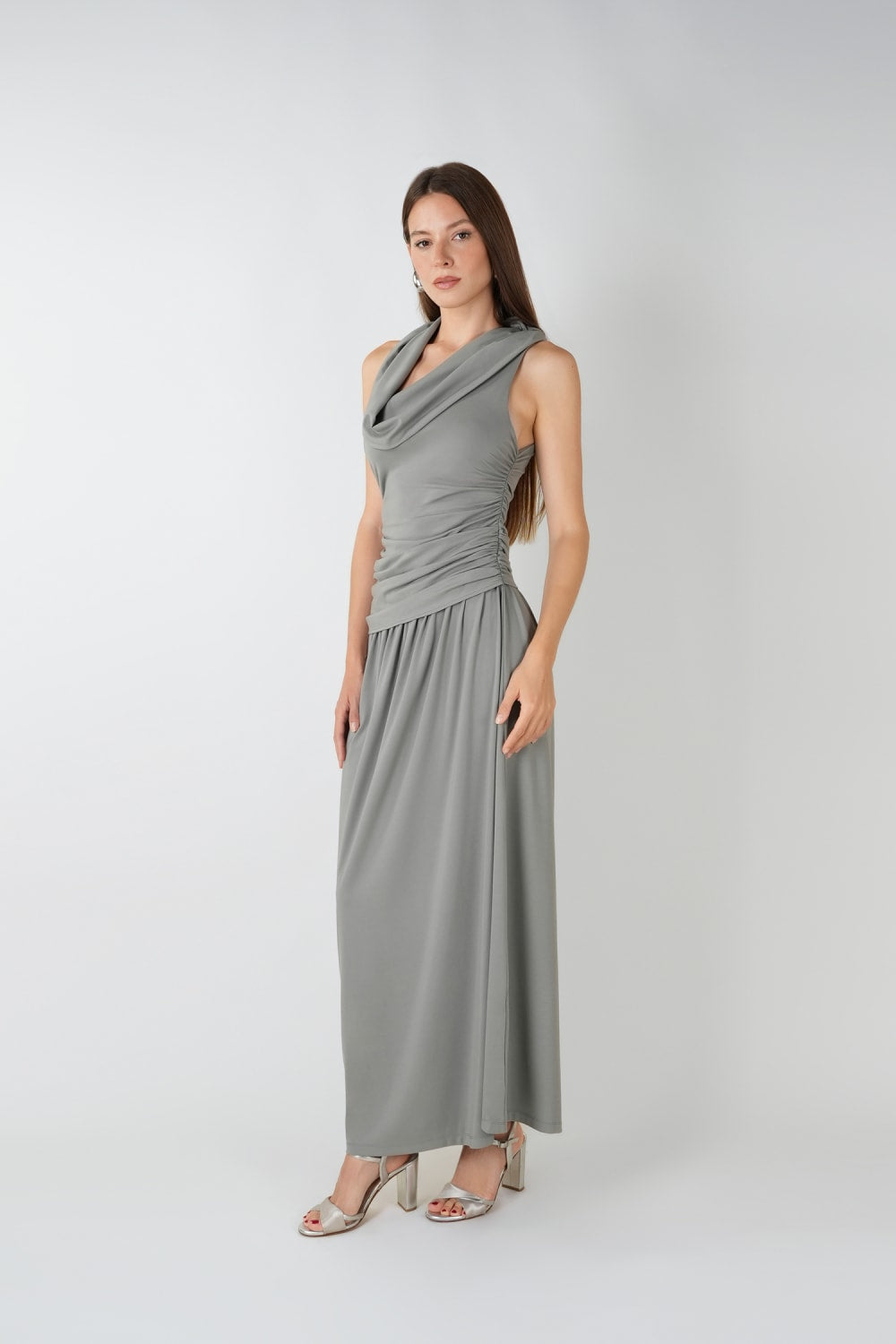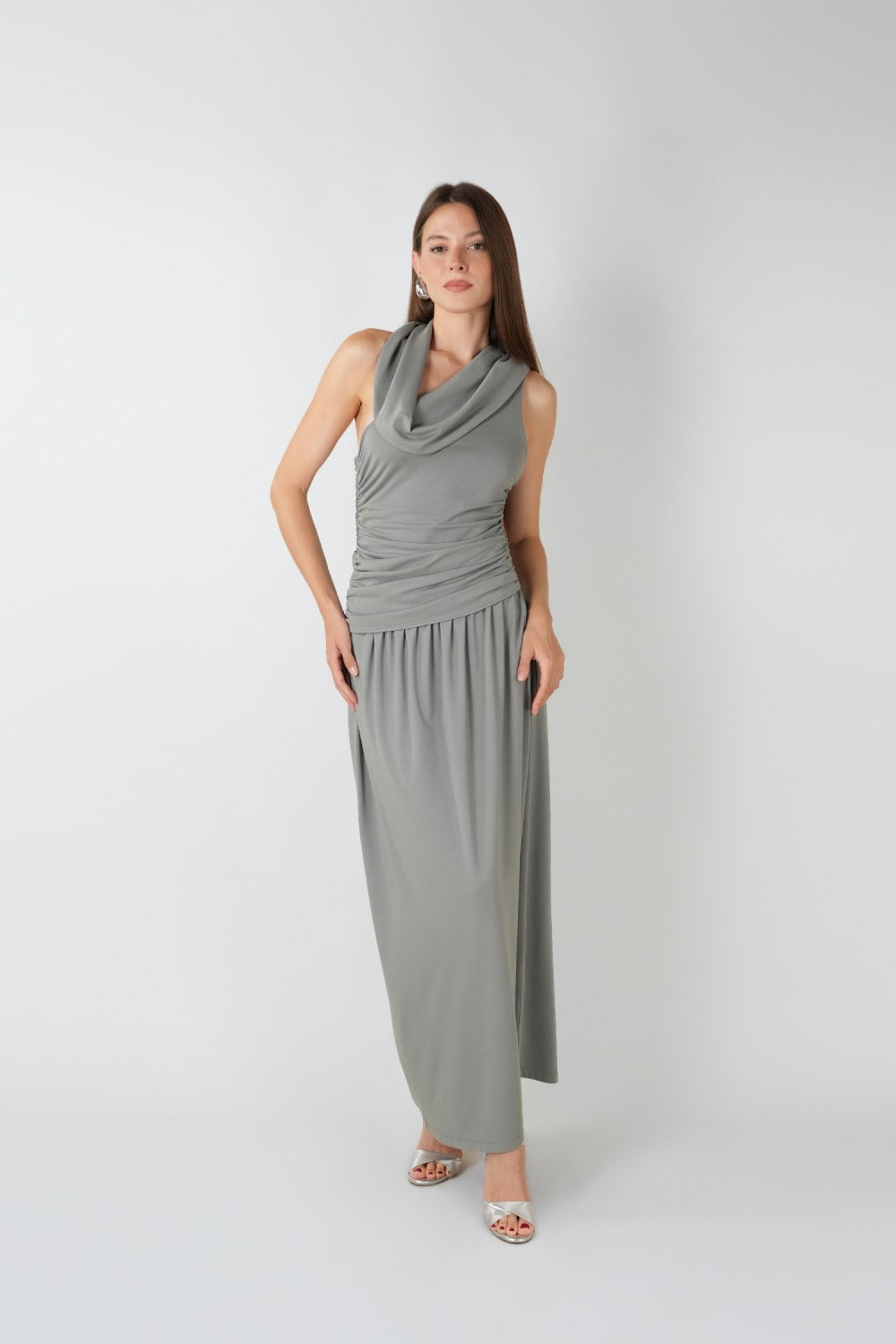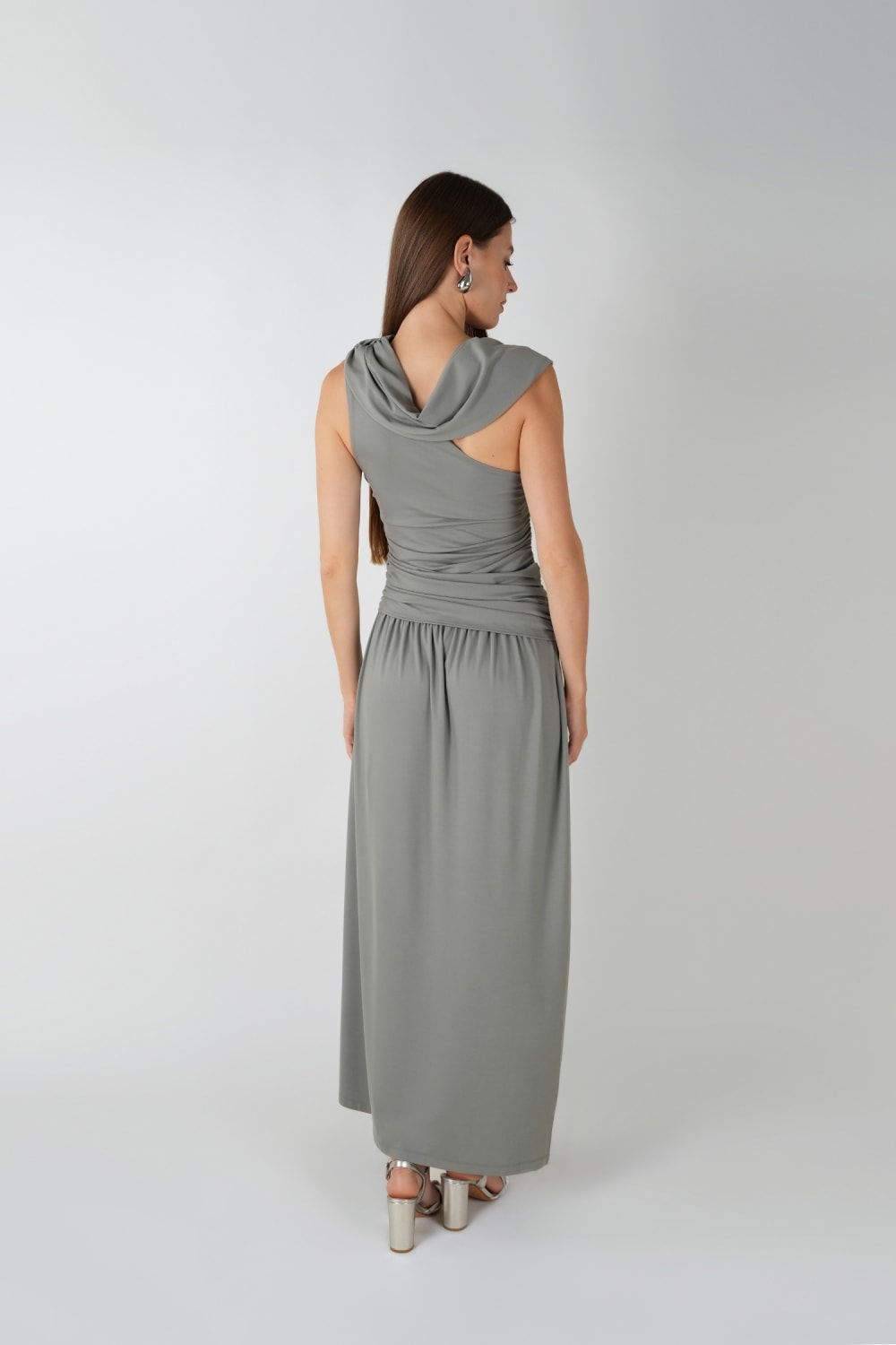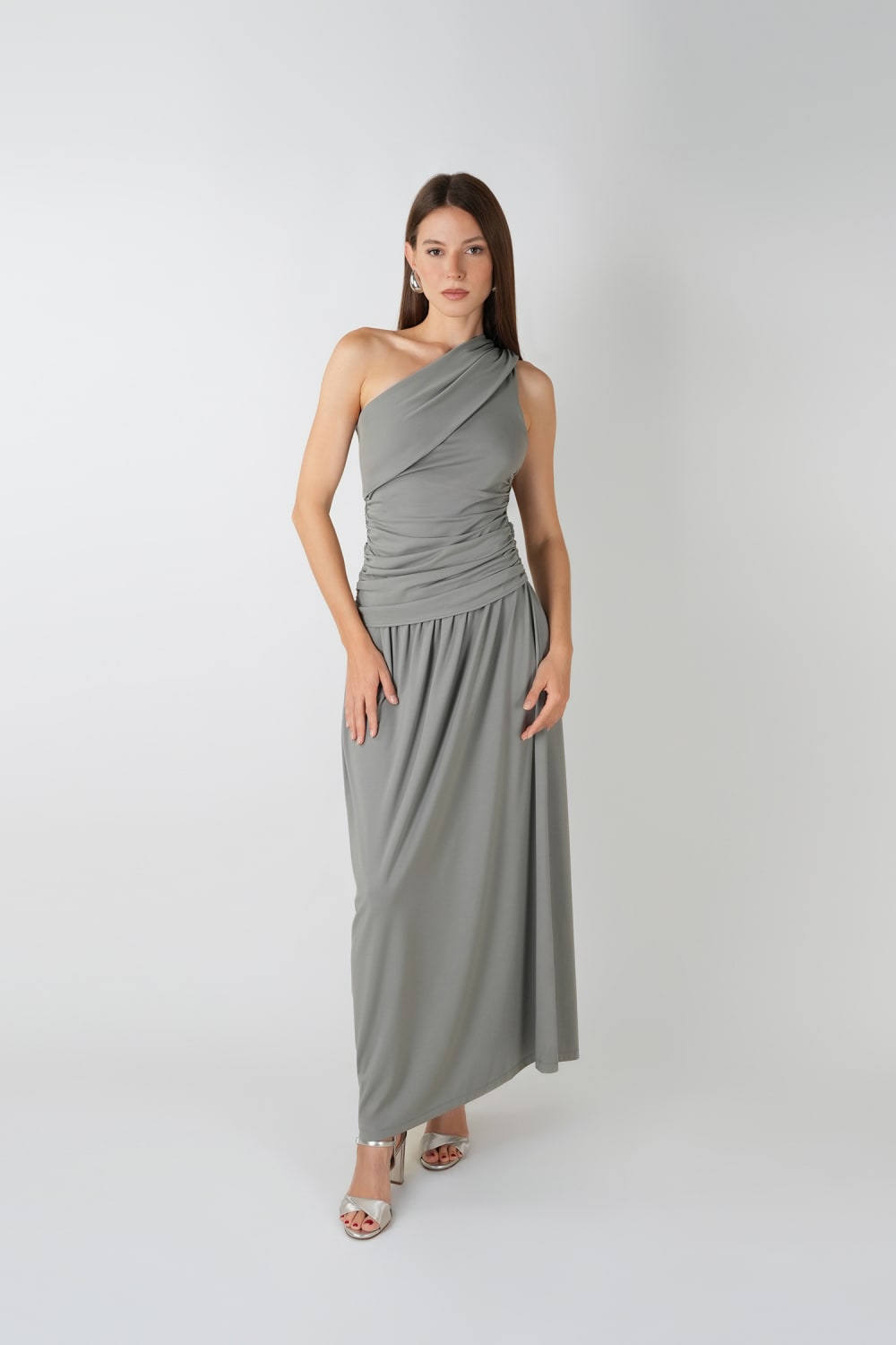 Asimetrik tek omuz tasarımıyla modern ve güçlü bir duruş sunan bu elbise, vücudu bele kadar saran yapısıyla feminen hatları zarifçe vurgular. Belden itibaren dökümlü ve bol kesimiyle hem hareket özgürlüğü hem de akıcı bir siluet sağlar. Ultra hafif kumaşıyla gün boyu konfor sunan bu tasarım, boyun çevresinden geçen bağlama detayının göğüs çevresine alınmasıyla iki farklı stilde kullanılabilir. Tek parçada iki görünüm sunarak gardırobun en çok yönlü parçalarından biri olmaya aday.