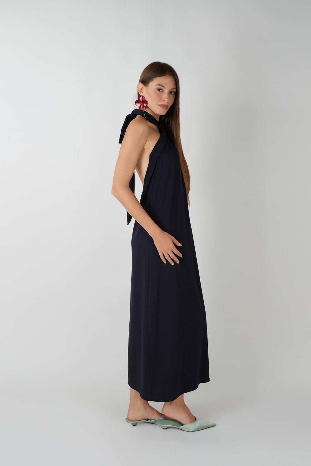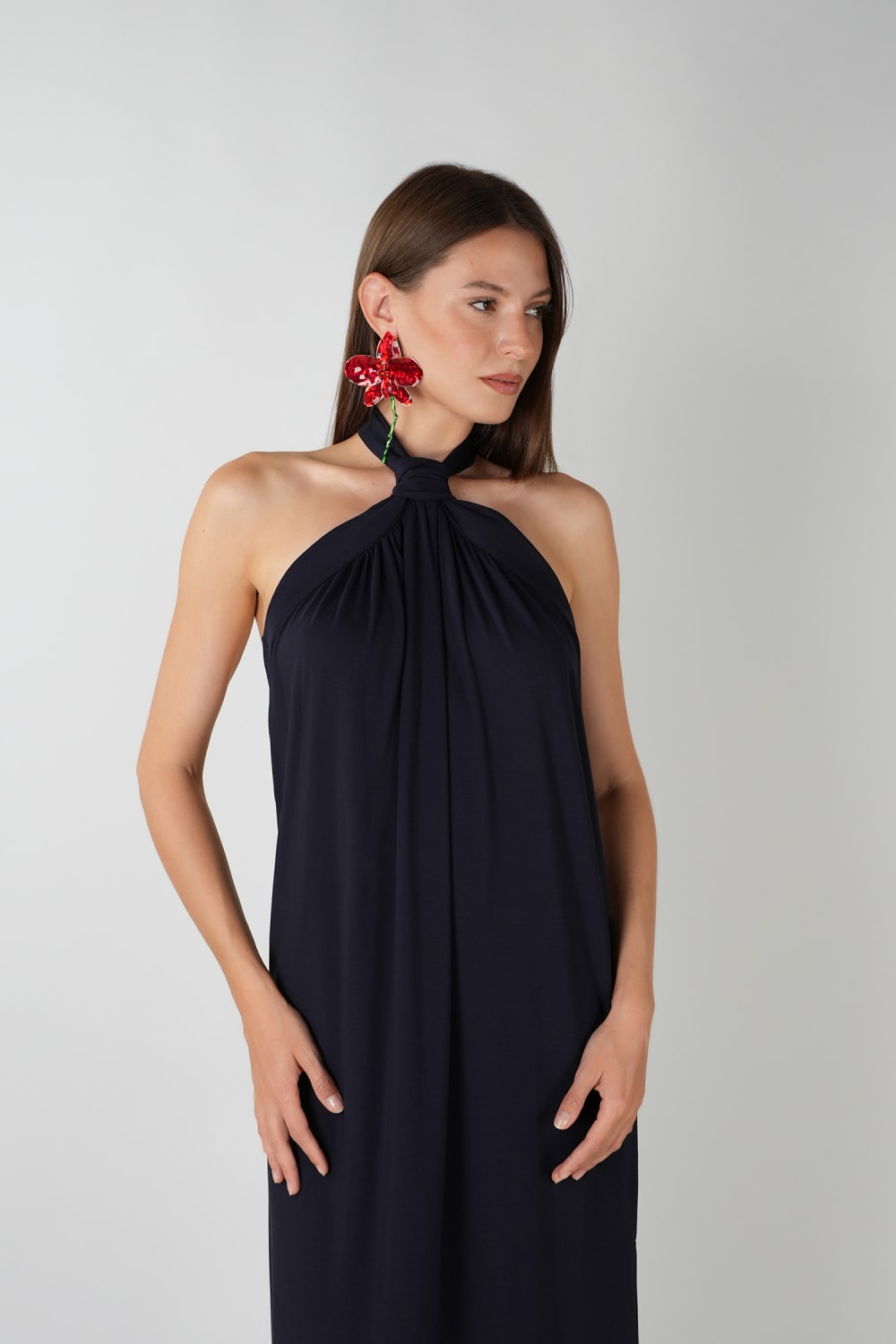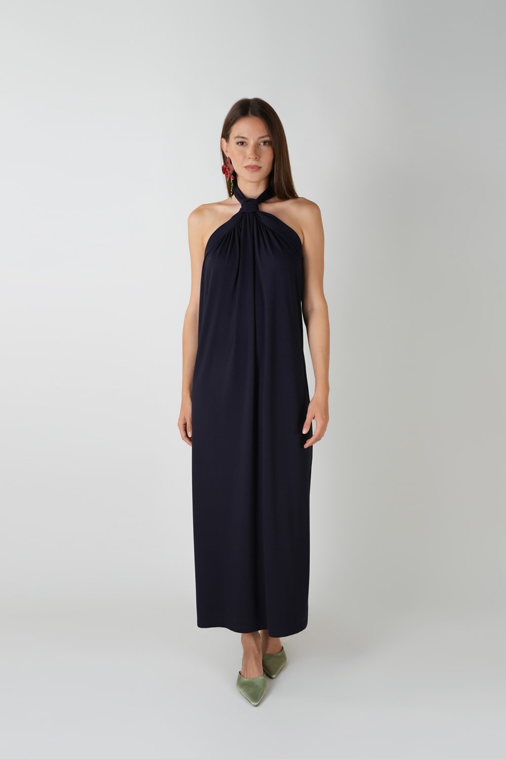 Ultra hafif ve dökümlü kumaşı sayesinde teninizde neredeyse yokmuş hissi yaratır. Boyundan düğümlü tasarımıyla güçlü bir siluet sunarken, sırt dekoltesi ve yırtmaç detayı feminenliği vurgular. Ayarlanabilir bağlama yapısı sayesinde vücuda mükemmel oturur ve gün boyu konfor sağlar. Geceden davetlere, yaz akşamlarından özel anlara kadar çok yönlü bir şıklık sunar.