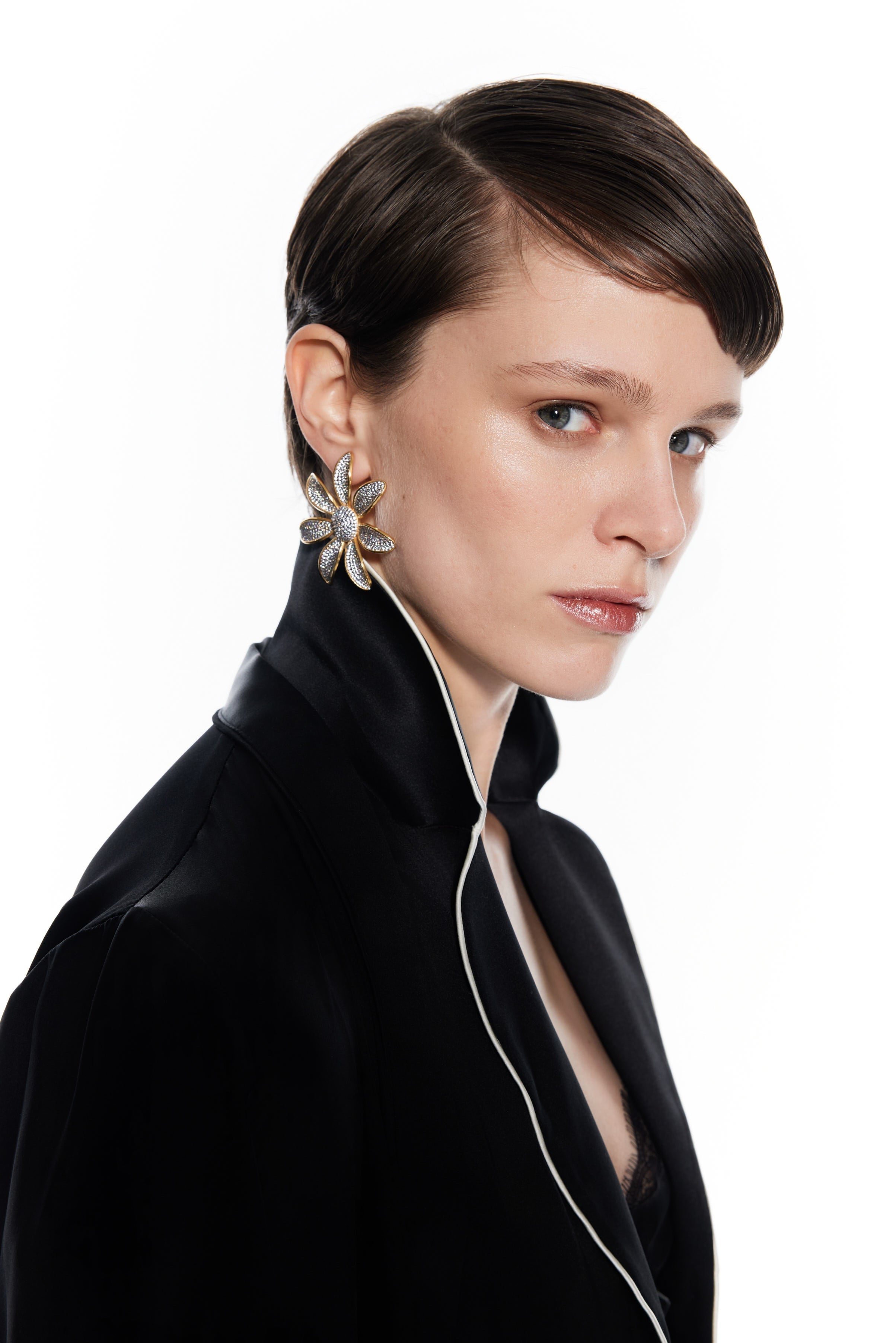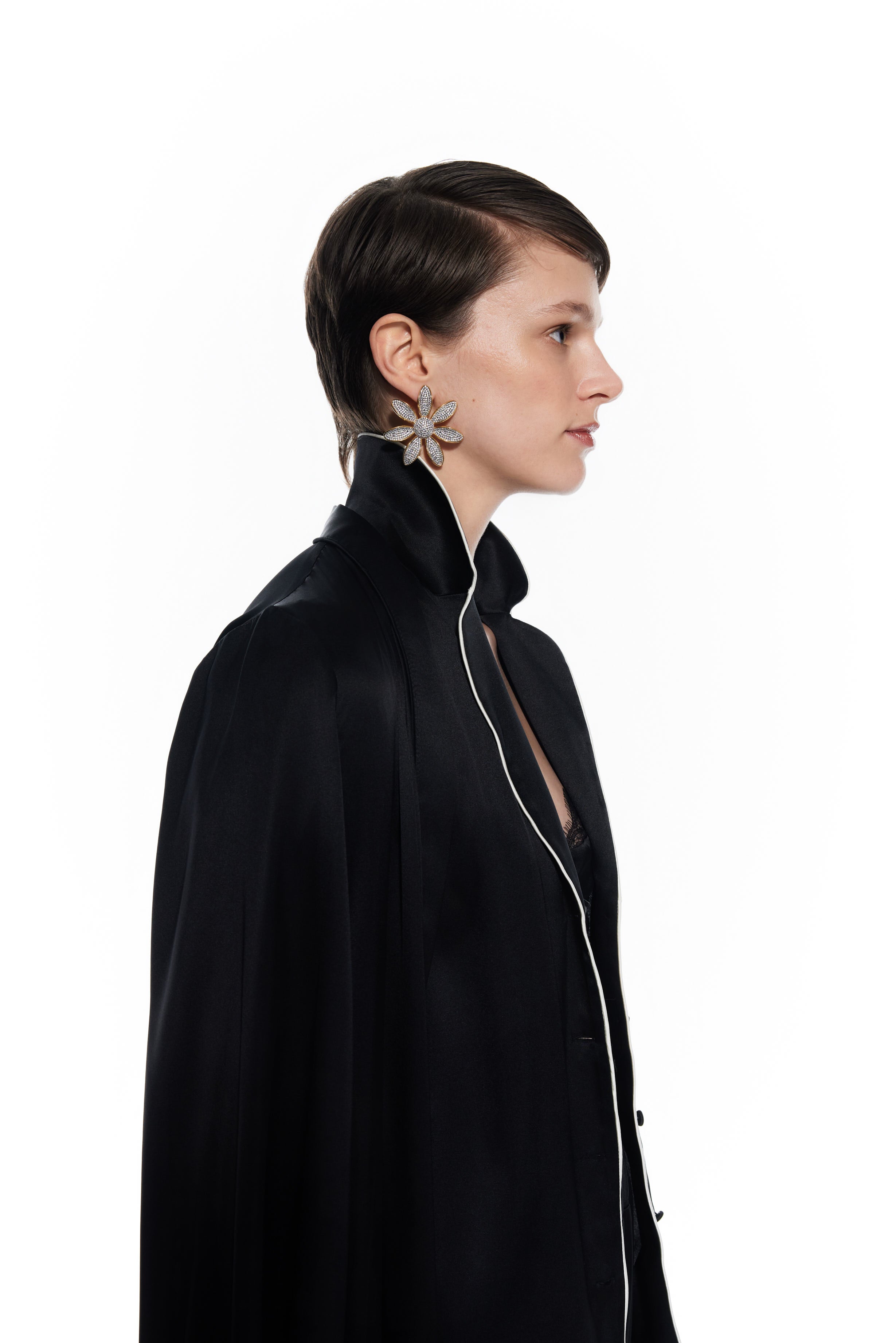 Carmen İpek Takım ve Sabahlık, lüks ve konforu bir arada sunar. Takımla uyumlu sabahlık, aynı şık tasarım detaylarına sahiptir. Siyah çizgiler, yakayı, manşetleri ve eteği zarif bir şekilde çerçeveleyerek beyaz ipek kumaş üzerinde modern bir kontrast oluşturur. Sabahlık eklenmesiyle bu takım, hem rahat kullanım hem de şık bir ev giyimi için idealdir.