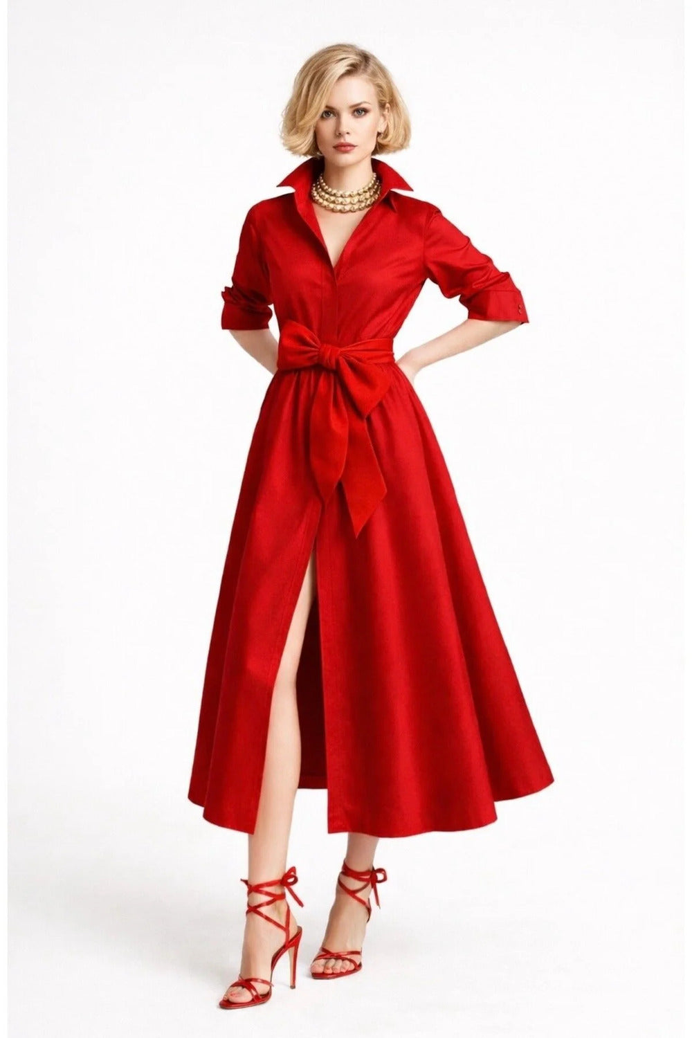 Midi Boy Kırmızı Tafta Gömlek Elbise