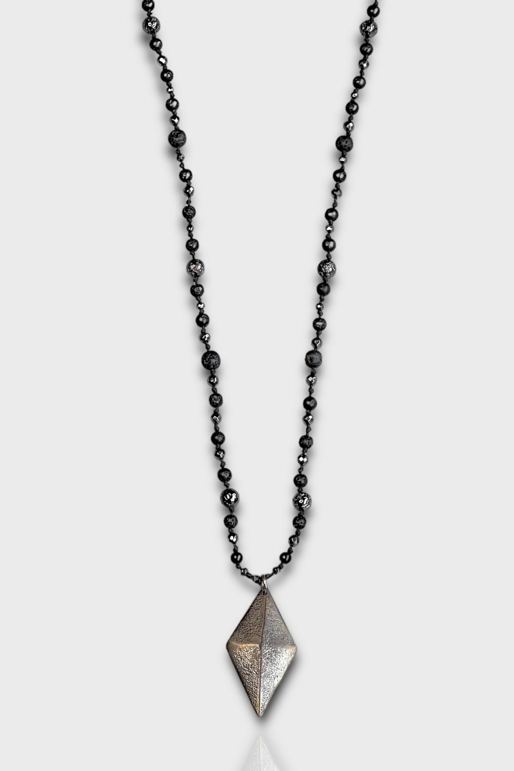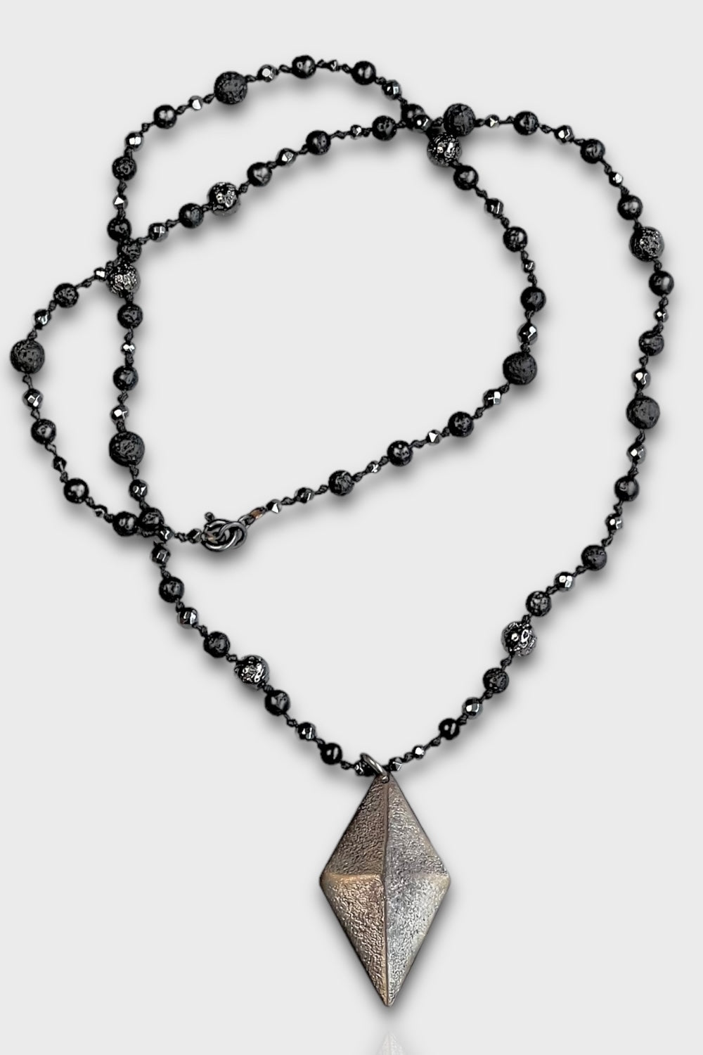 Hematit, onyx, lav taşı, oxitlendirilmiş antika bronz döküm kolye ucu ve gümüş kullanılarak tasarlandı.