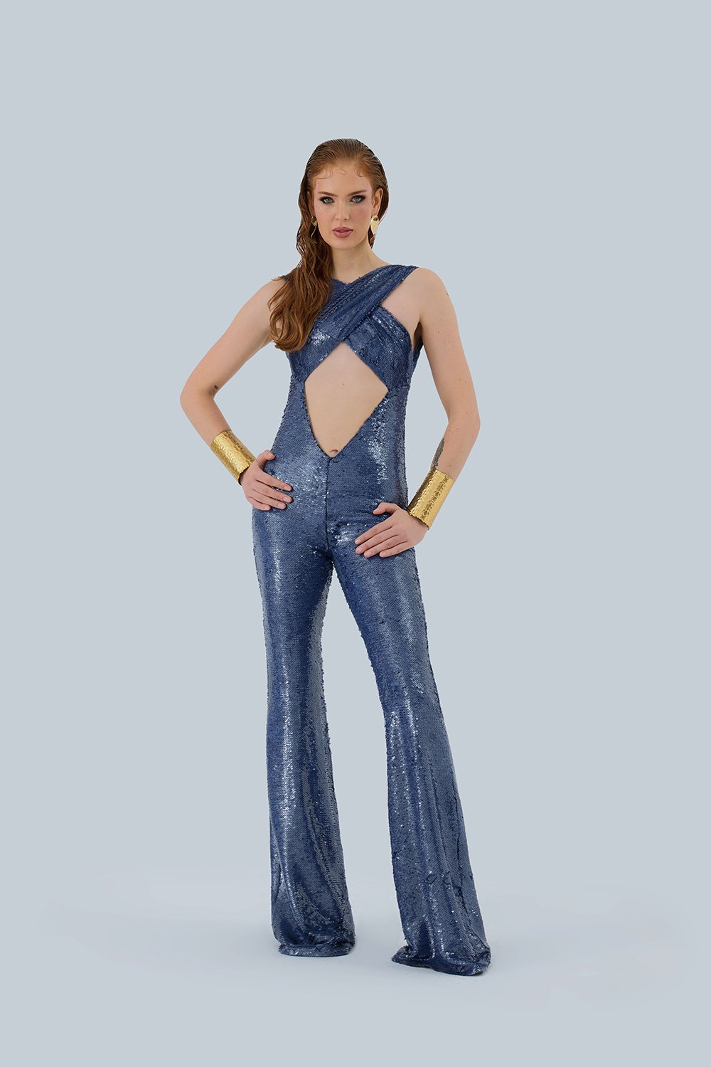 Bel ve sırt dekolteli streç payetli tulum