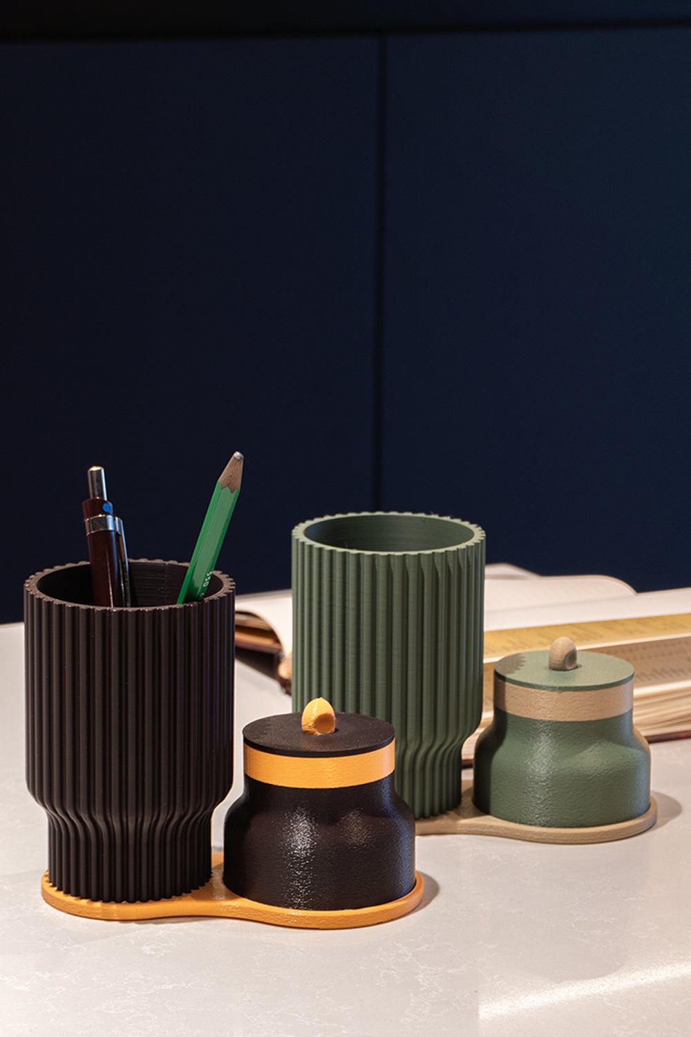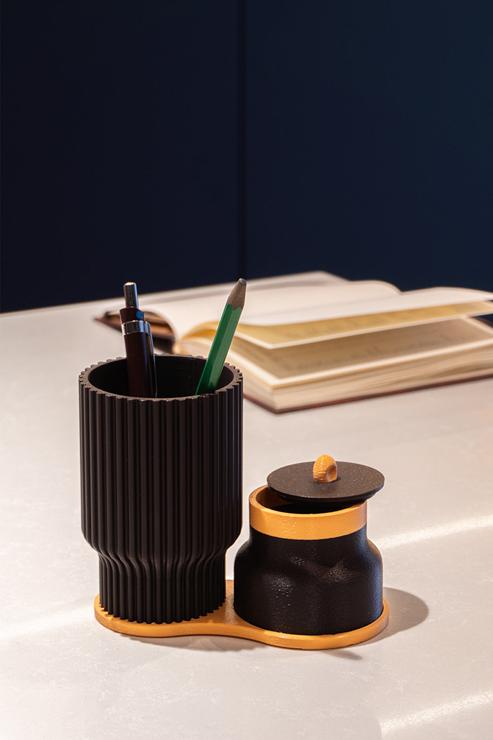 LOVA, çalışma masalarında düzeni sade bir estetikle buluşturan kompakt bir masa üstü düzenleyicisidir.Bir kalemlik, kapaklı mini saklama kutusu ve bu iki parçayı bir arada tutan tek parça tabandan oluşur. Günlük ihtiyaçlarınızı elinizin altında tutarken, masanızda görsel bir bütünlük sağlar.