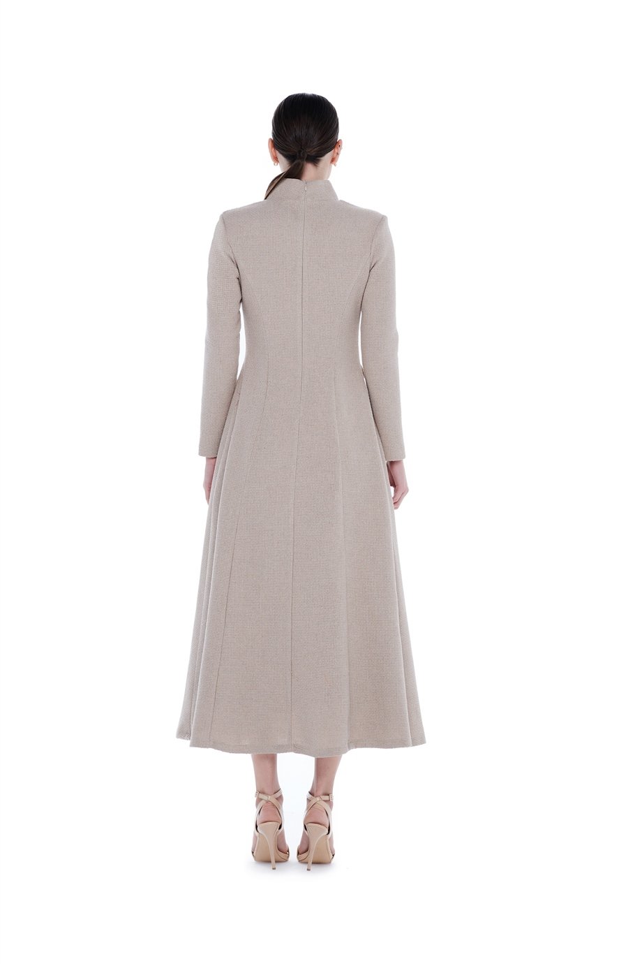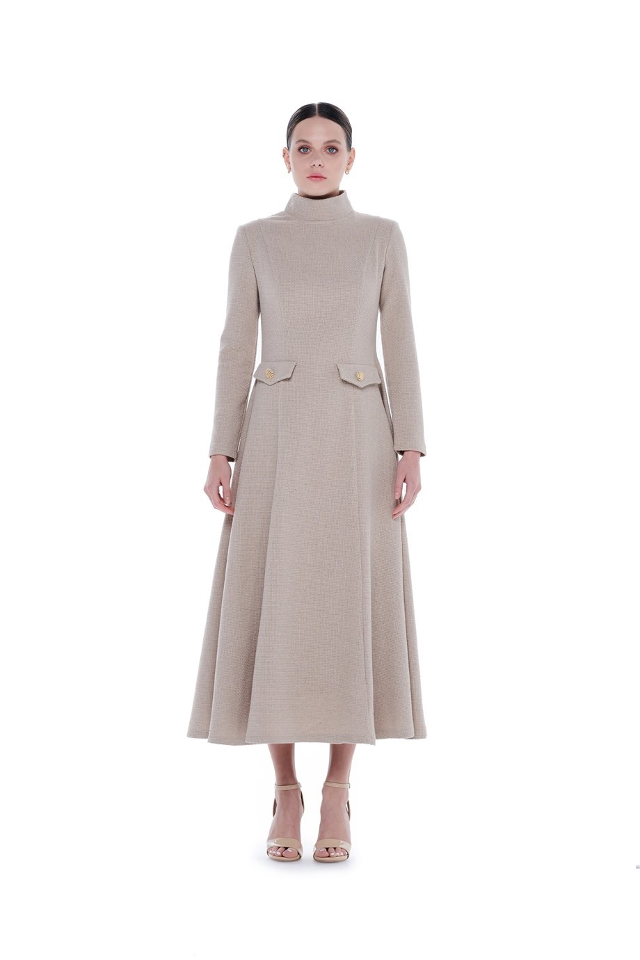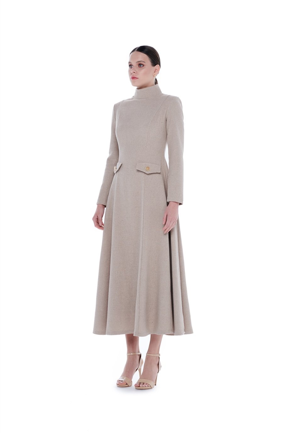 - Ürün Açıklaması: Dik yaka, fleto cep kapağı detaylı, metal düğmeli, kuplu, eteği volan dökülen uzun elbise.