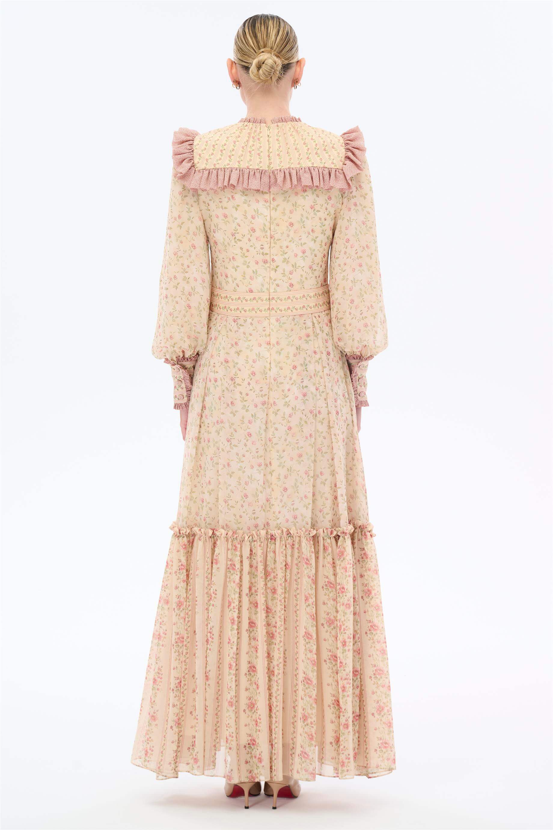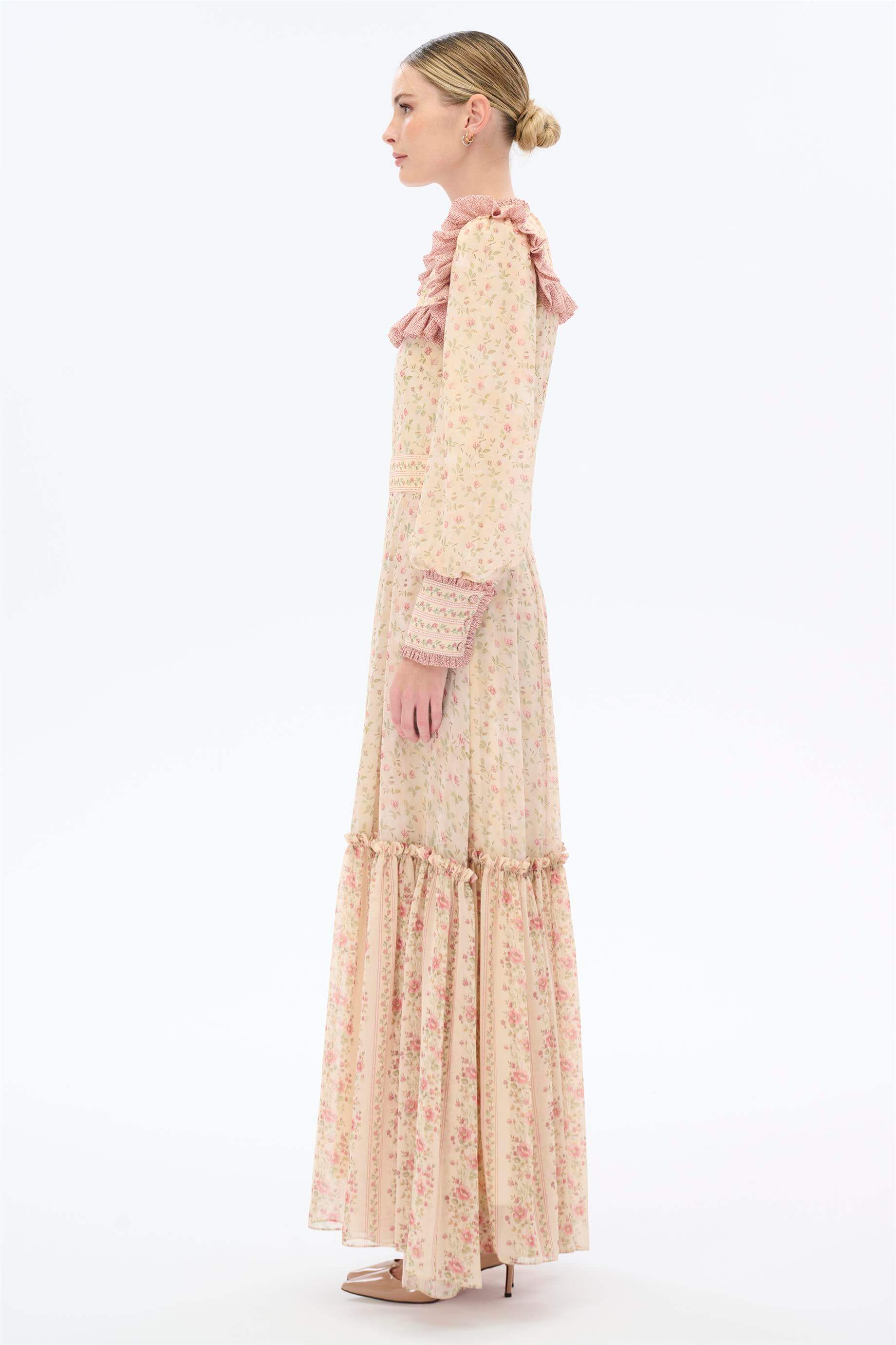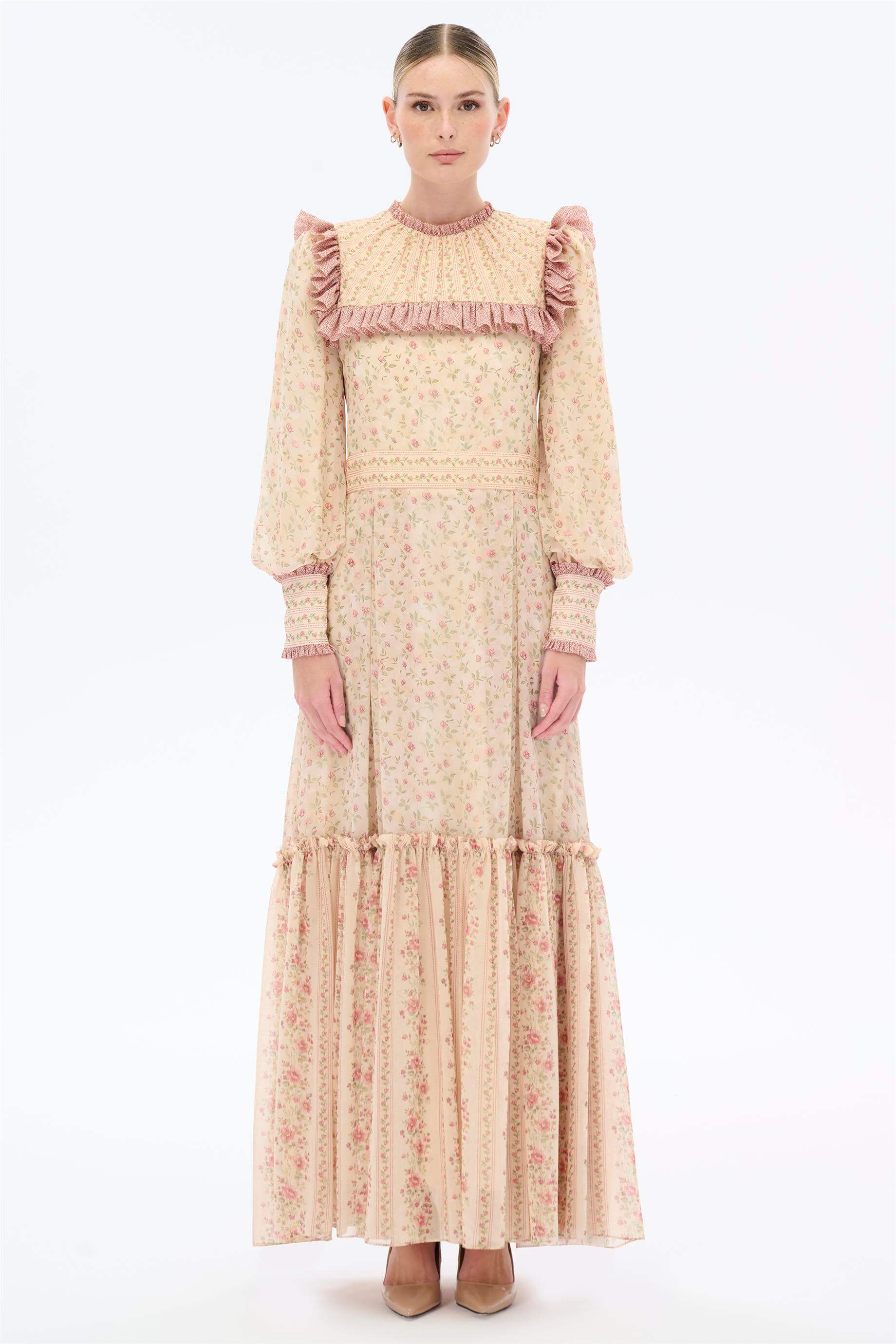 - Ürün Açıklaması: Omuz ve göğüs kısmındaki büzgüler ile adeta bir dönem kıyafetini andıran bu elbise, çiçek baskıları ile gününüzü güzelleştirecek.