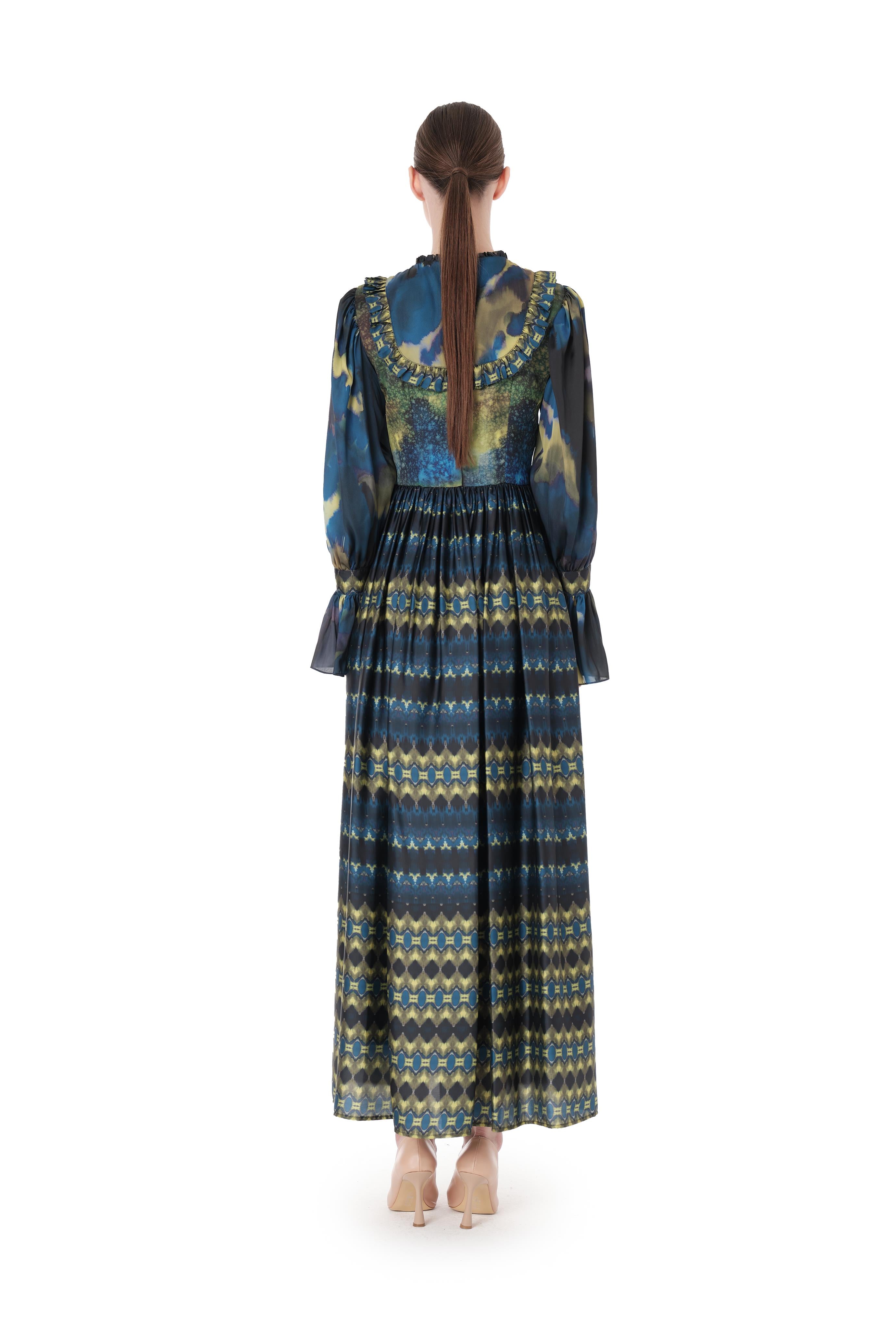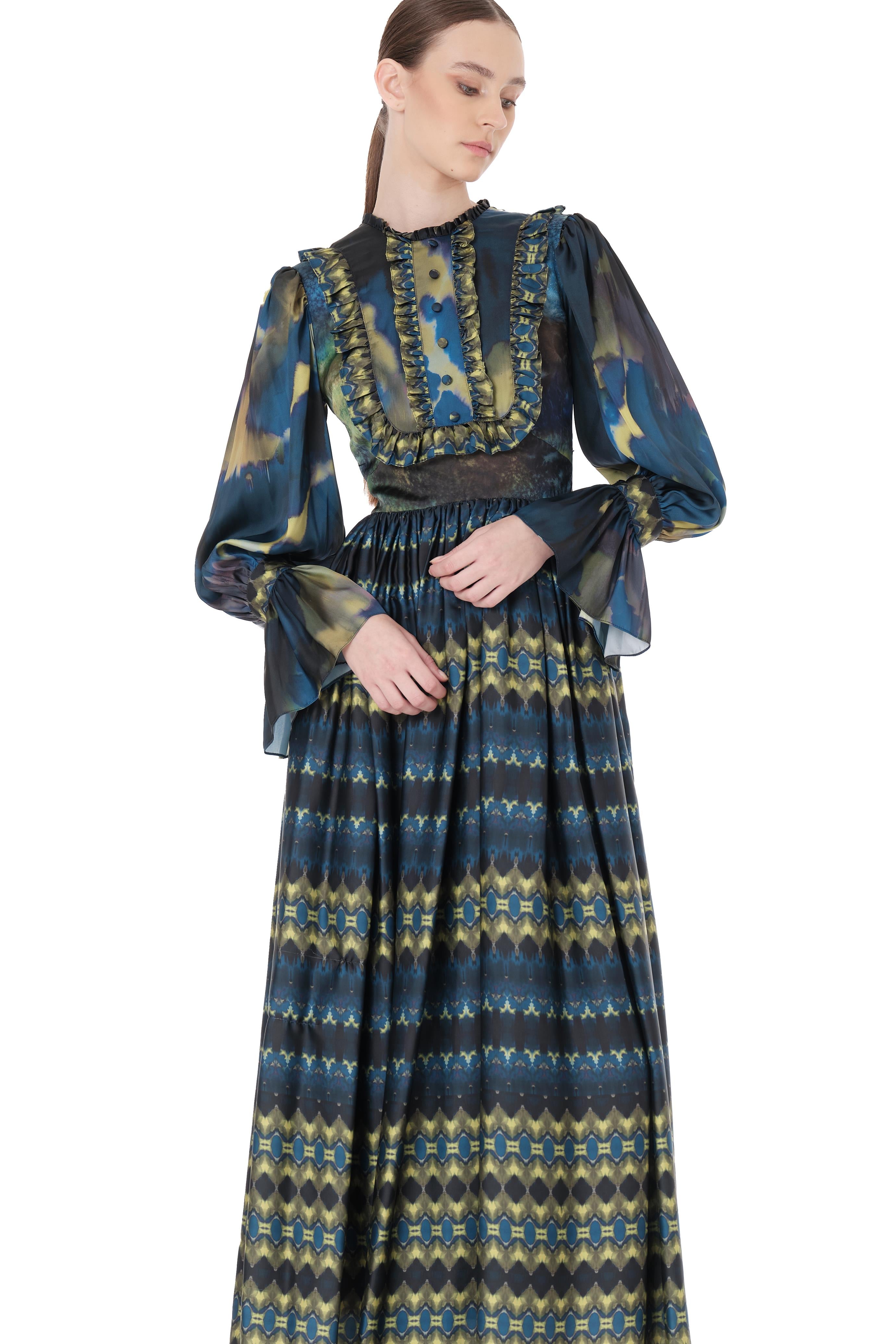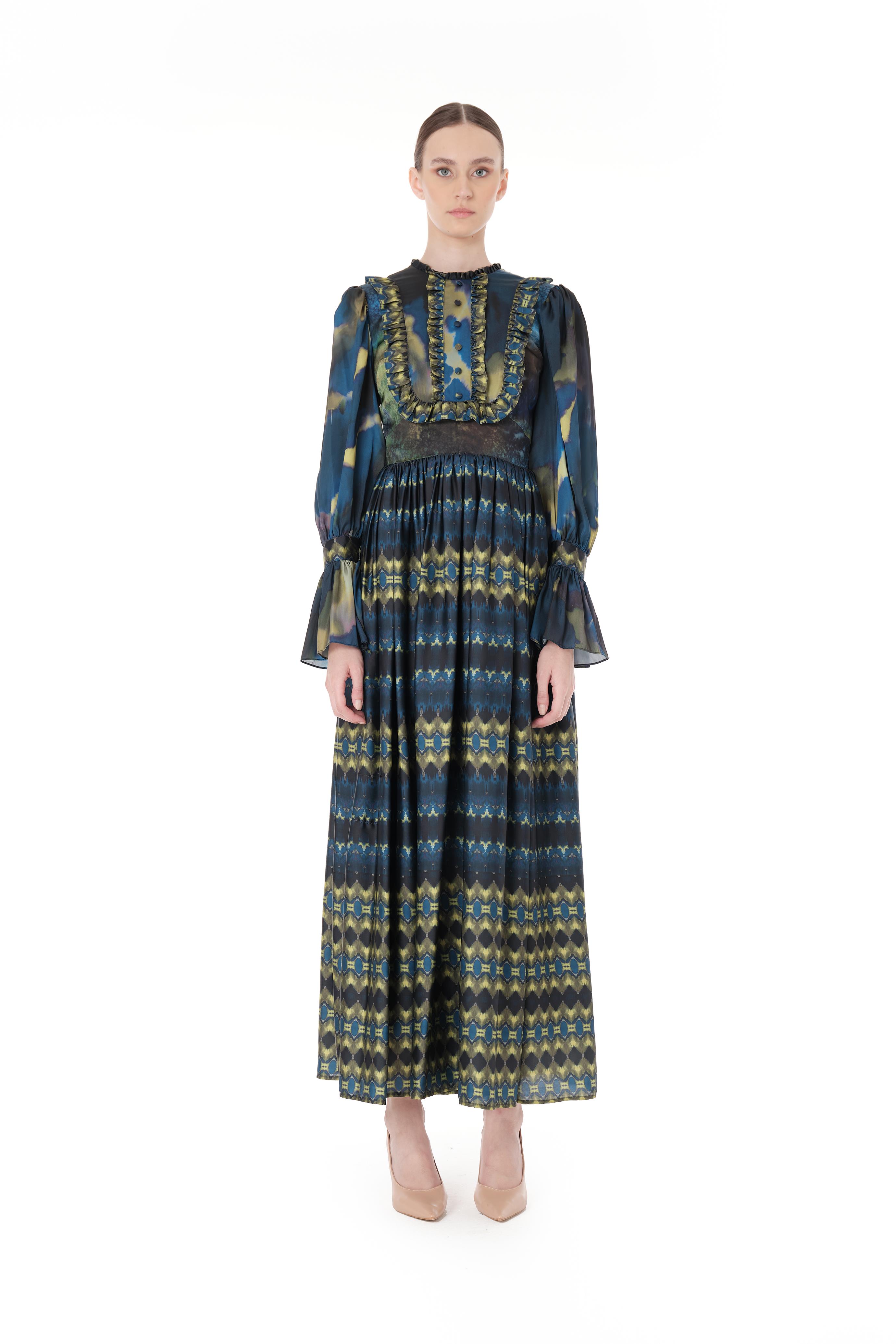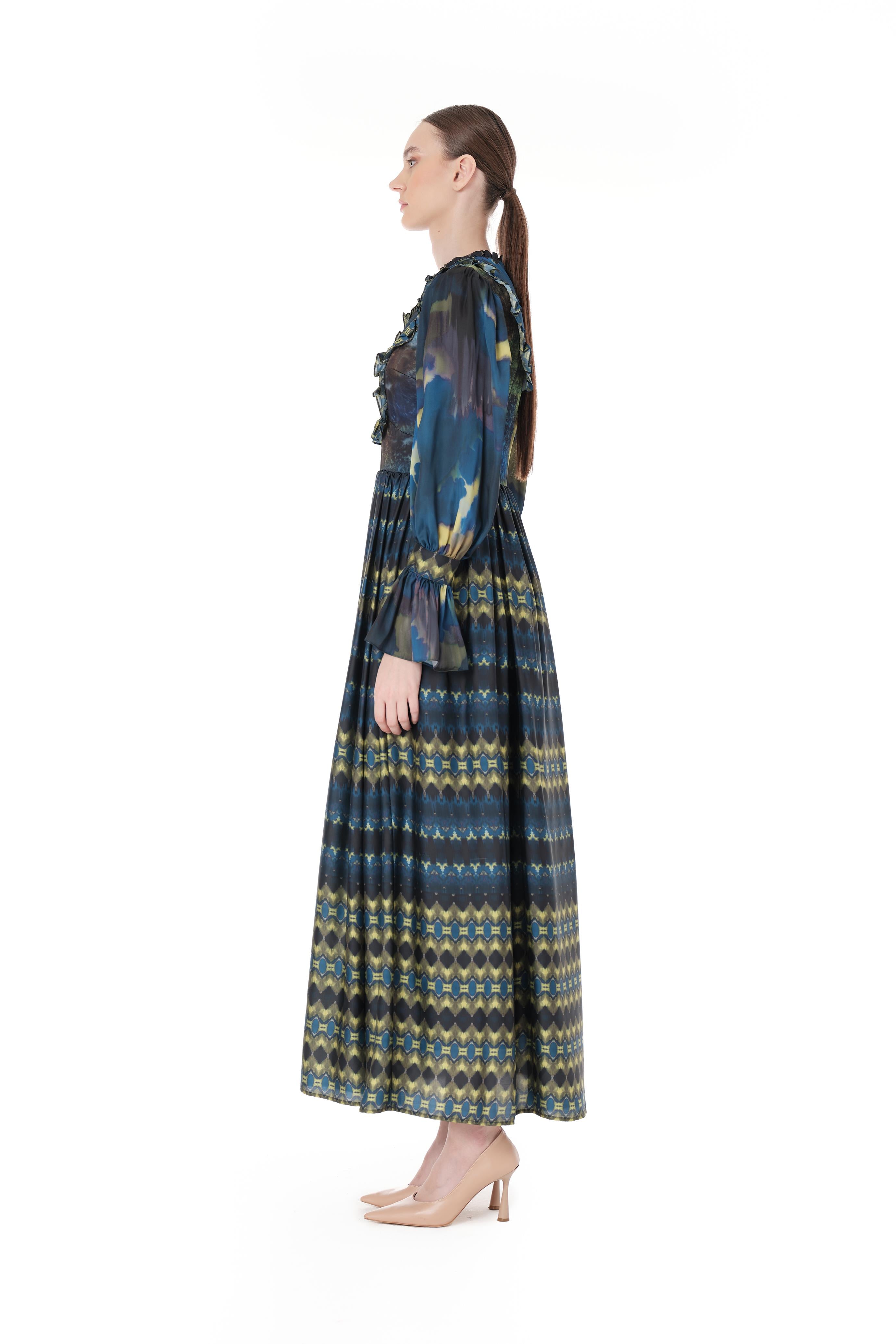 Fırfır Detayli Dijital Desen Uzun Elbise