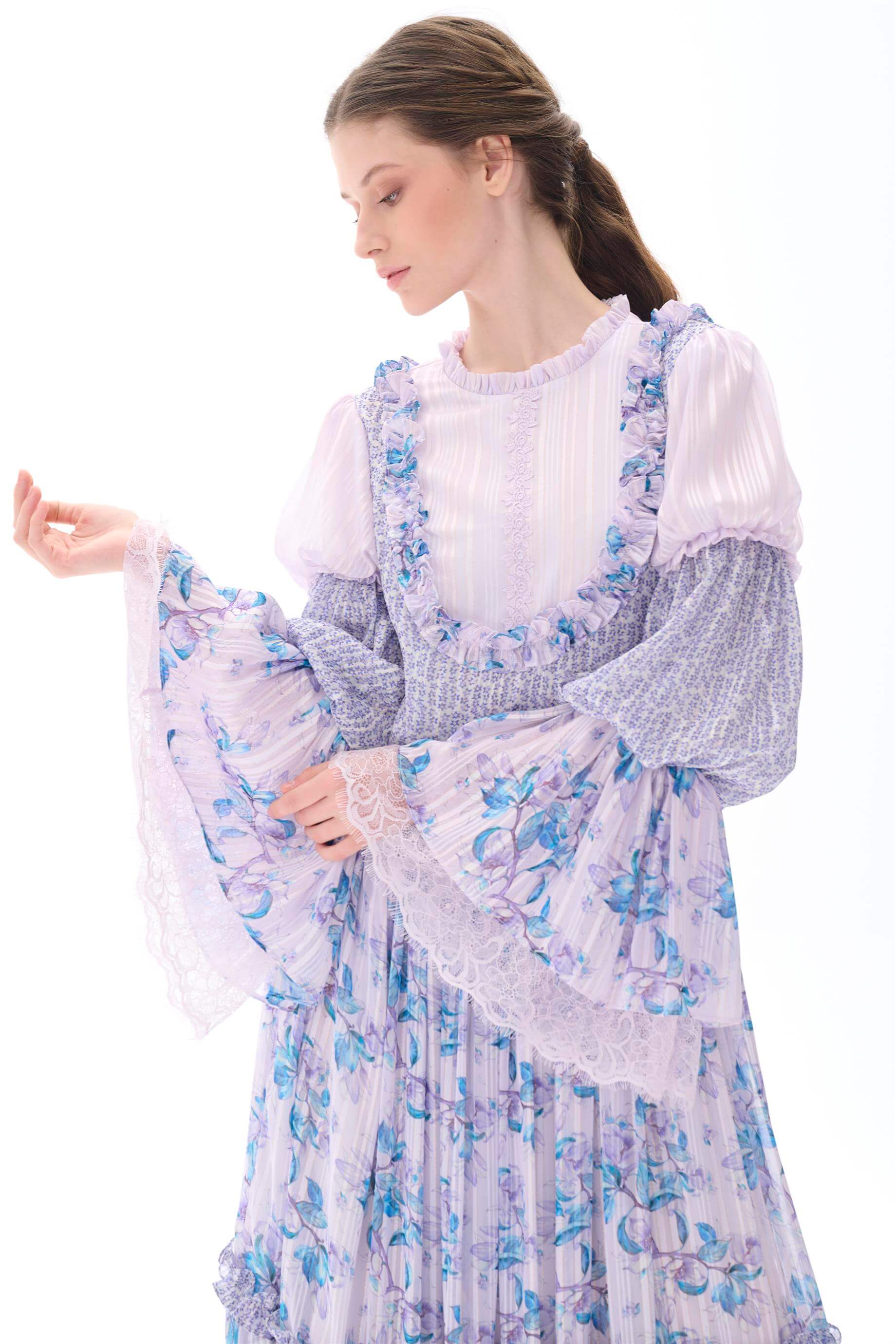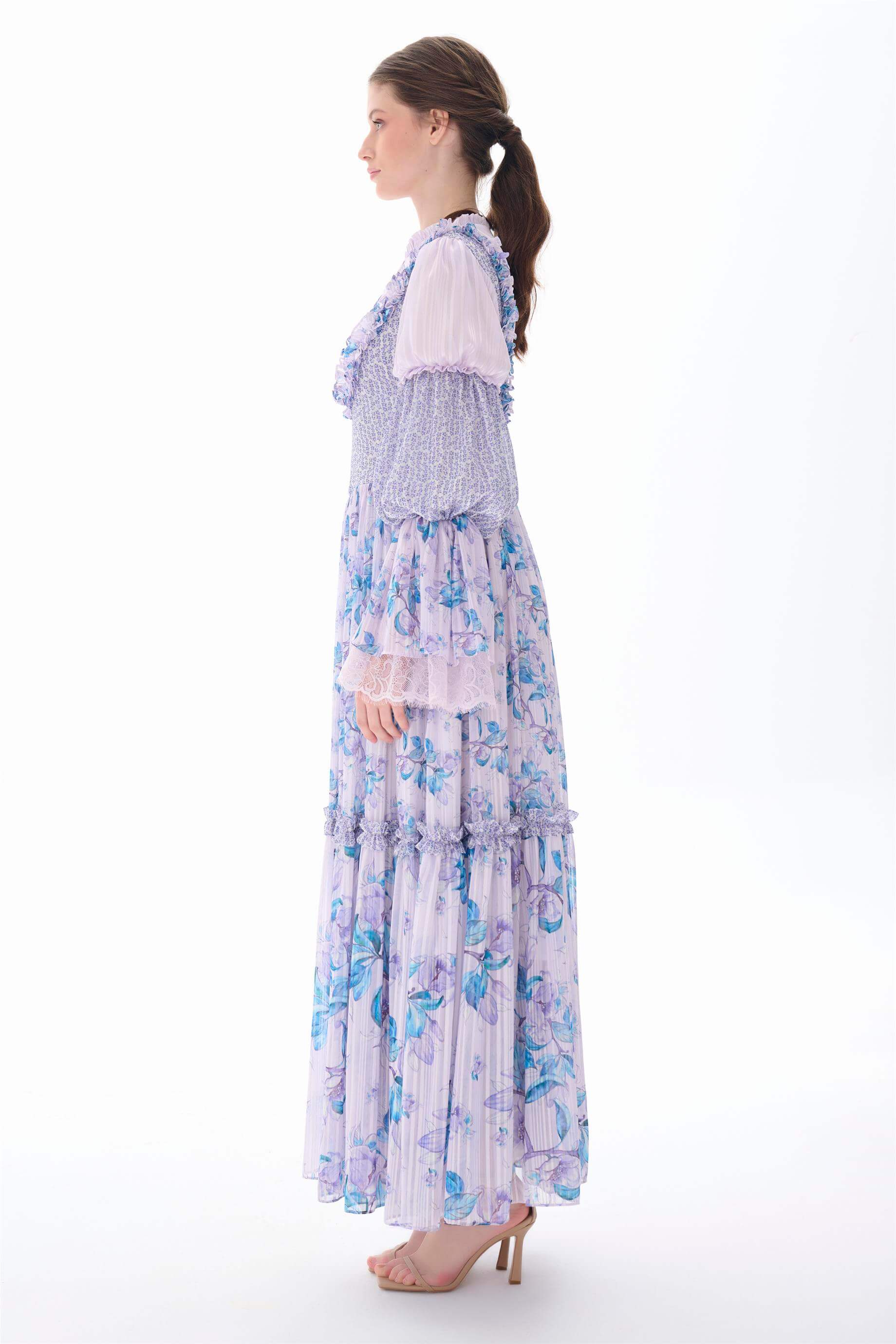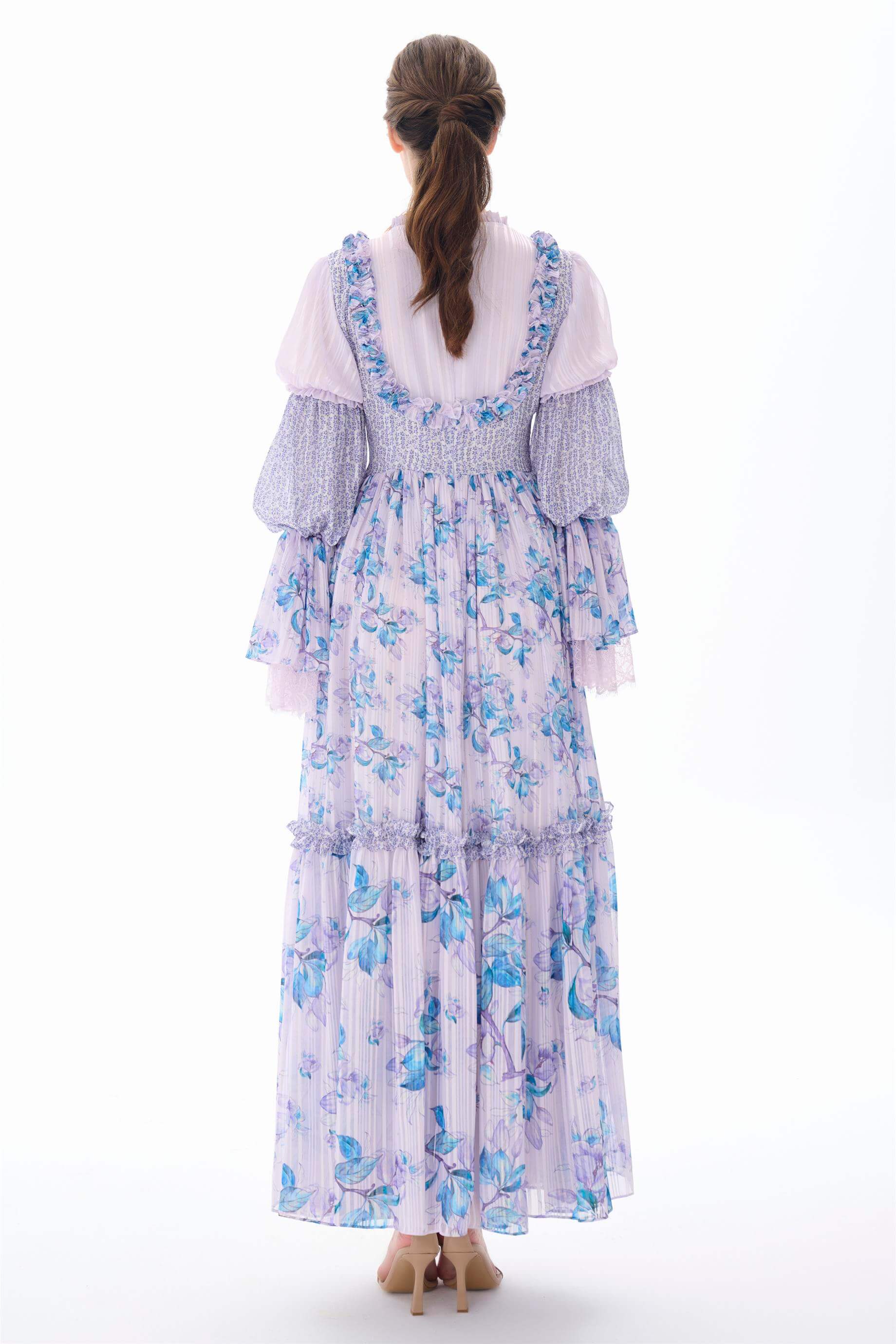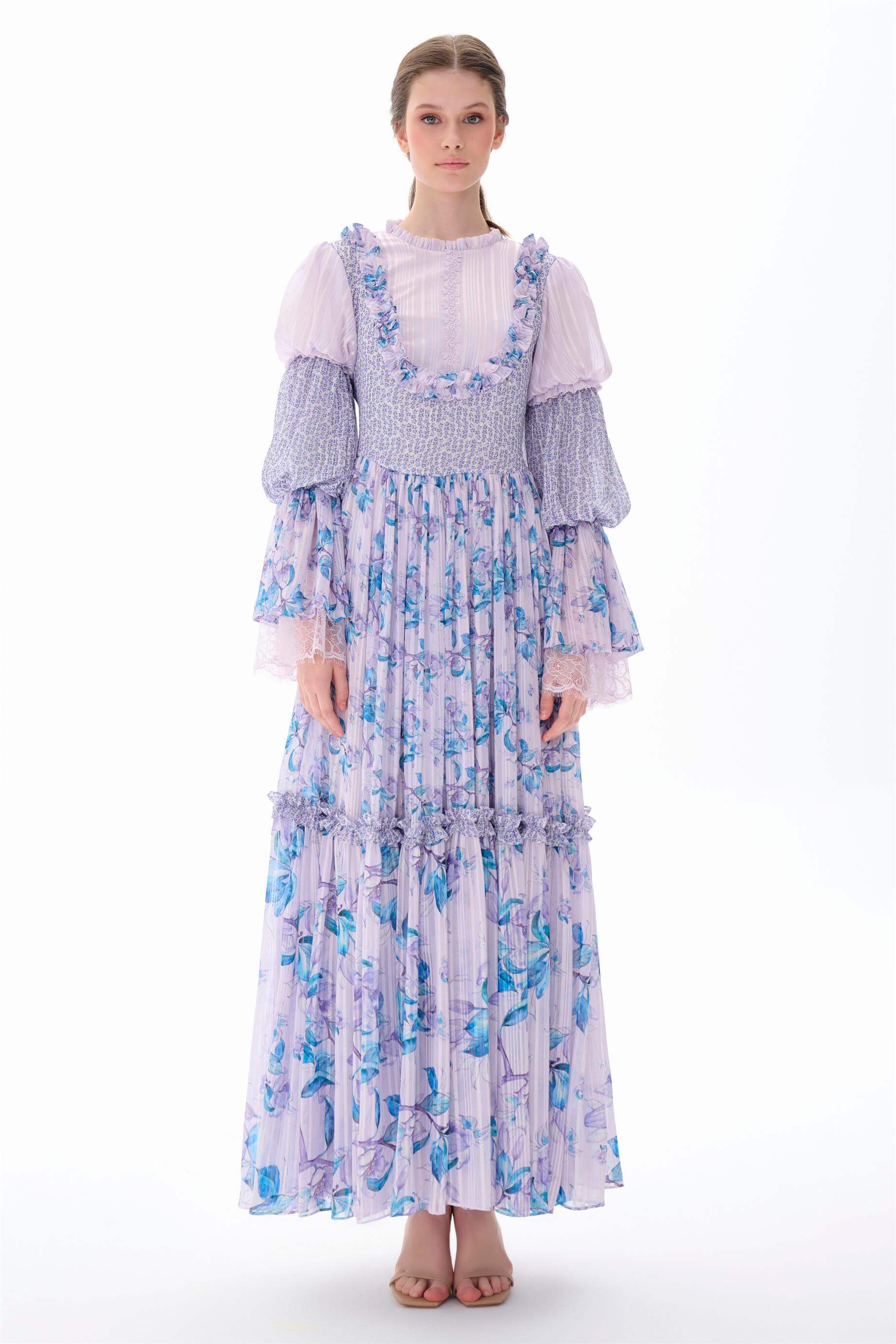 Kolları Kat Kat Fırfır Detaylı Elbise Lila