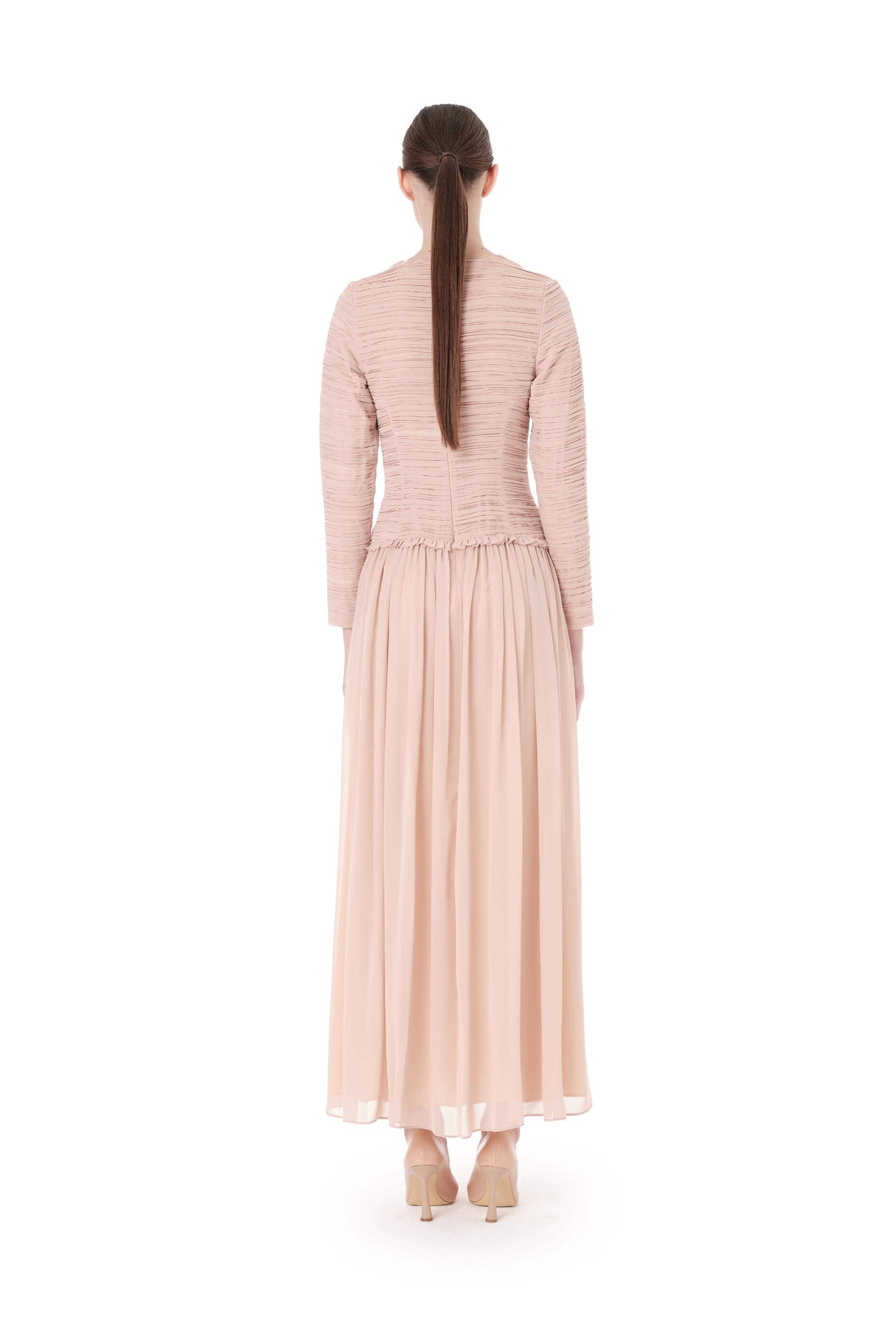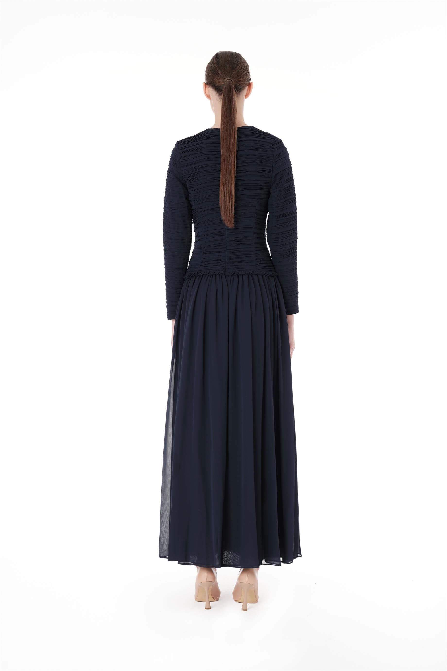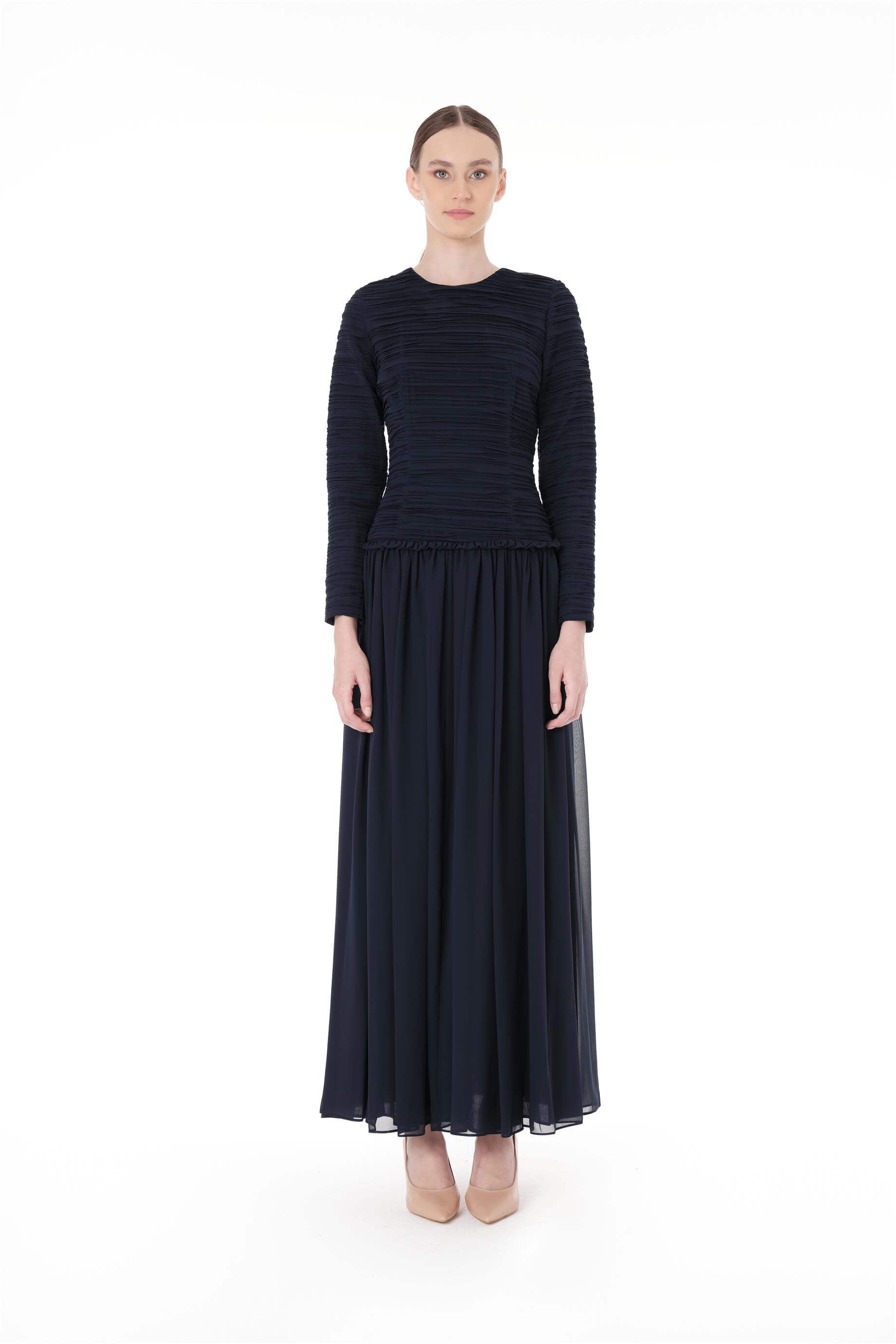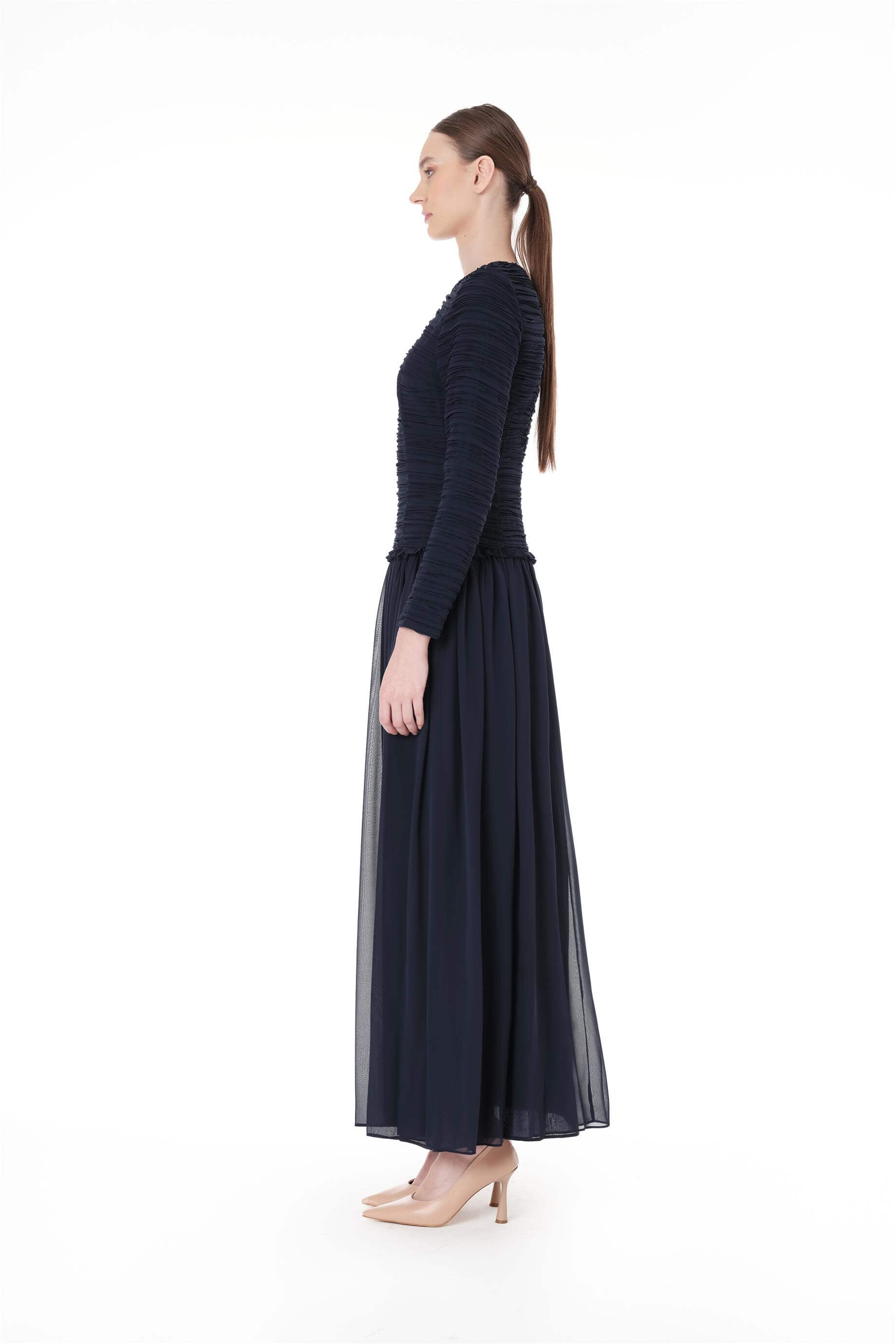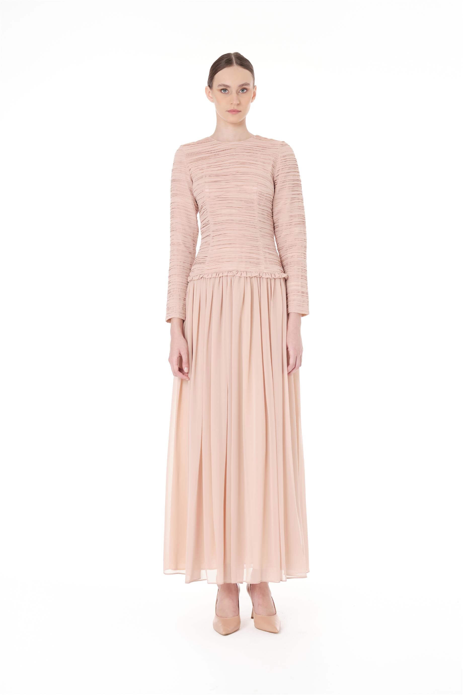 • Ürün Açıklaması: Üst bedeni plise detaylı. Etek beli büzgülü ve fırfır detaylı. Arkadan fermuar kapamalı uzun kollu elbise.Bedenler arası 4 cm fark bulunmaktadır.
