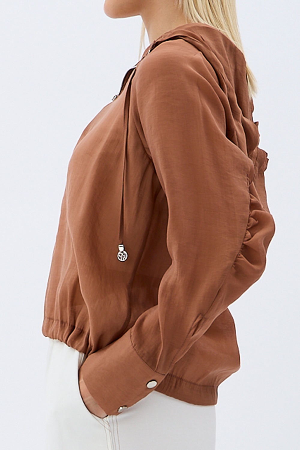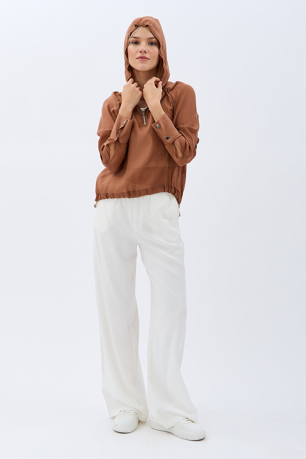 Doğal dokulu %100 keten kumaştan üretilen bu kapüşonlu bluz, hafif yapısı ve nefes alabilir dokusuyla yaz mevsimi için ideal bir tercihtir. Fermuarlı yaka detayı sportif bir hava katarken, büzgü detaylı uzun kollar ve lastikli manşet-etek ucu ile modern ve şık bir görünüm sunar. Hem günlük hem şehir stiline kolayca uyum sağlar.