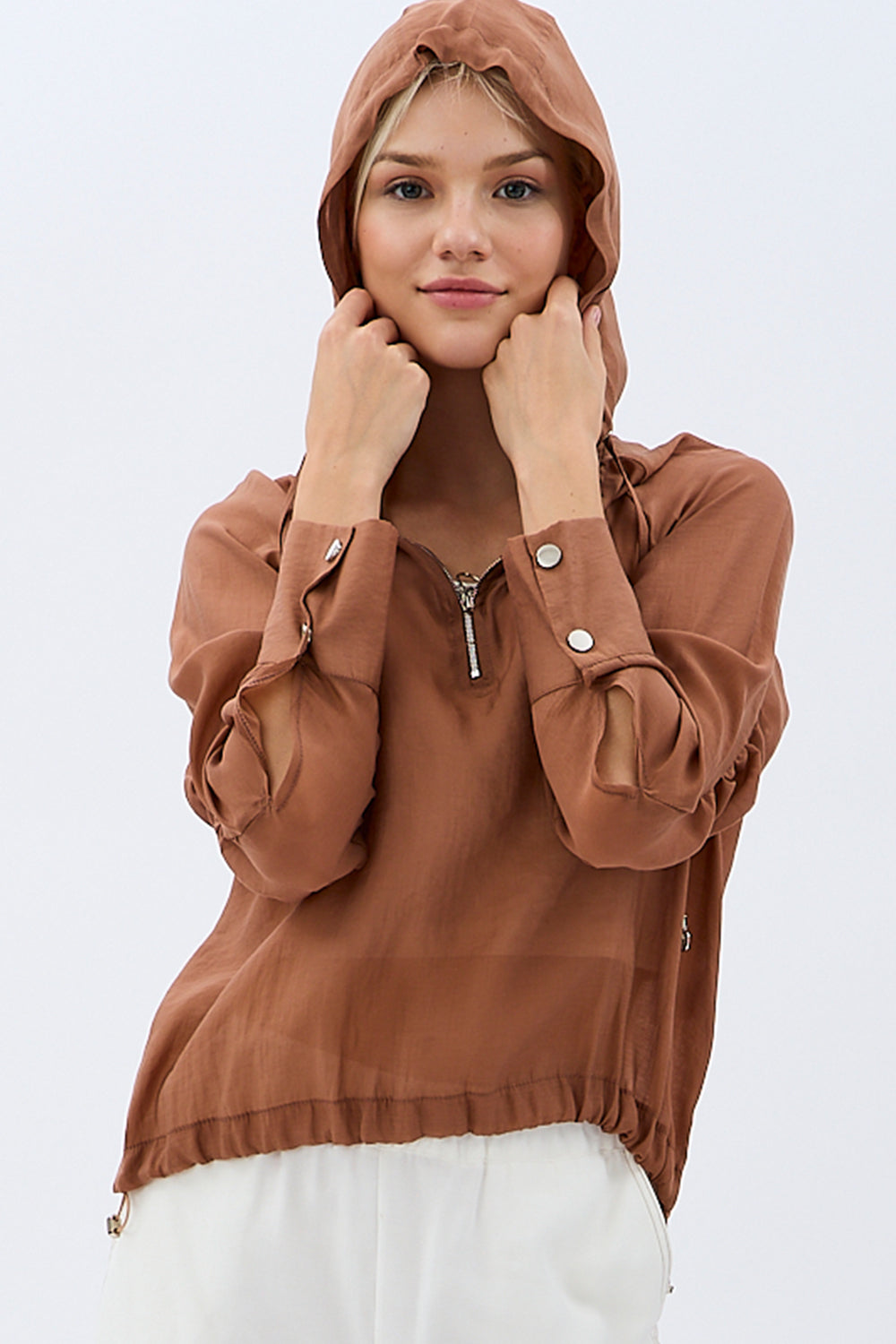 Model: Kapüşonlu, fermuarlı yaka, uzun kol, bilekten düğmeli, büzgü detaylı kol, lastikli manşet ve etek ucu