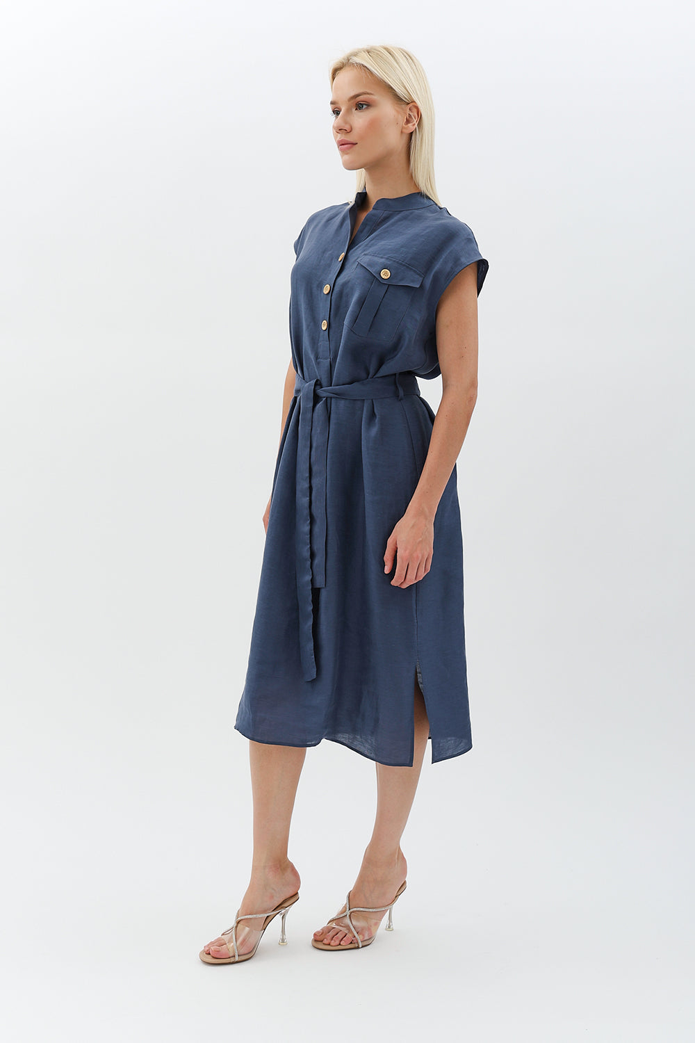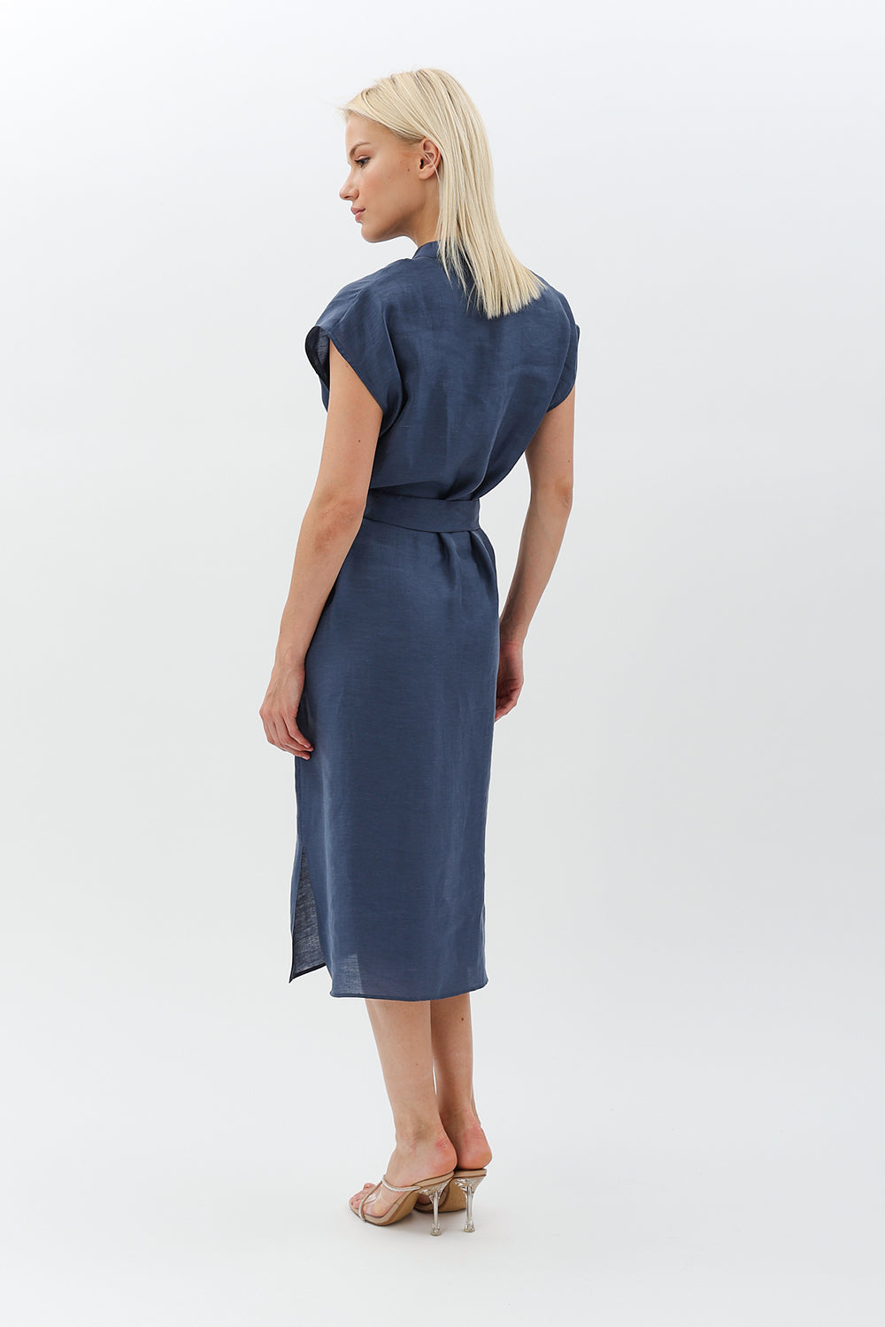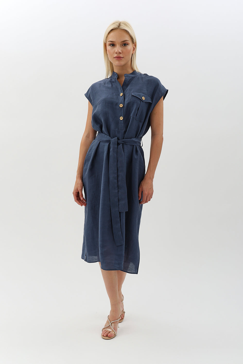%100 keten kumaştan üretilen bu elbise, hakim yaka ve düşük kol tasarımıyla zarif bir duruş sunar. Kuşgözü düğme detayları ve belden bağlamalı kemeriyle şıklığı tamamlar. Yırtmaçlı midi etek kesimi sayesinde hem rahat hem modern bir görünüm sağlar.