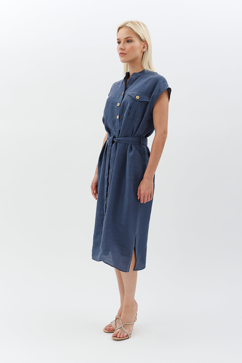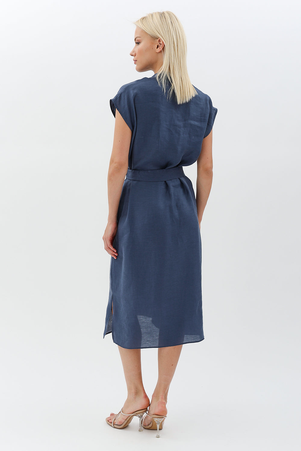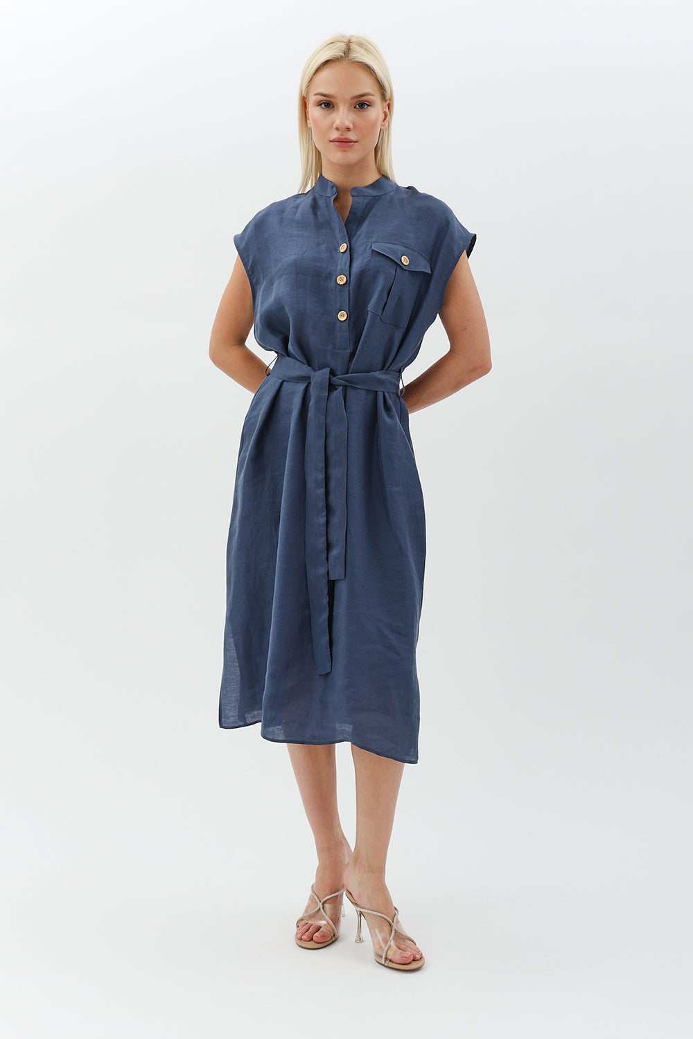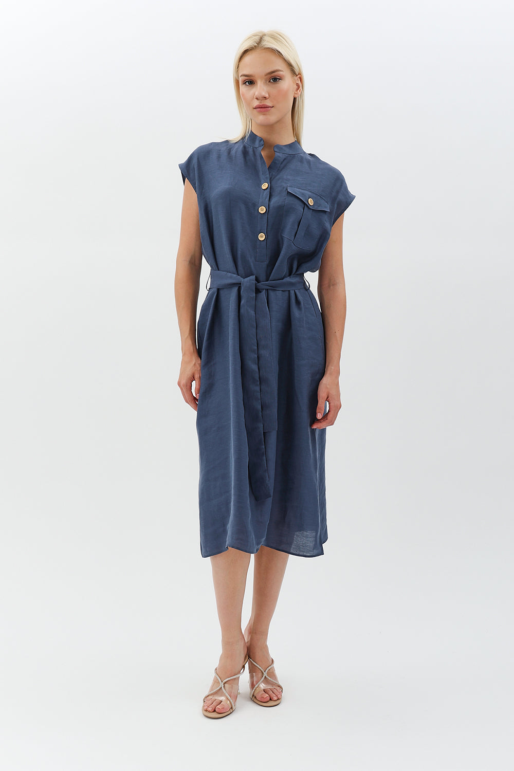 %100 keten kumaştan üretilen bu elbise, hakim yaka ve düşük kol tasarımıyla zarif bir duruş sunar. Kuşgözü düğme detayları ve belden bağlamalı kemeriyle şıklığı tamamlar. Yırtmaçlı midi etek kesimi sayesinde hem rahat hem modern bir görünüm sağlar.