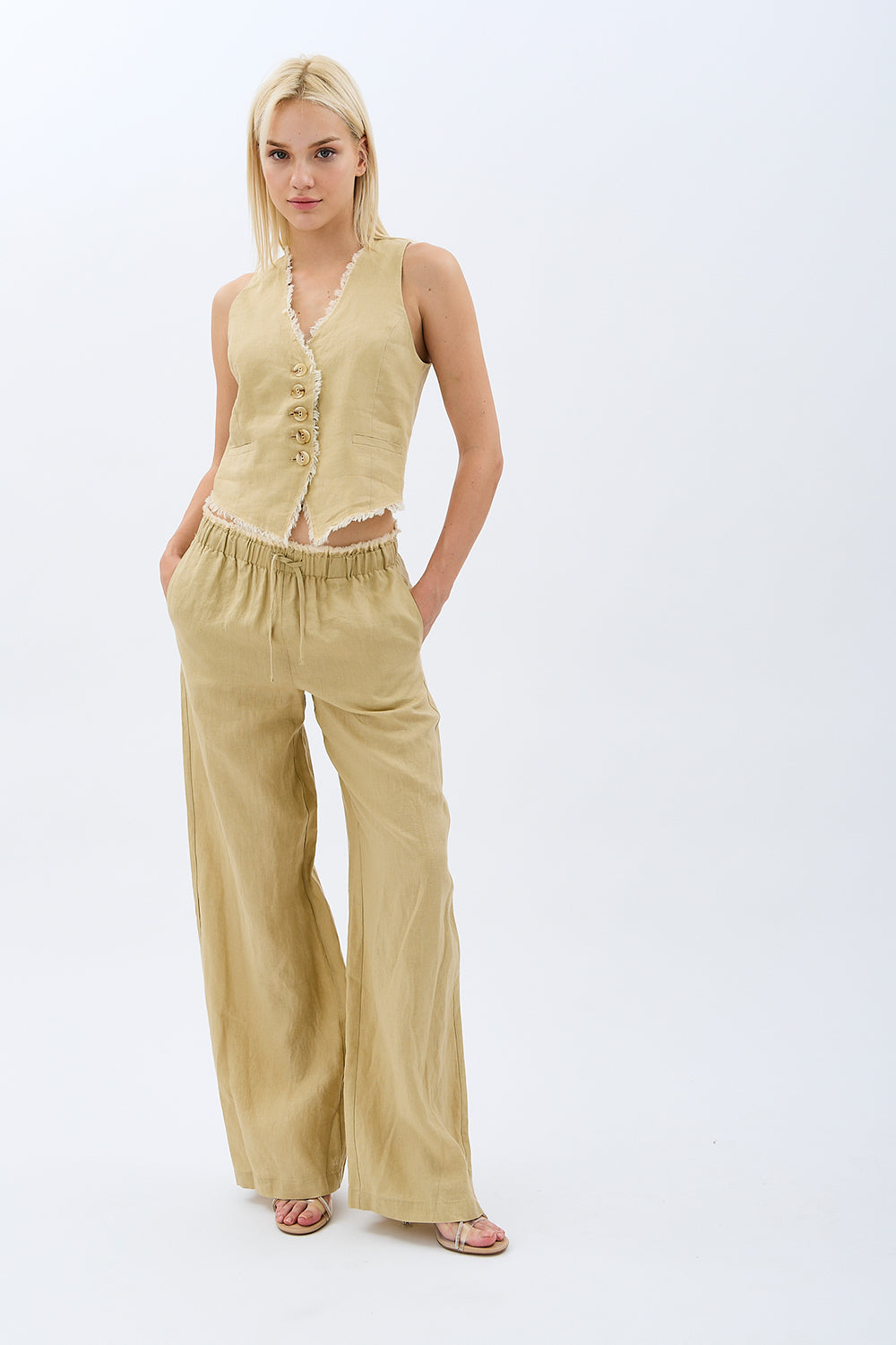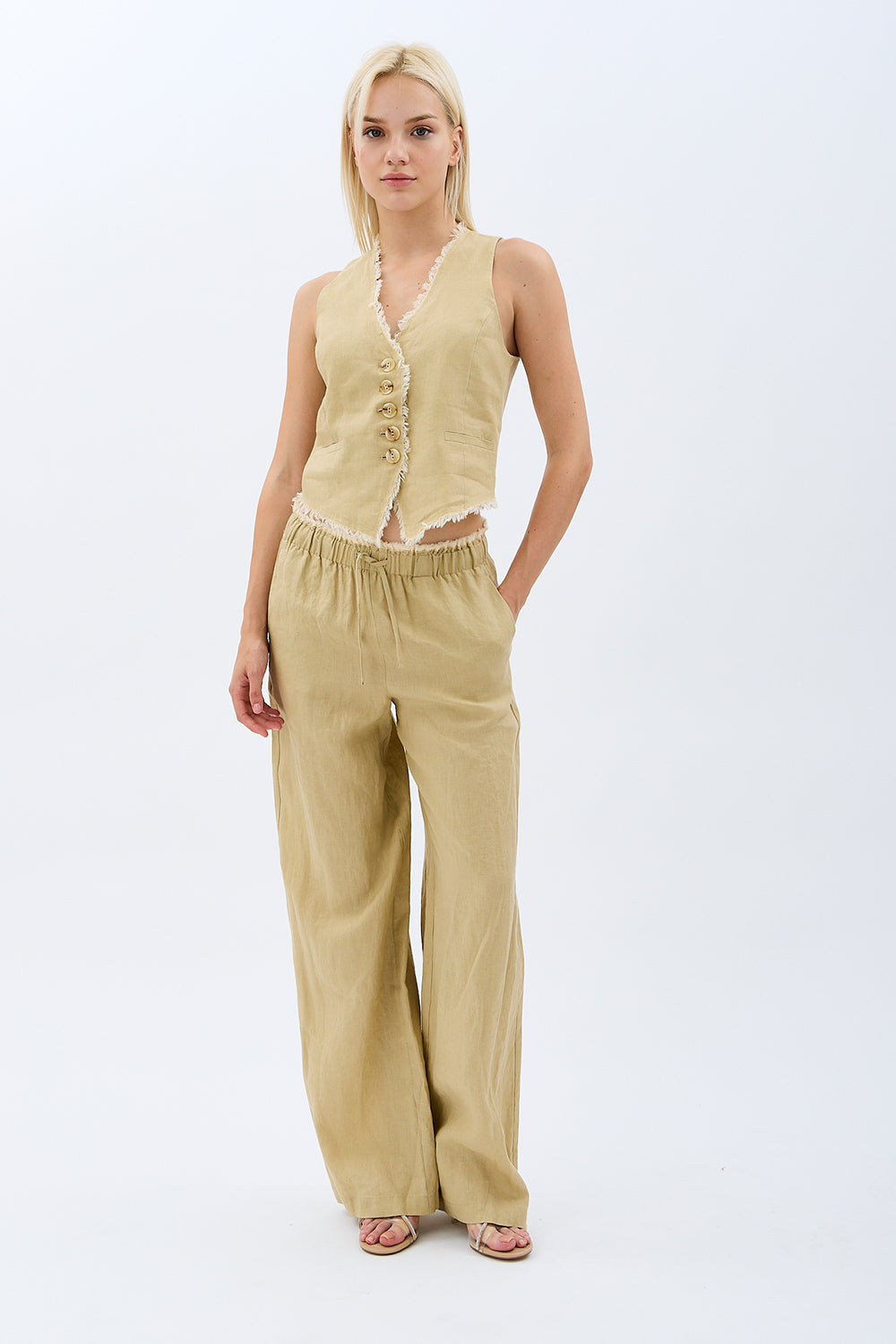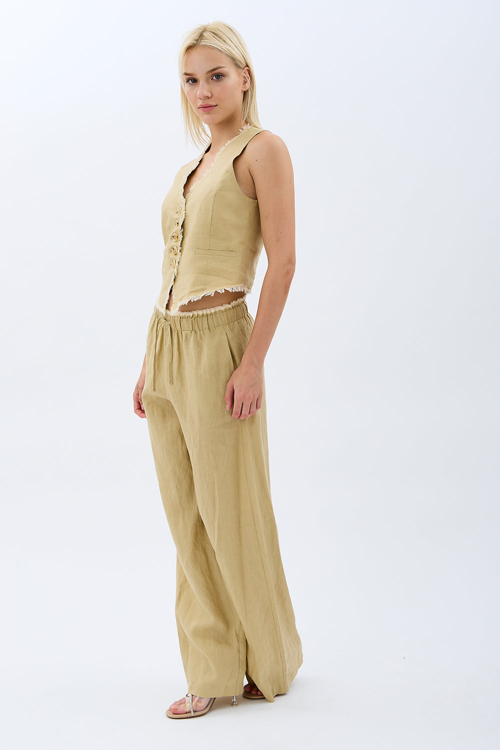 Şıklığı ve rahatlığı bir arada sunan bu kolsuz kadın yelek, kemik düğme detayları ve yaka ile etek kenarındaki saçak süslemeleriyle modern bir hava katıyor. %100 keten kumaştan üretilen ürün, kaliteli ve nefes alabilen yapısıyla konforlu bir kullanım sağlar. Minimal ve güçlü tasarımıyla her kombininize zarif bir dokunuş ekler.