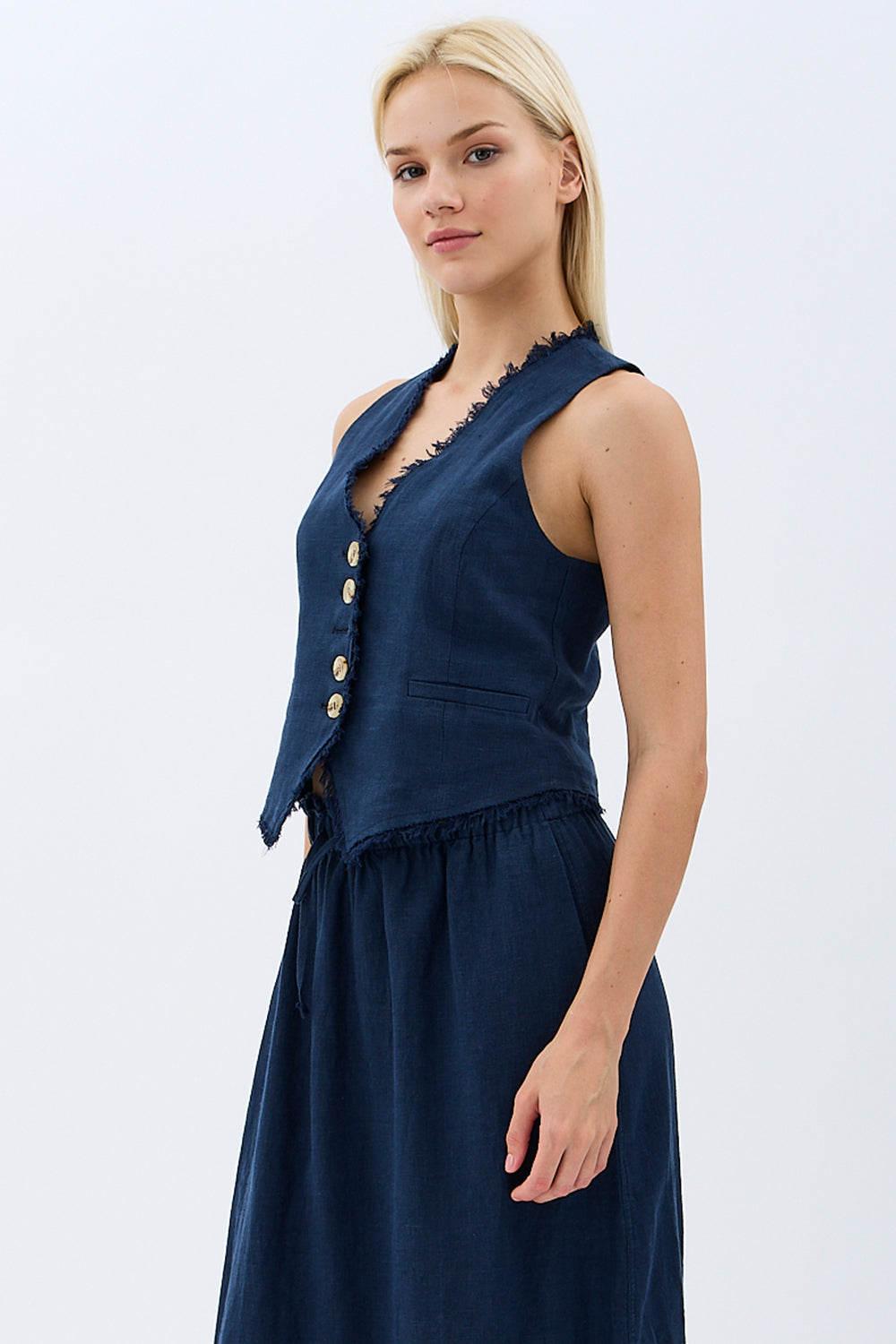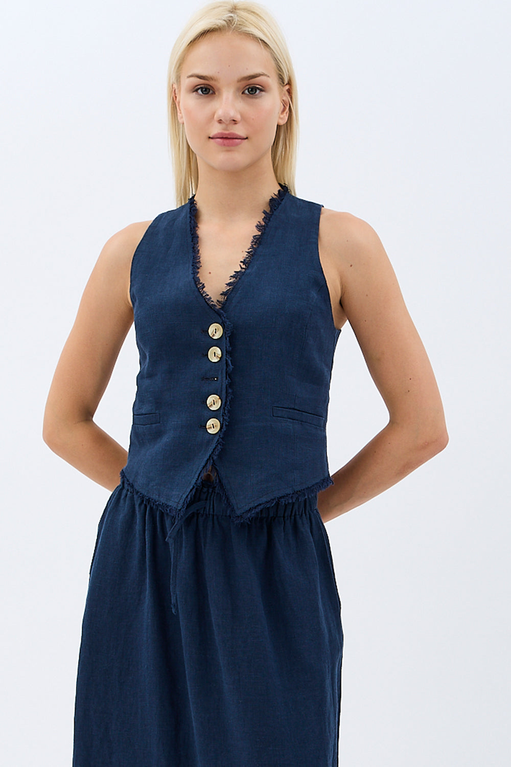 Kolsuz V Yaka Kadın Keten Yelek – Kemik Düğmeli, Saçak Detaylı