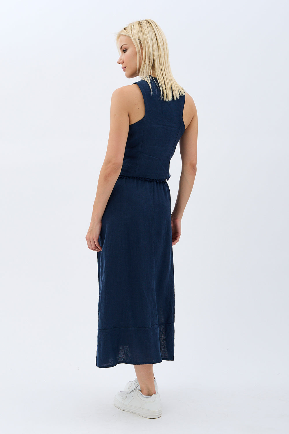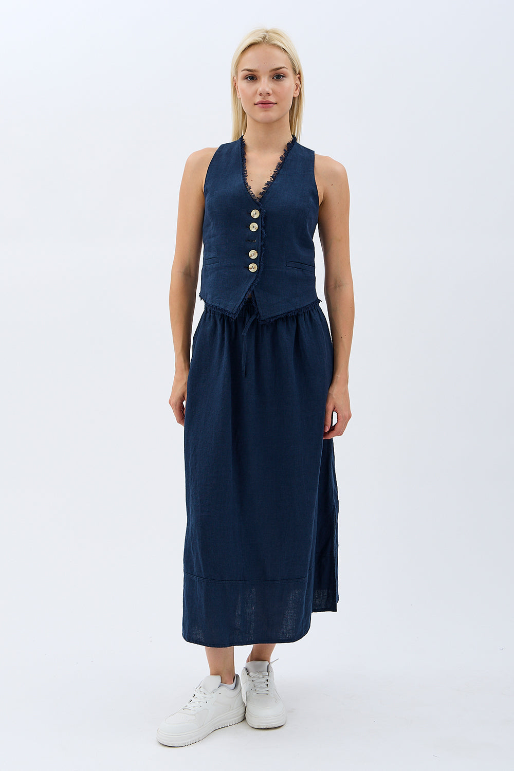 %100 keten kumaştan üretilen bu şık yelek, nefes alabilen yapısı ve kaliteli dokusuyla konforlu kullanım sunar. Kolsuz ve V yaka tasarımı ile hafif ve rahat bir stil yaratır. Kemik düğmeler ve yaka ile etek kenarındaki saçak detayları minimal ve güçlü bir tasarım sunar.