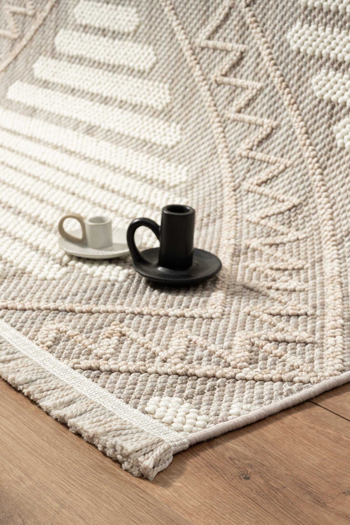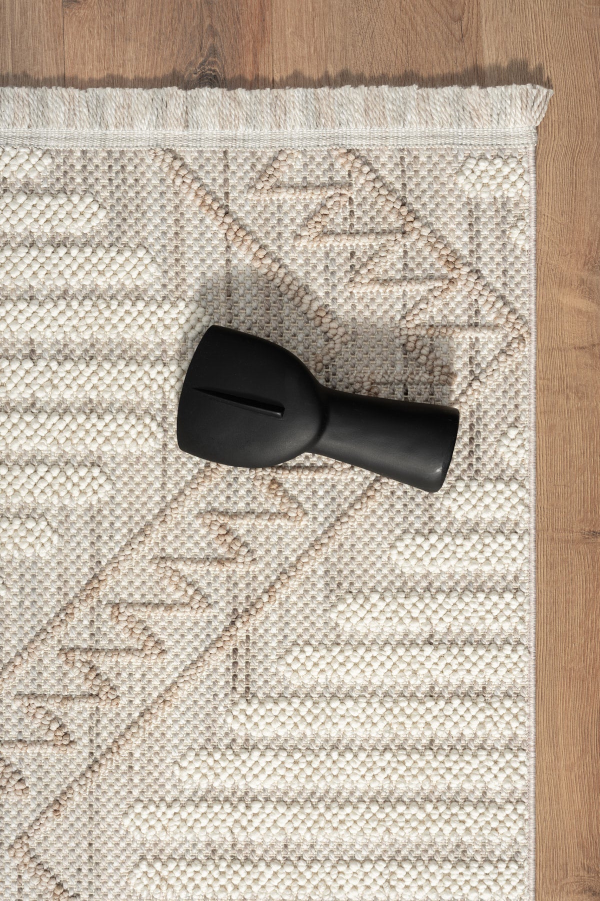 İpliği polyesterdir, taban malzemesi %100 pamuktur. Geometrik deseni ile halı modası evinize gelir, modern ve İskandinav tarzı mobilyalar ile uyumludur. Oturma odası, yatak odası, antre, hol, mutfak kullanımına uygundur. Yerden ısıtmalı alanlarda kullanılabilir. Taban yalıtımına katkı sağlar.