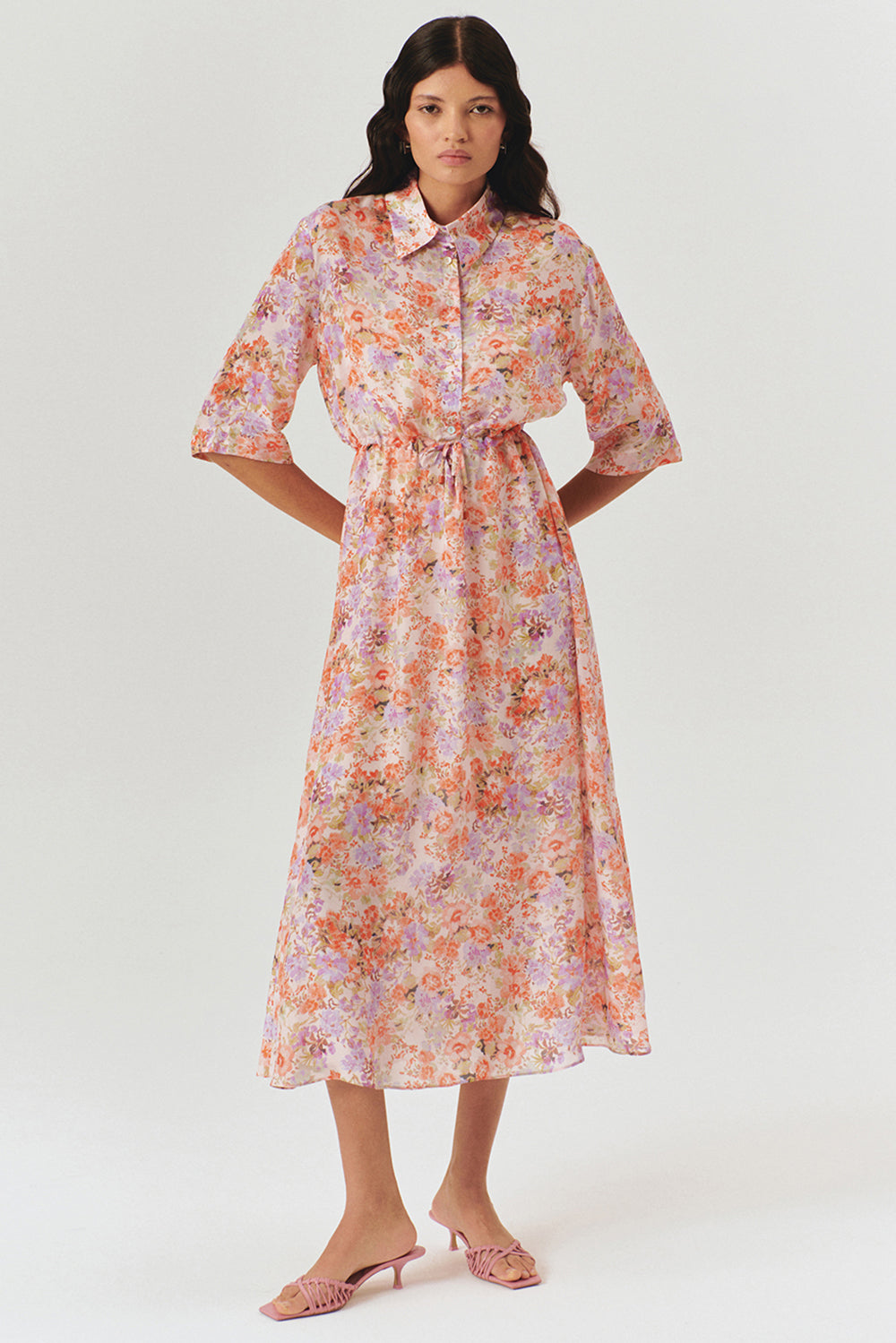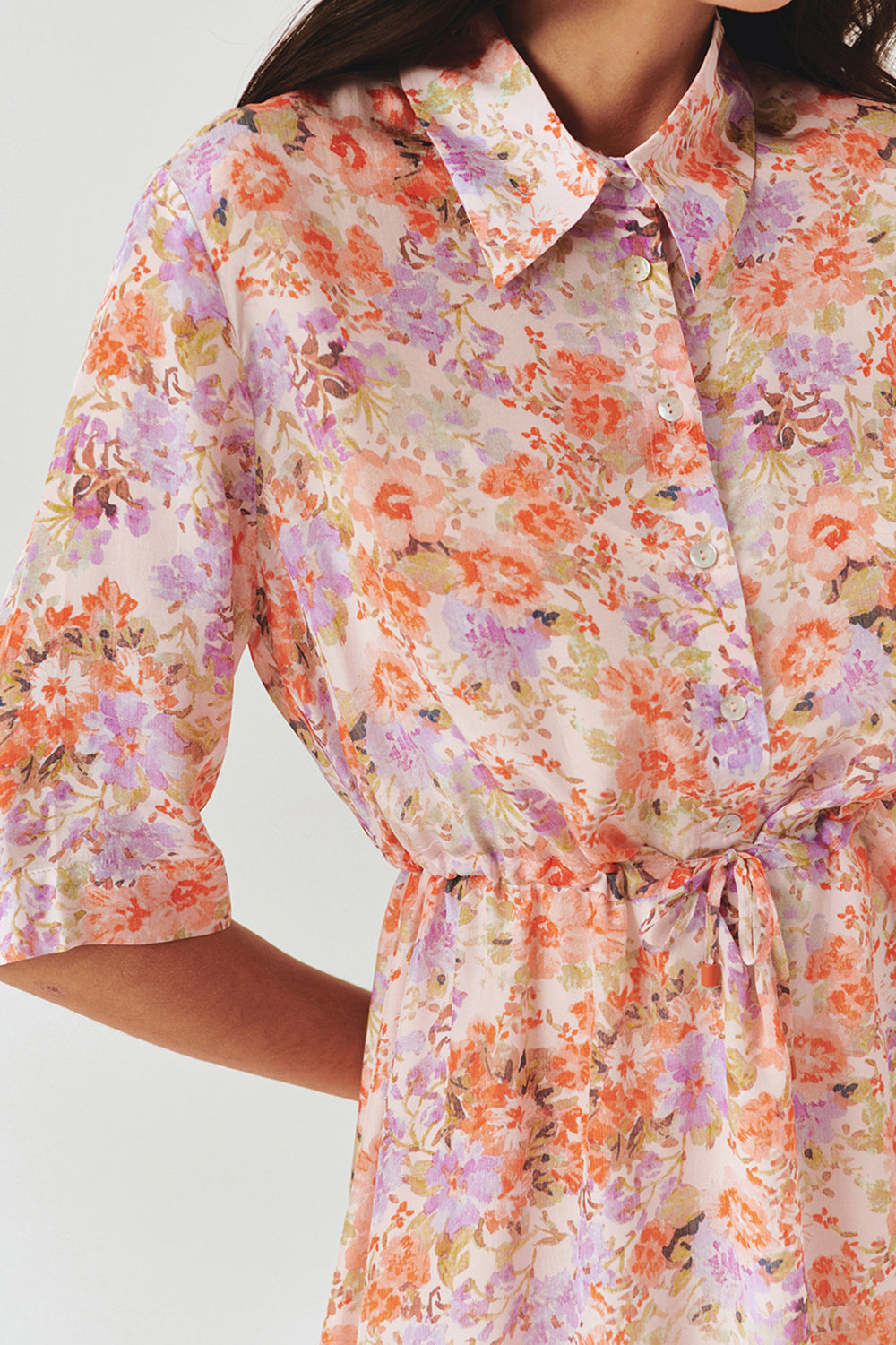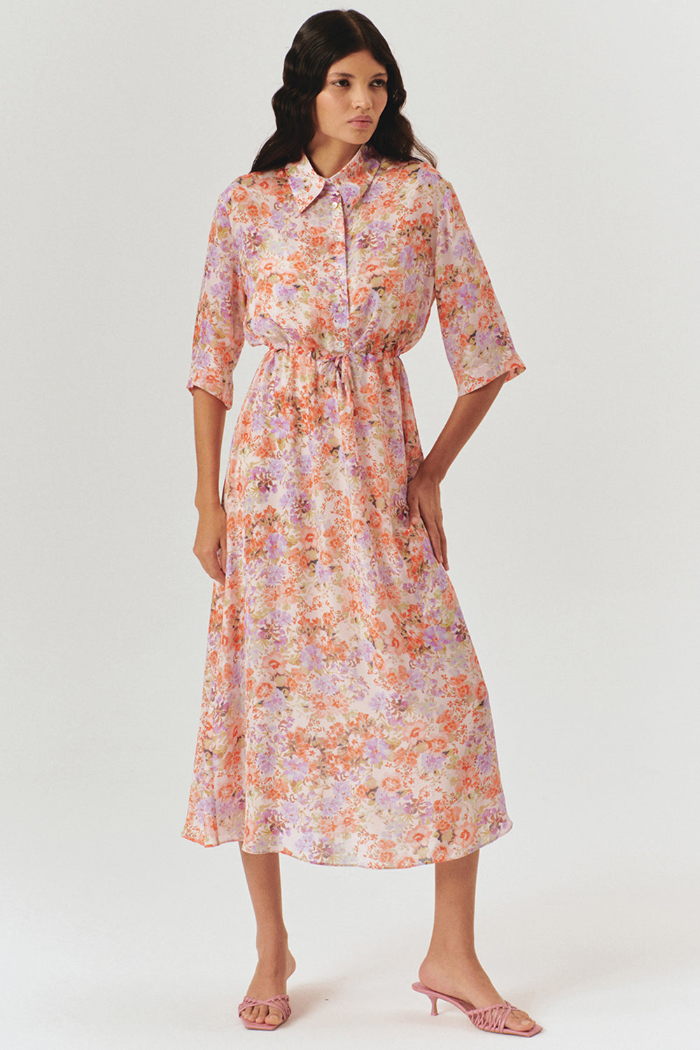 Çiçek desenlerinin neşeli enerjisini taşıyan bağcık detaylı midi gömlek elbise, rahatlığı ve zarafeti mükemmel şekilde birleştiriyor. Canlı çiçek desenleri, gömlek yaka detayı ve ayarlanabilir bağcık bel tasarımıyla gün boyu konfor sunarken, feminen ve zarif bir görünüm sağlıyor.