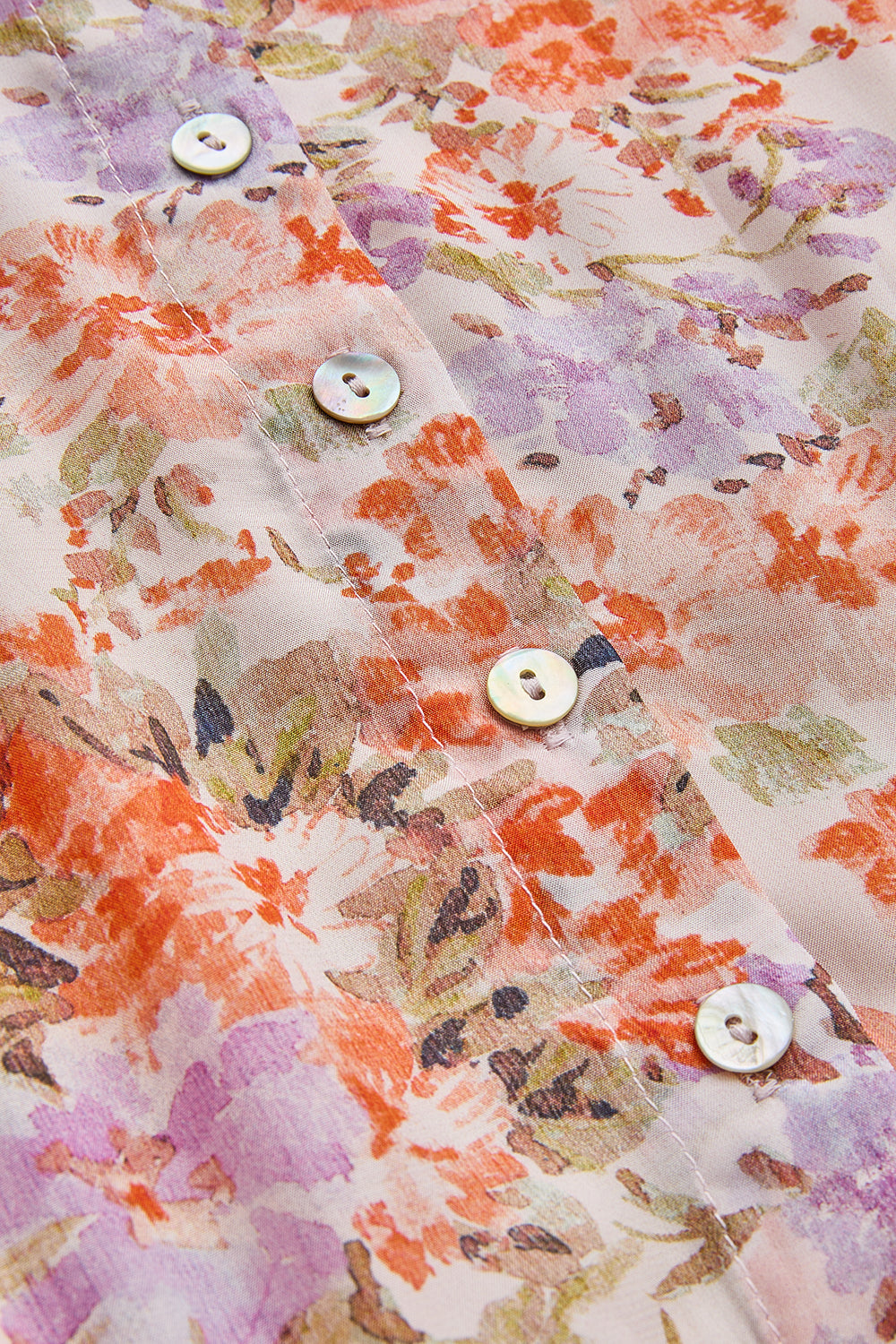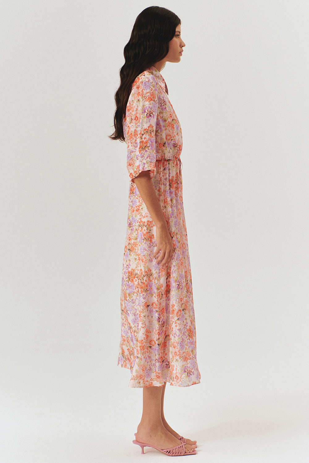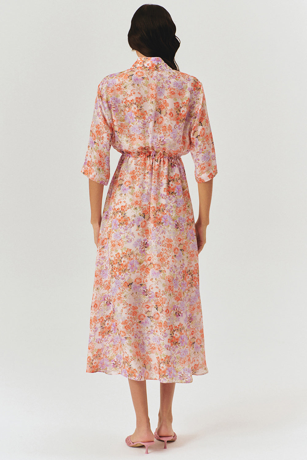 Çiçek desenlerinin neşeli enerjisini taşıyan bağcık detaylı midi gömlek elbise, rahatlığı ve zarafeti mükemmel şekilde birleştiriyor. Canlı çiçek desenleri, gömlek yaka detayı ve ayarlanabilir bağcık bel tasarımıyla gün boyu konfor sunarken, feminen ve zarif bir görünüm sağlıyor.