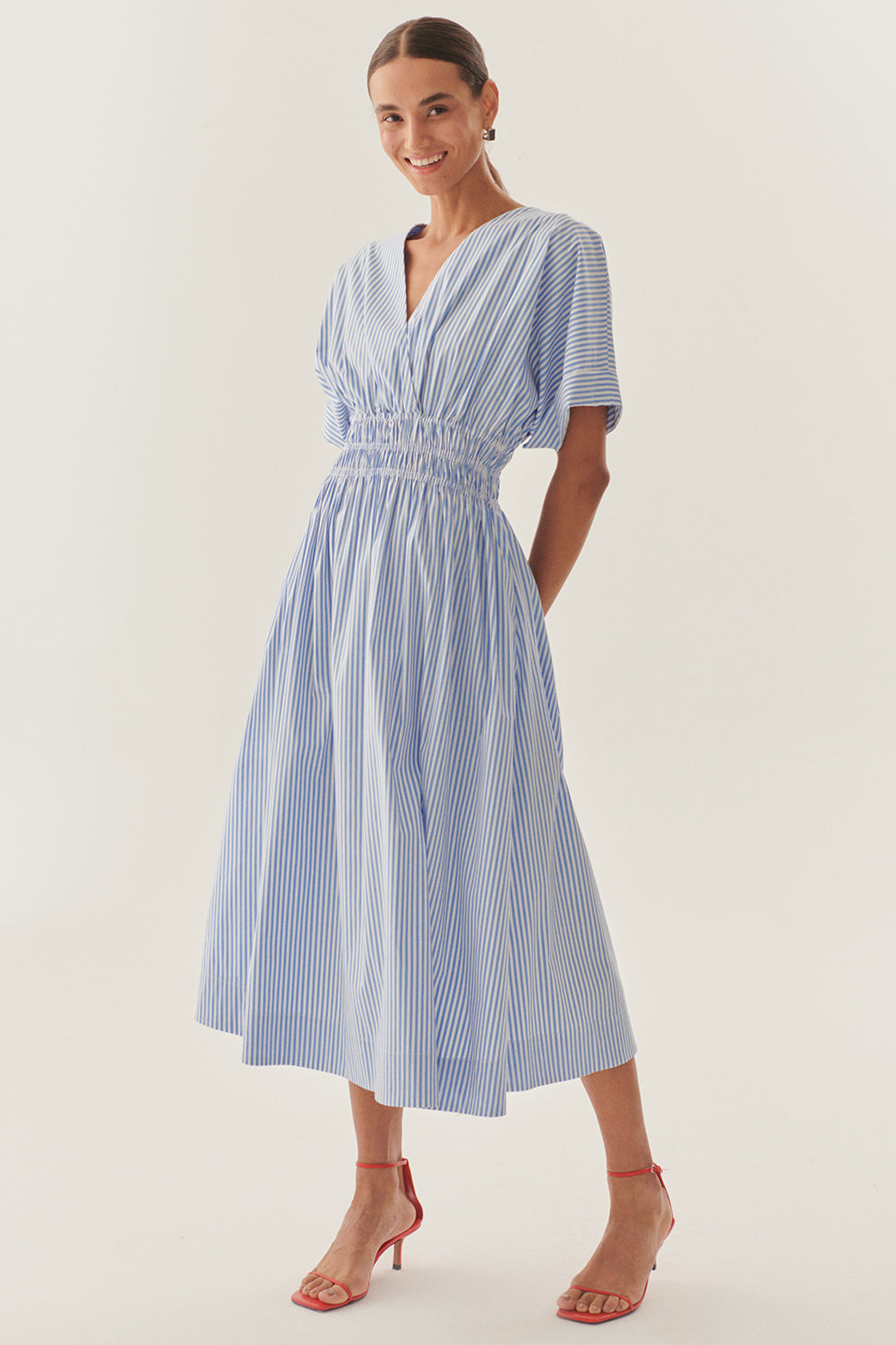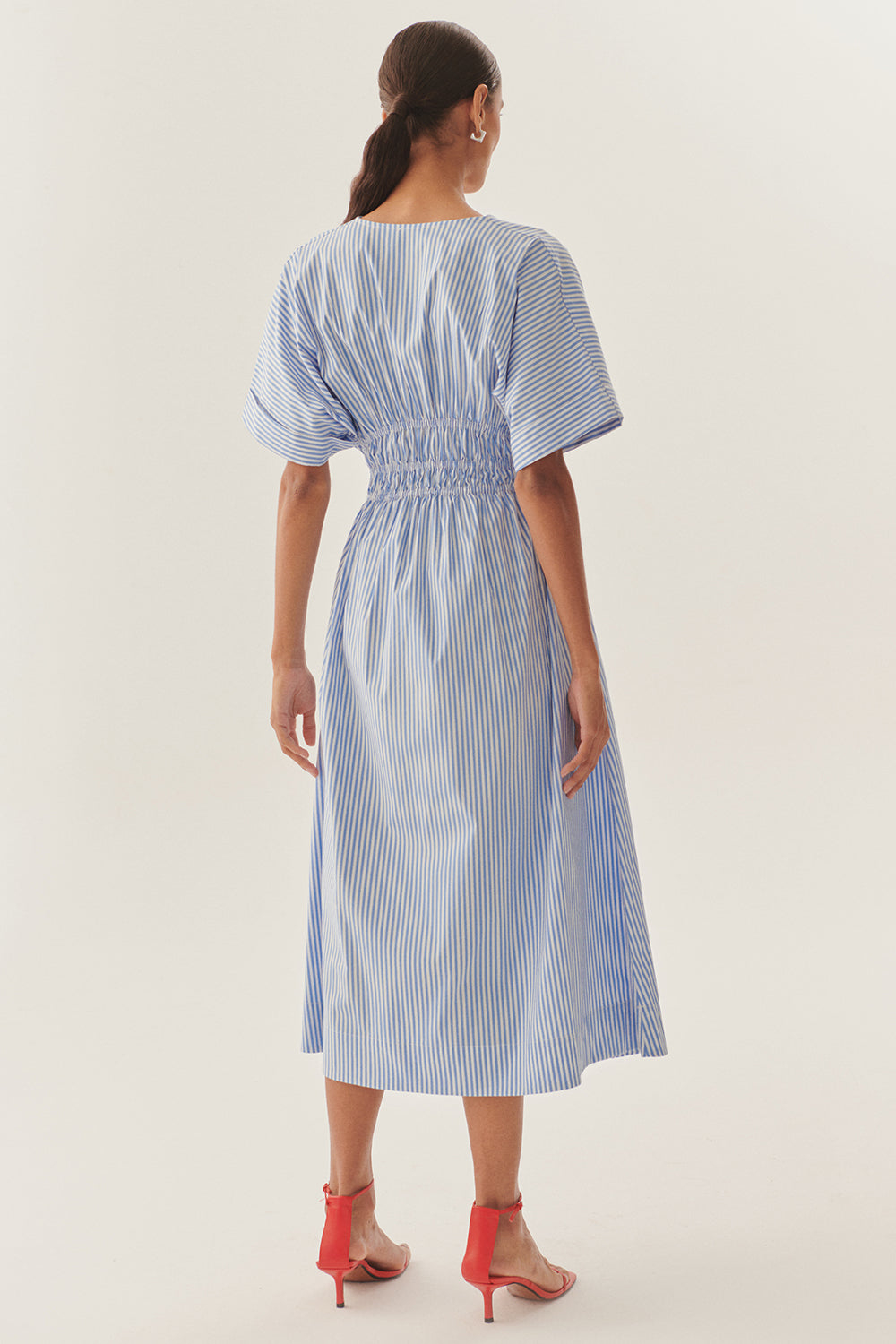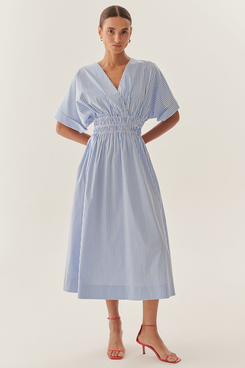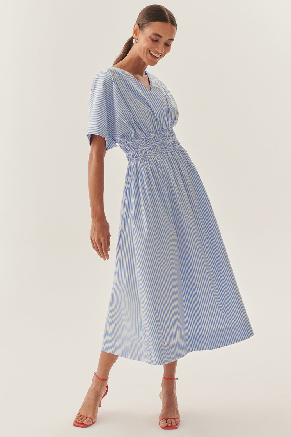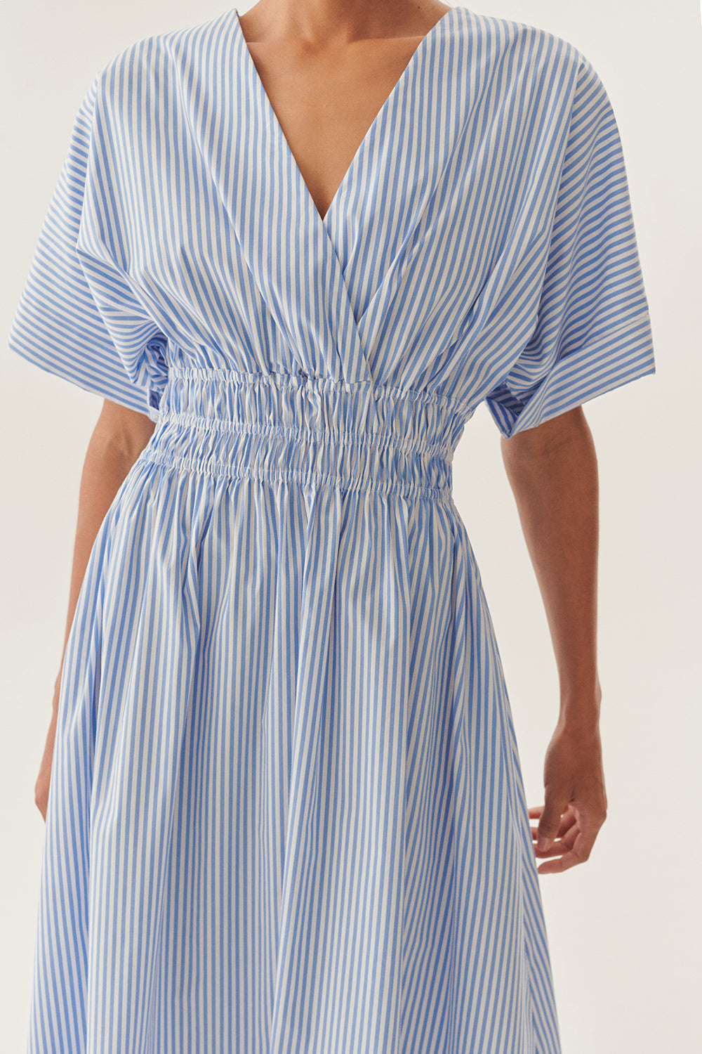 Beli Büzgülü V Yaka Yarasa Kol Midi Elbise