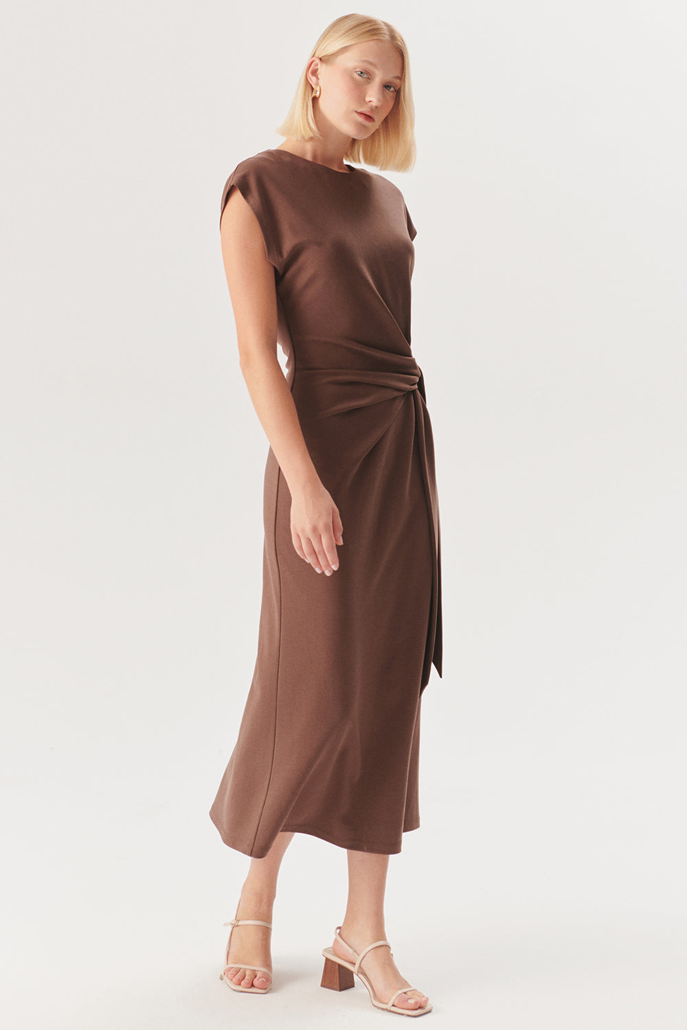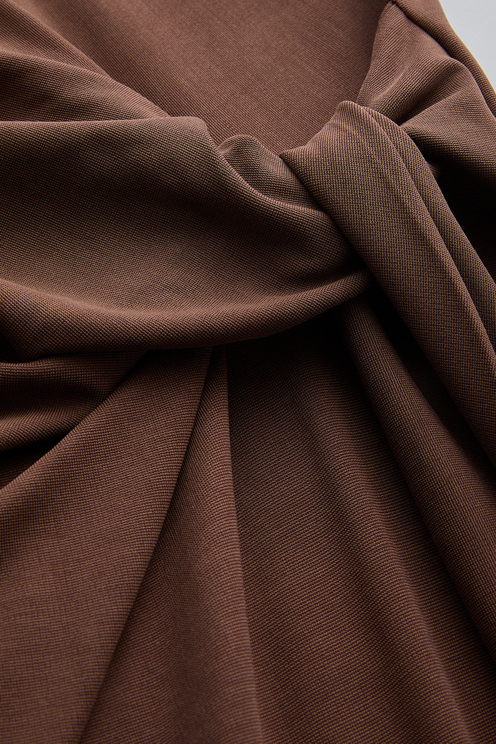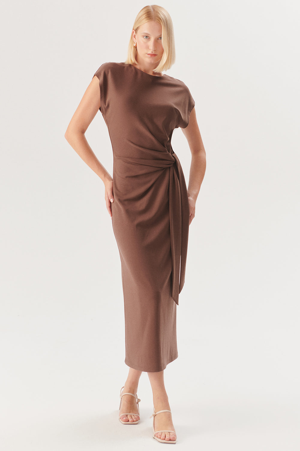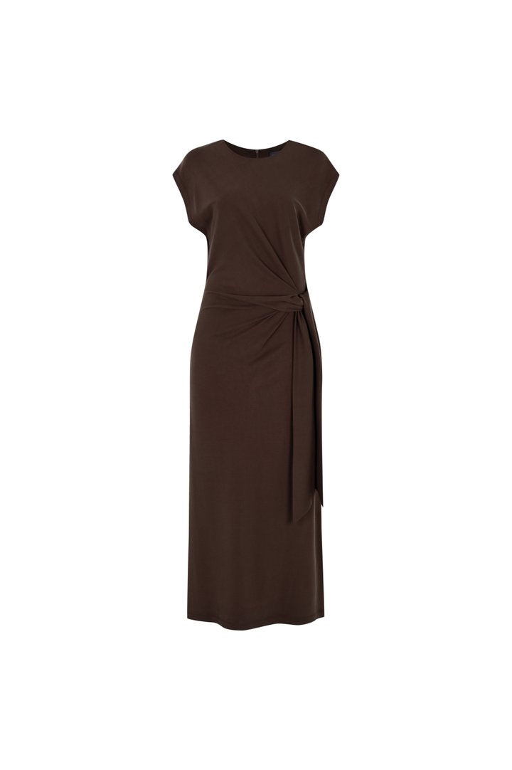 Beli Kuşaklı Vücuda Oturan Kahverengi Modal Karışımlı Midi Örme Elbise