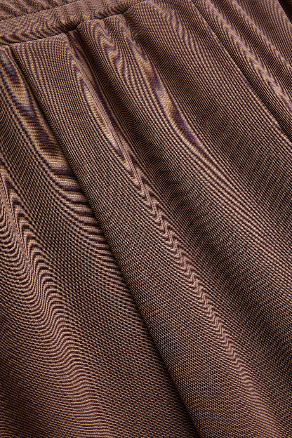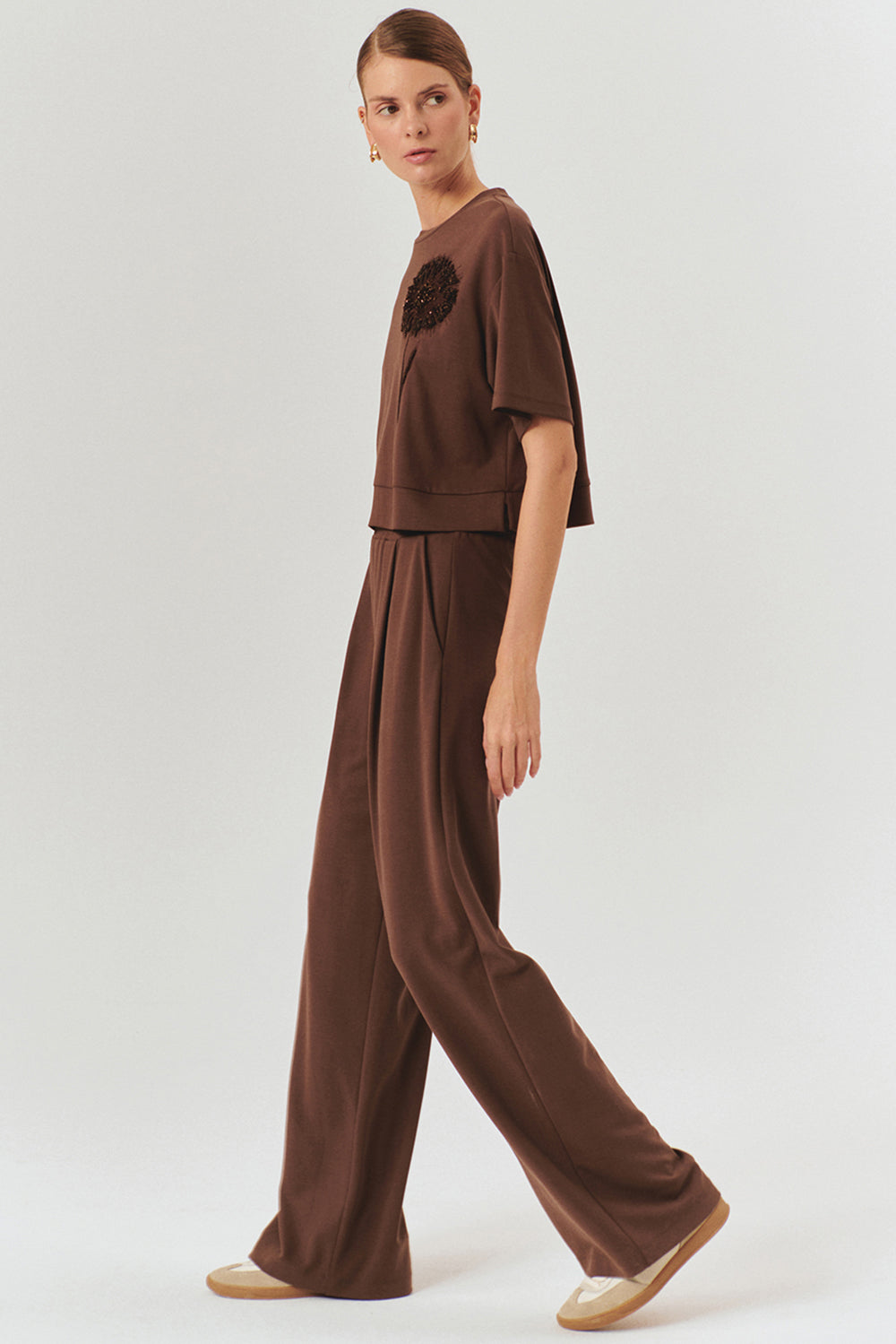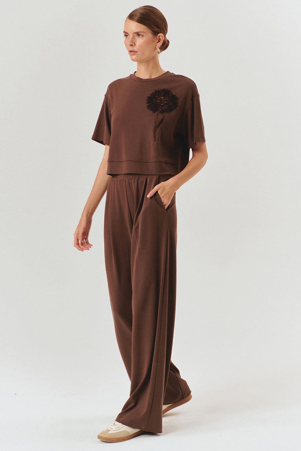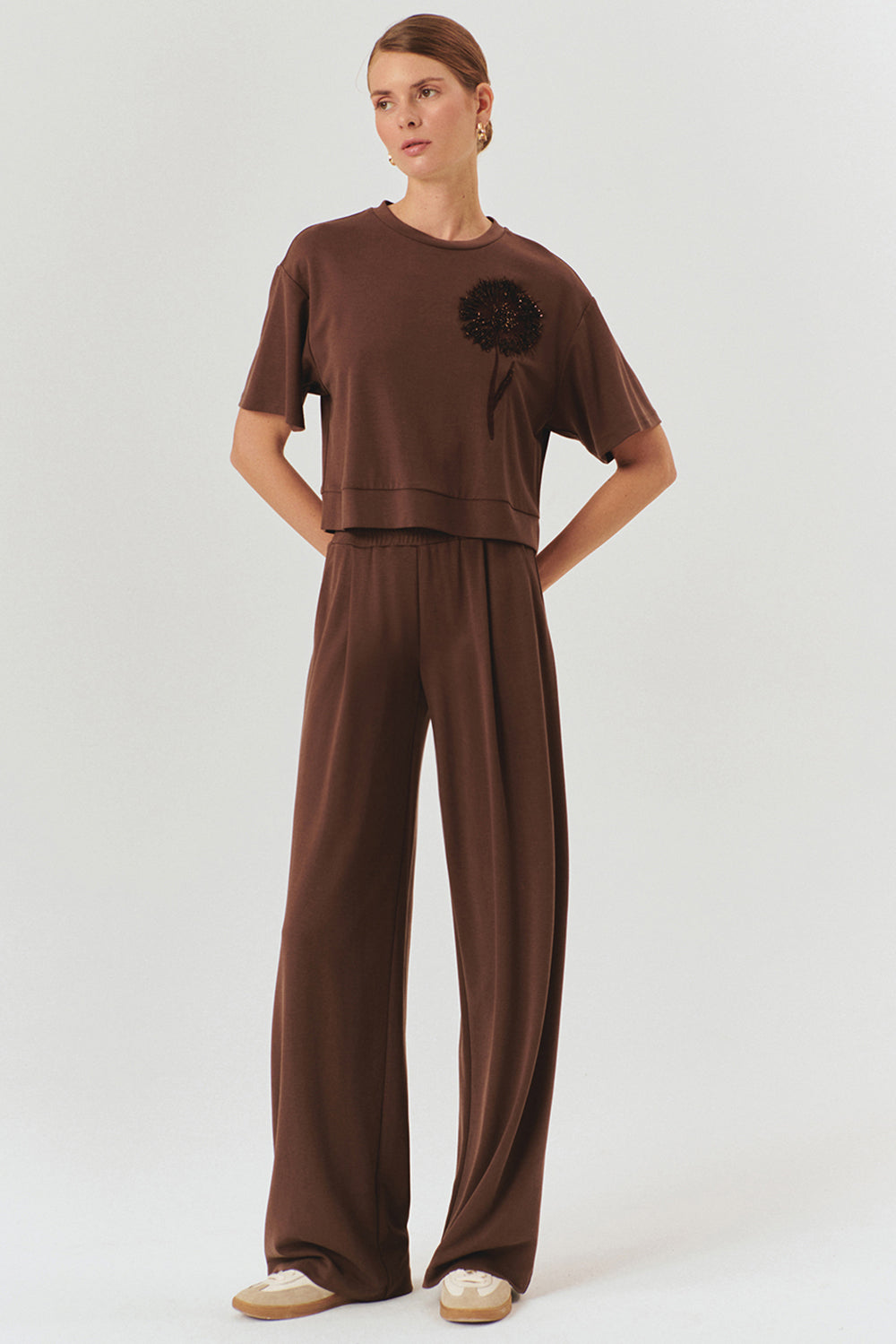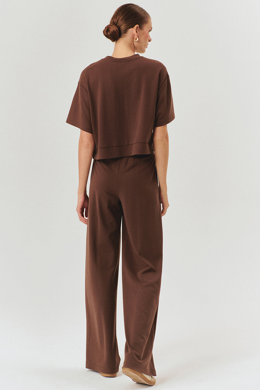 Şıklık ve rahatlığı bir arada sunan kahverengi örme pantolon, modern tasarımıyla günlük stilinize konfor katıyor. Hafif ve esnek kumaşı sayesinde hareket özgürlüğü sağlayan bu pantolon, belindeki lastik detay ile mükemmel bir uyum sunar. Yüksek belli kesimi ve geniş paça formuyla vücut hatlarını zarifçe tamamlar.