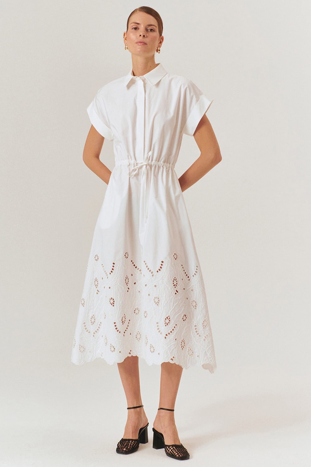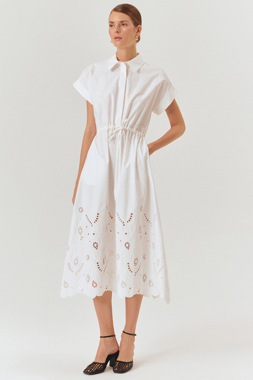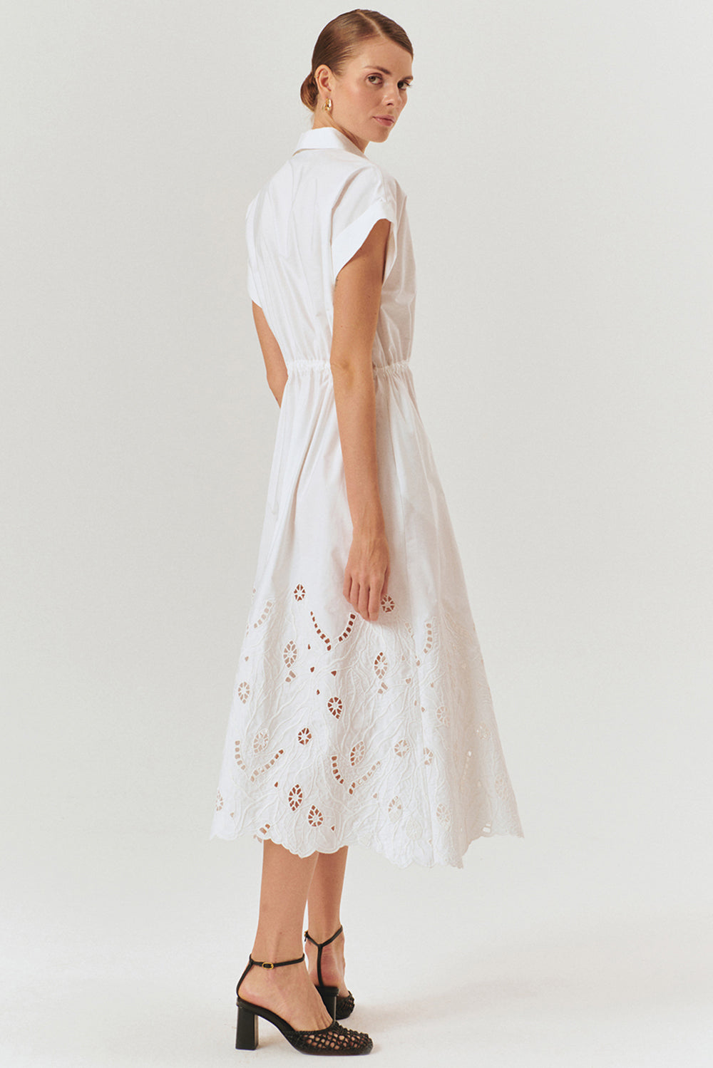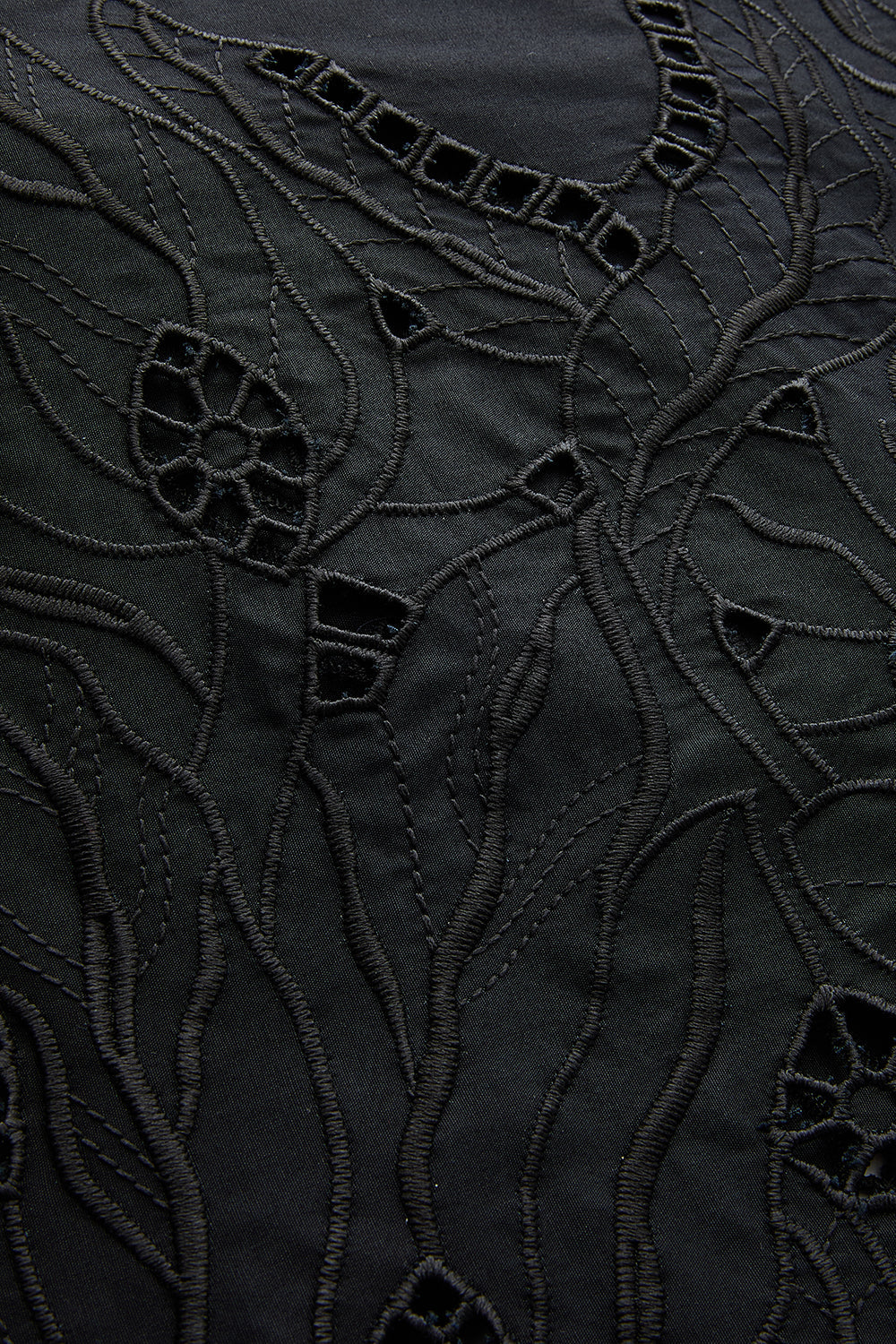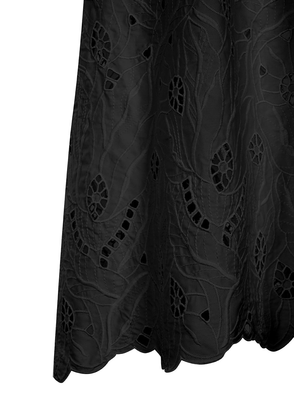 Düşük kol detayıyla modern ve rahat bir siluet sunan bu saf pamuk siyah elbise, fisko işlemeleriyle feminen bir zarafet kazanıyor. Yumuşak dokulu kumaşı gün boyu konfor sağlarken, rahat kalıbı sayesinde her adımda özgürce hareket edebilirsiniz.