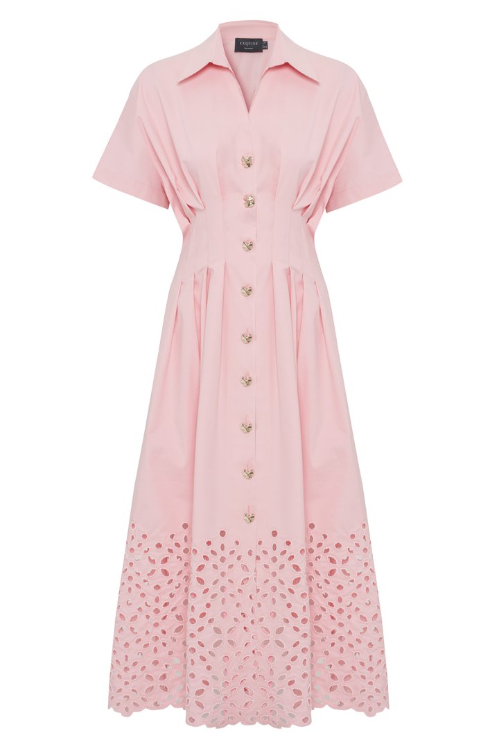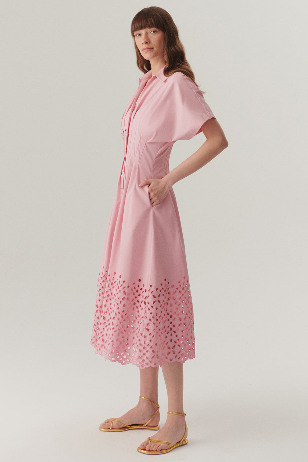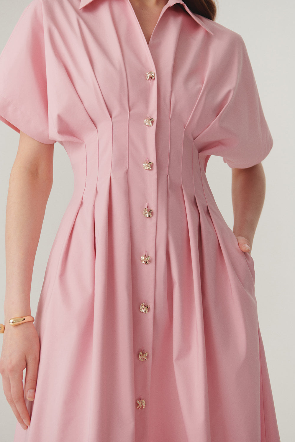 Düşük kol kesimiyle rahat bir siluet sunan ve önden düğmeli tasarımıyla modern şıklığı vurgulayan bu pembe midi elbise, feminenliğin zarafetini kusursuz şekilde yansıtıyor. Etek uçlarında yer alan fistolu detaylar, romantik bir dokunuş katarak tasarımı tamamlıyor.