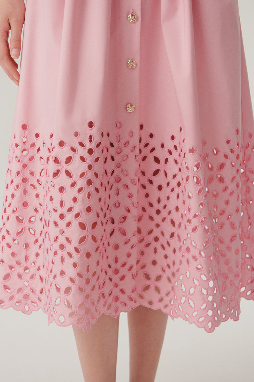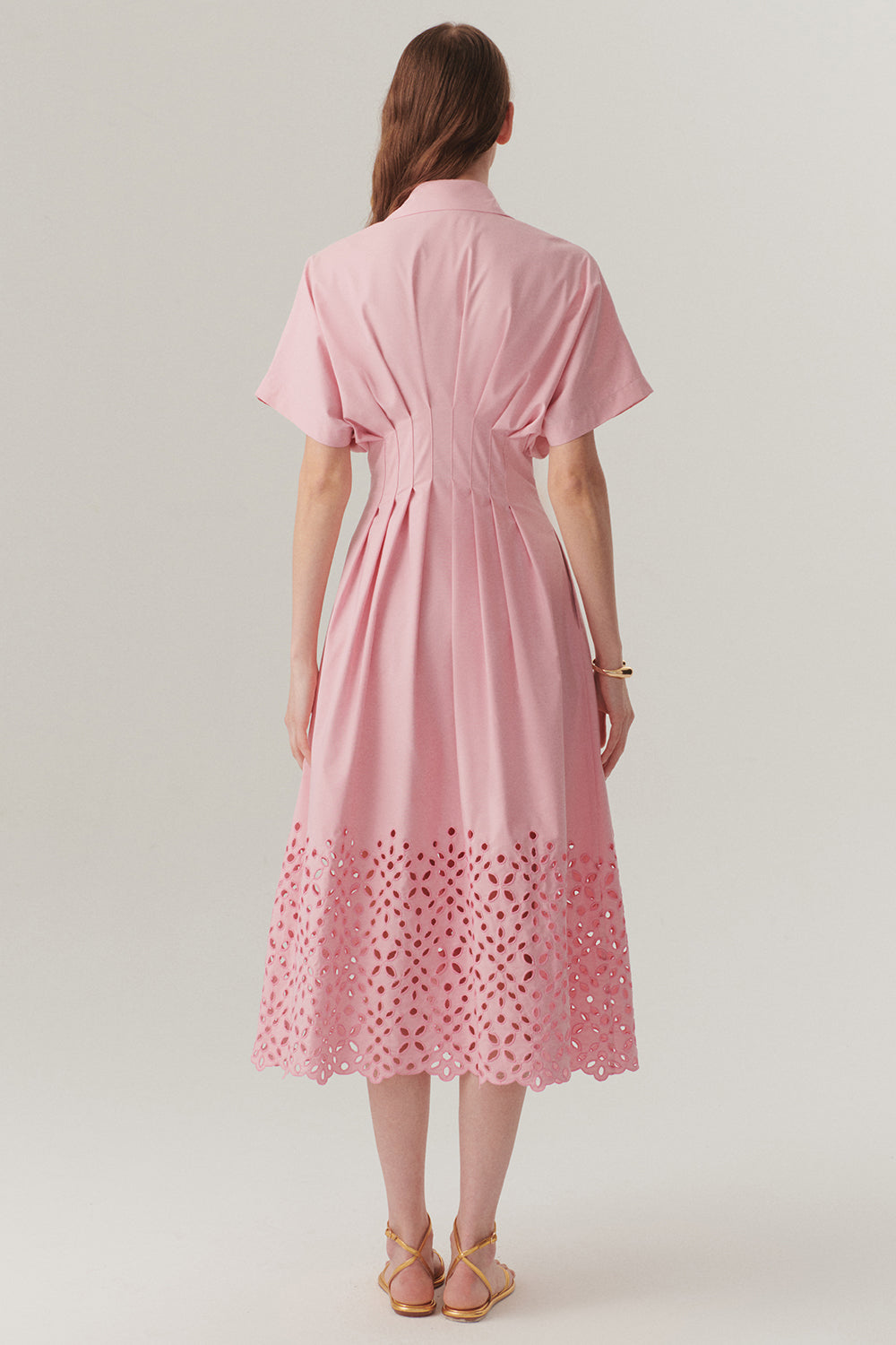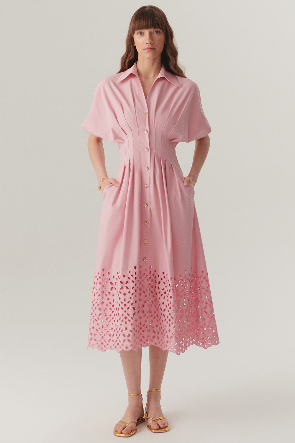 Düşük kol kesimiyle rahat bir siluet sunan ve önden düğmeli tasarımıyla modern şıklığı vurgulayan bu pembe midi elbise, feminenliğin zarafetini kusursuz şekilde yansıtıyor. Etek uçlarında yer alan fistolu detaylar, romantik bir dokunuş katarak tasarımı tamamlıyor.