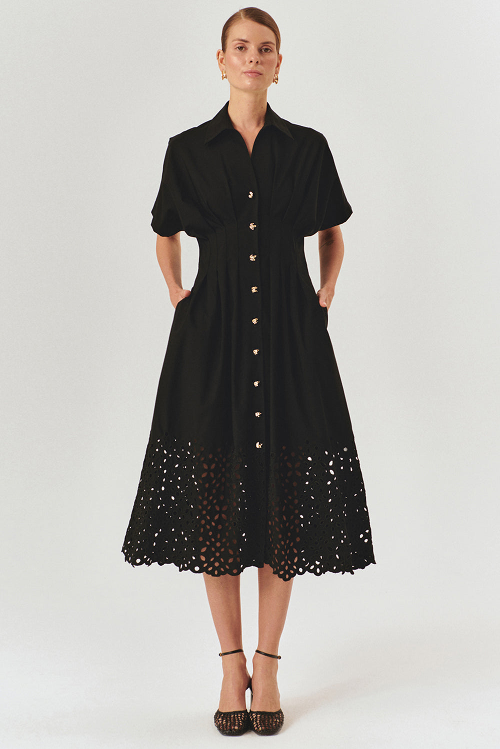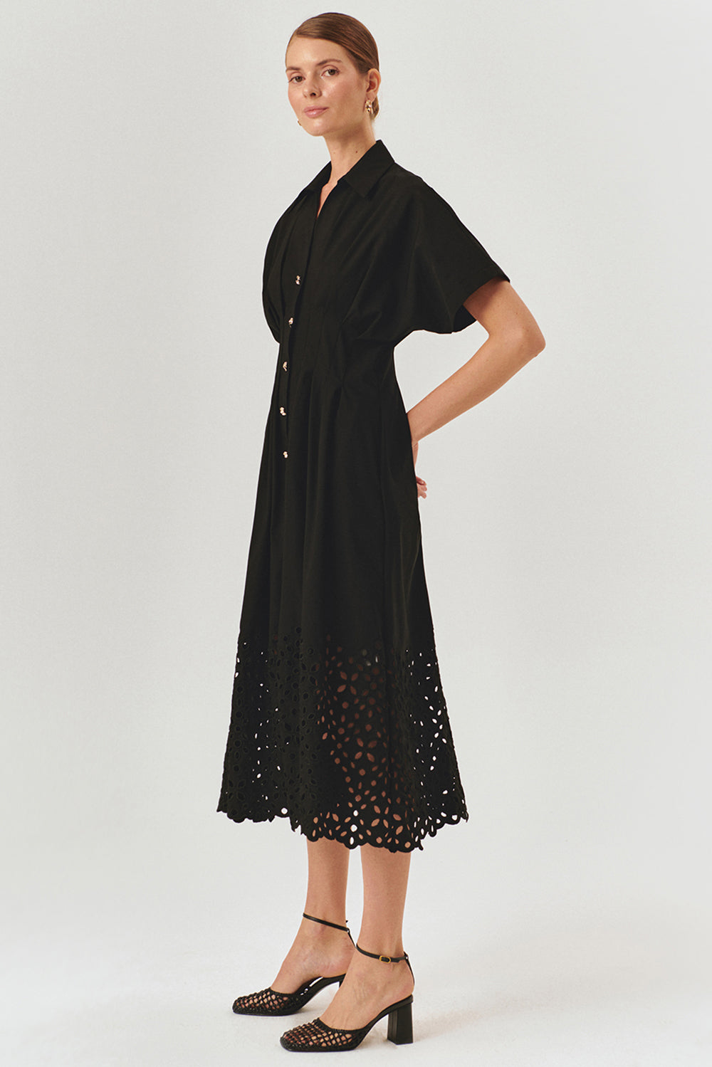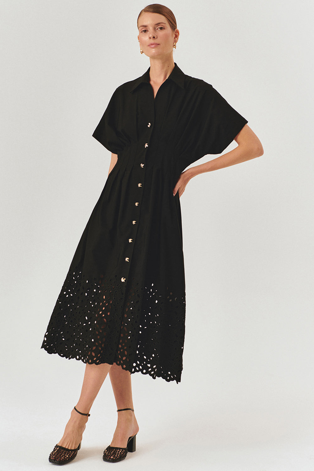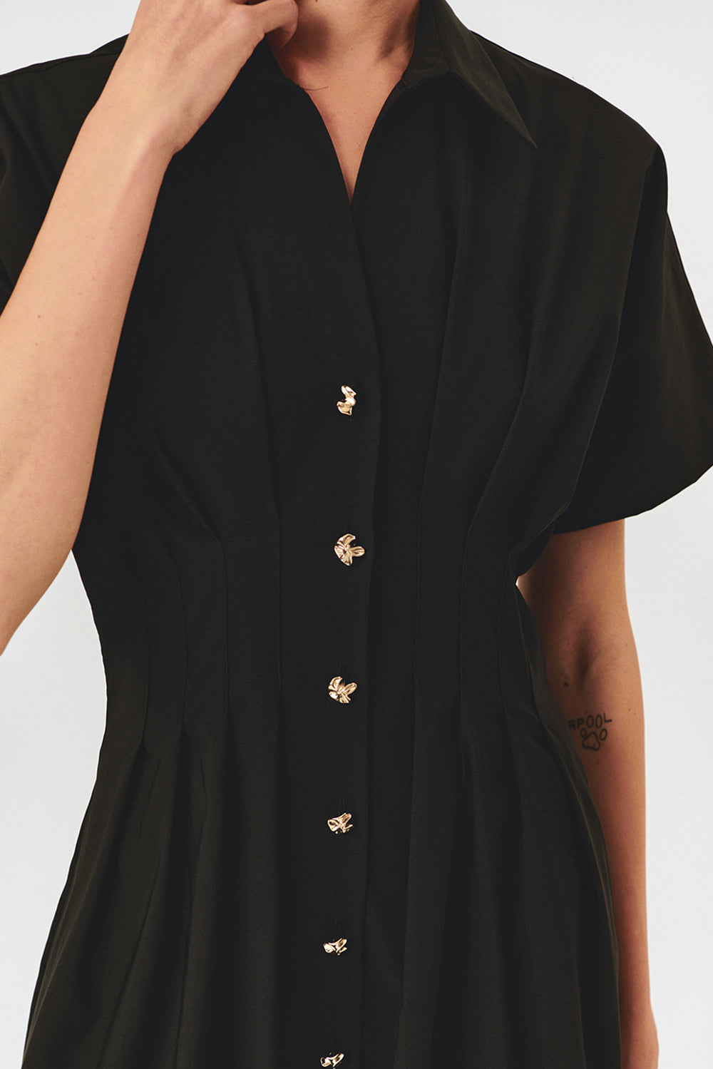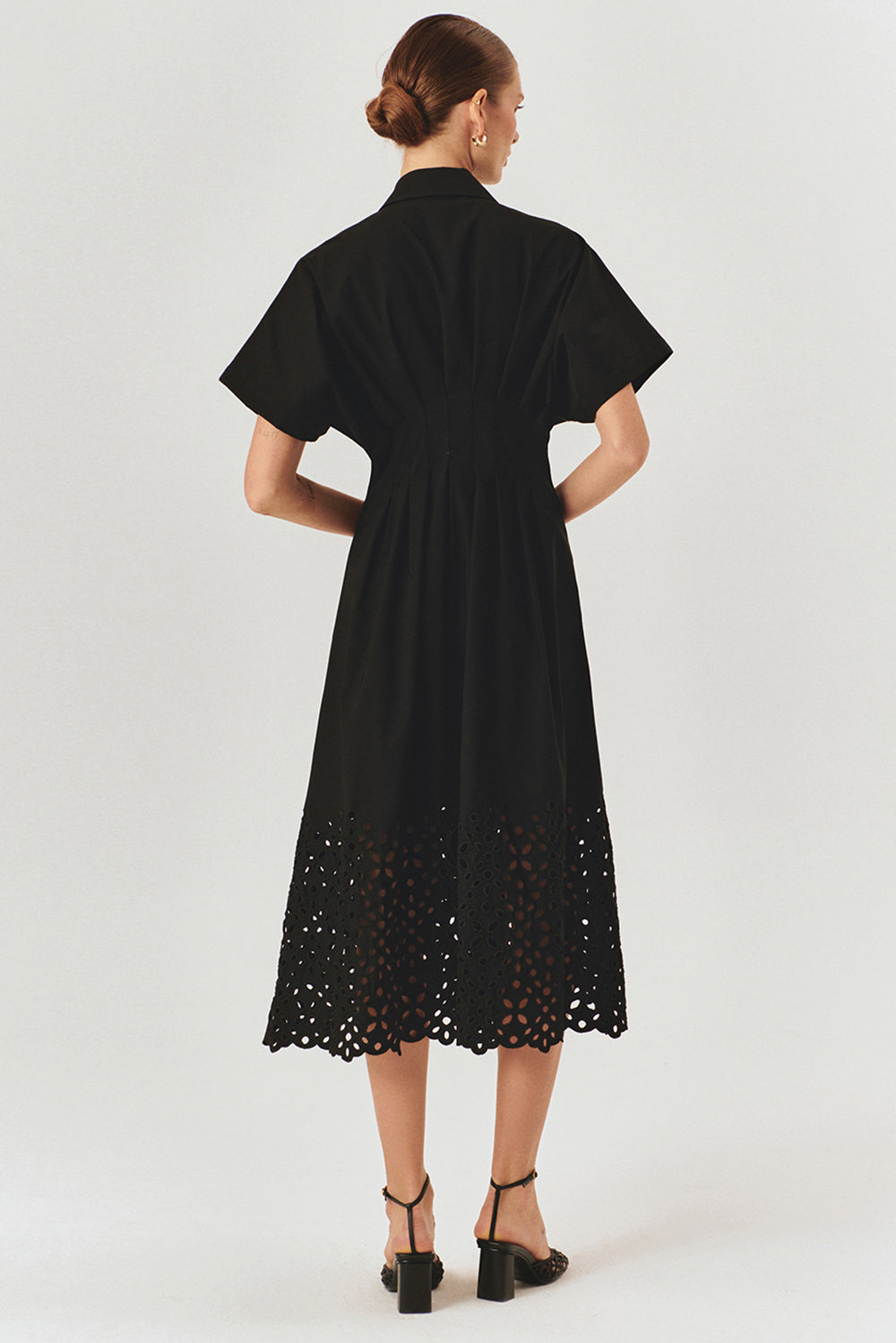 Düşük Kol Önden Düğmeli Etek Uçları Fistolu Bele Oturan Midi Boy Gömlek Elbise