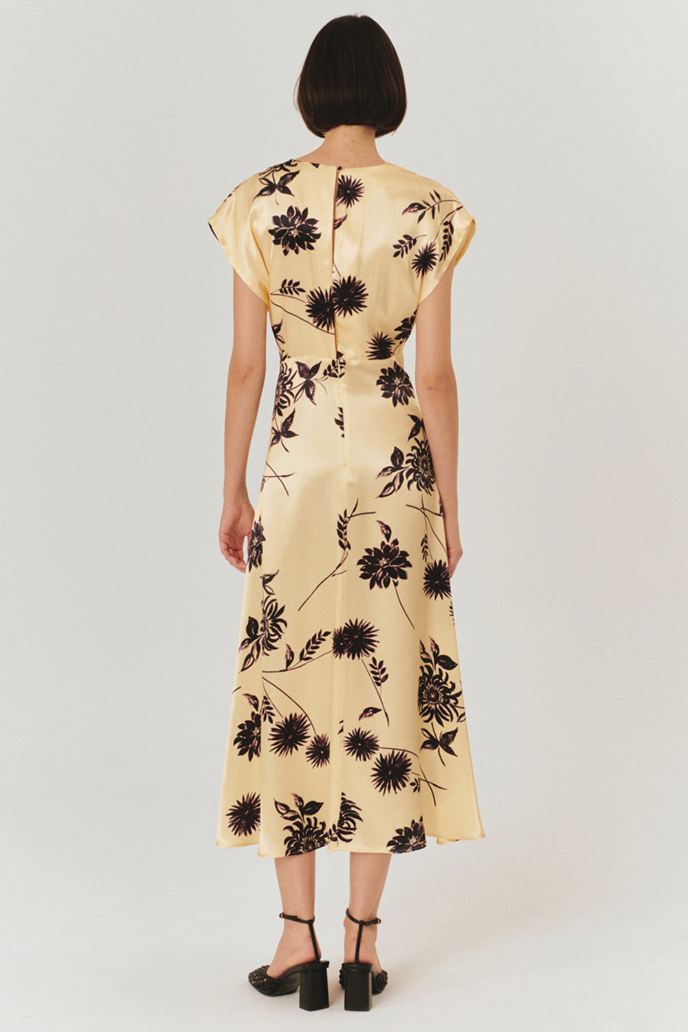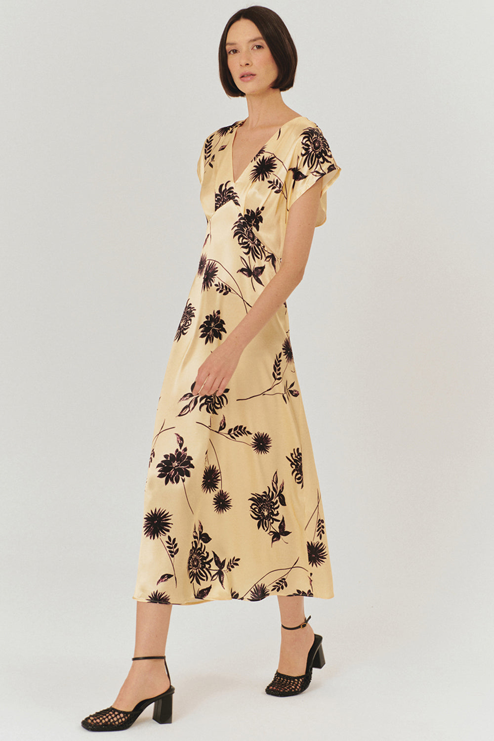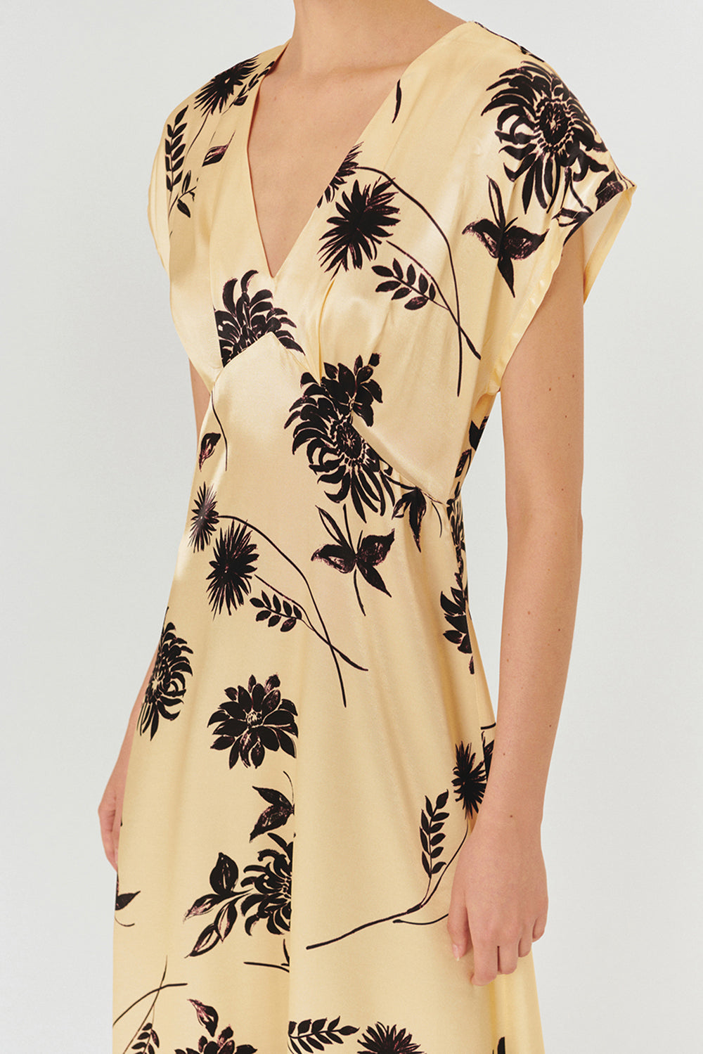 Düşük Kol V Yaka Çiçek İŞlemeli Floş Kumaş Elbise