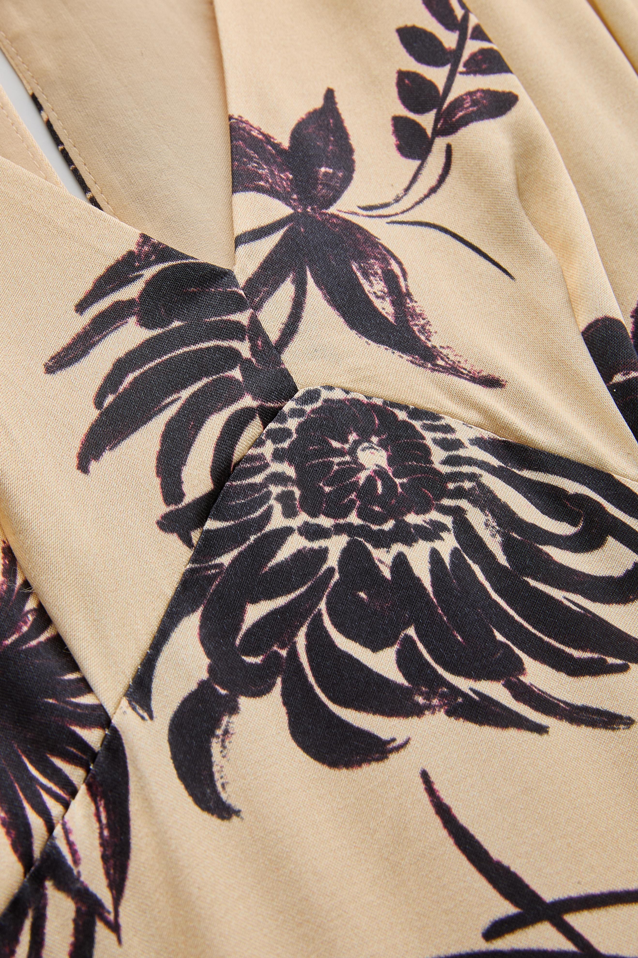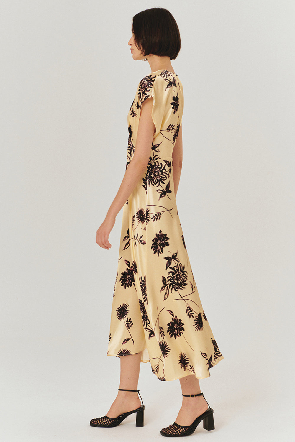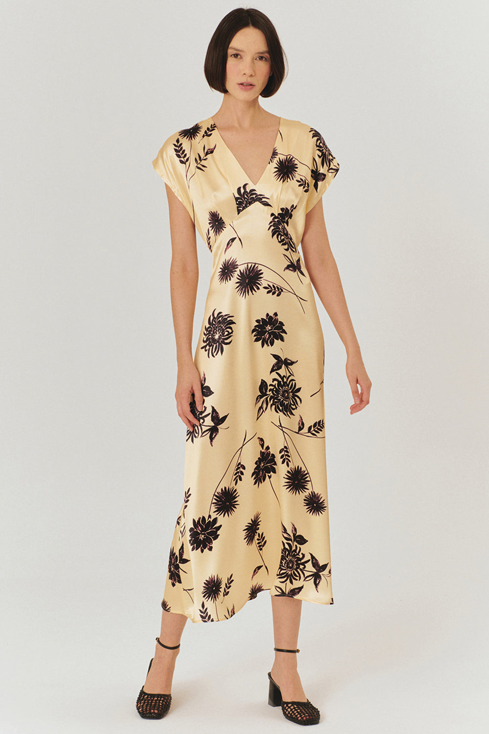 Düşük Kol V Yaka Çiçek İŞlemeli Floş Kumaş Elbise